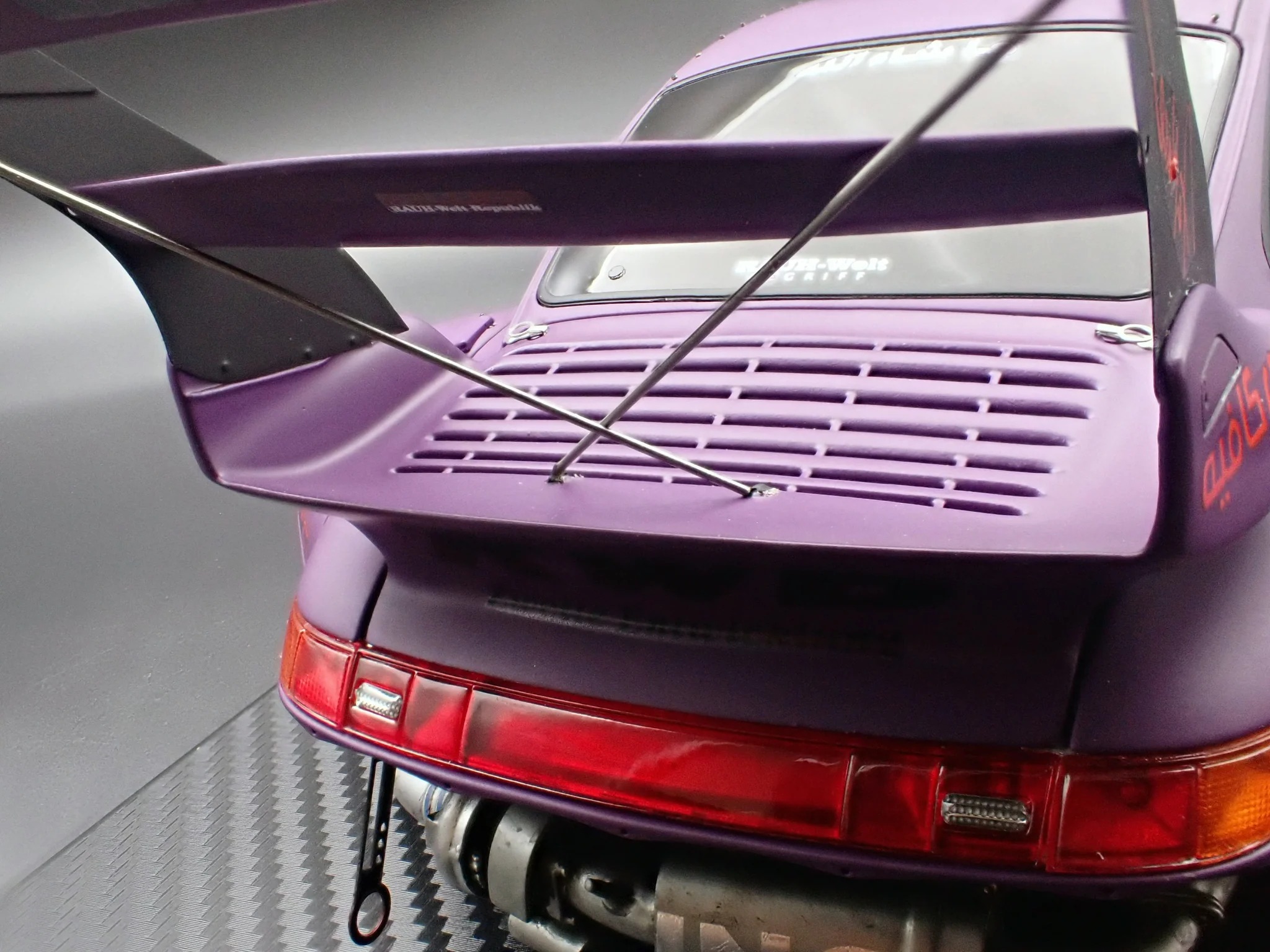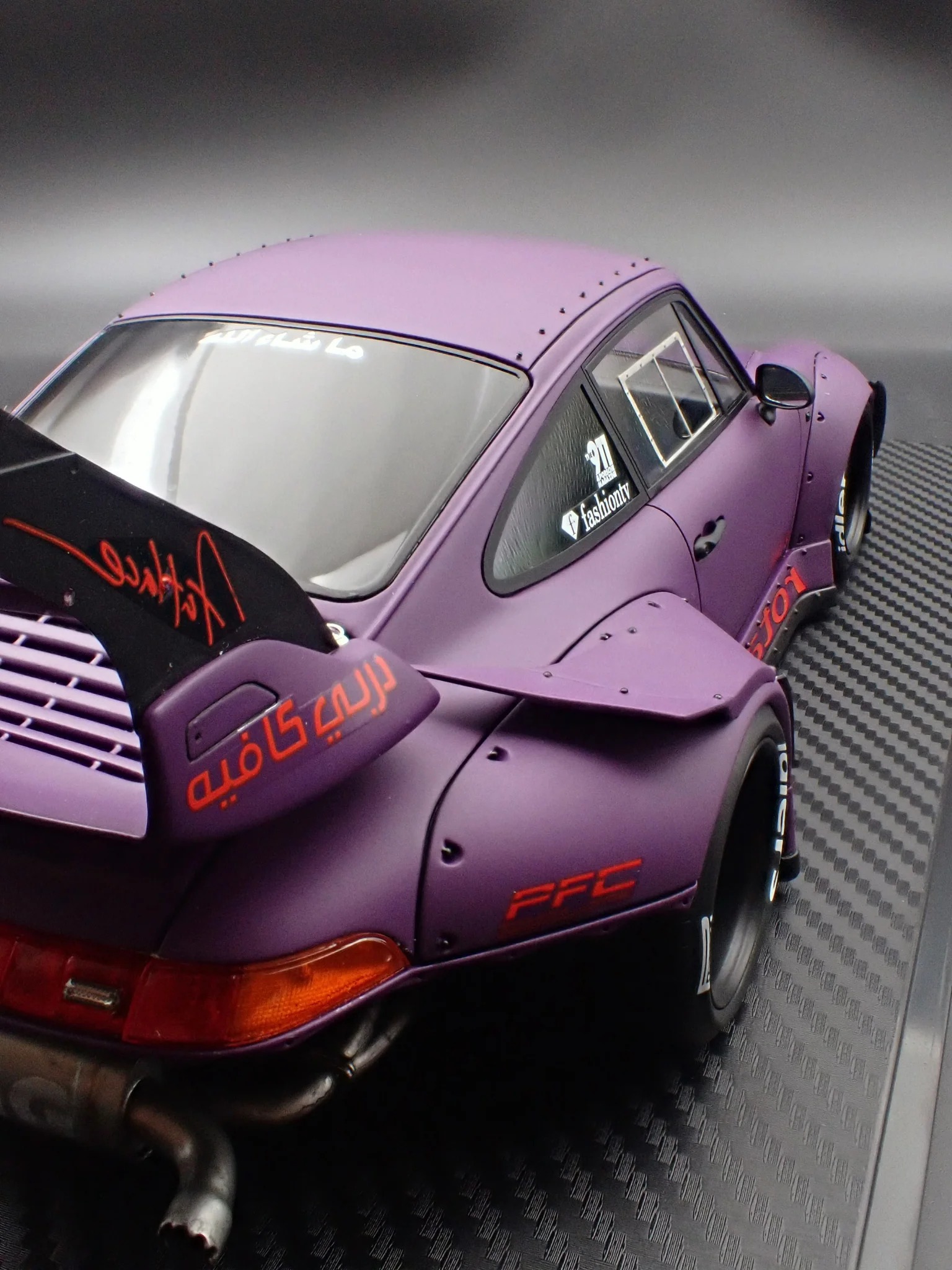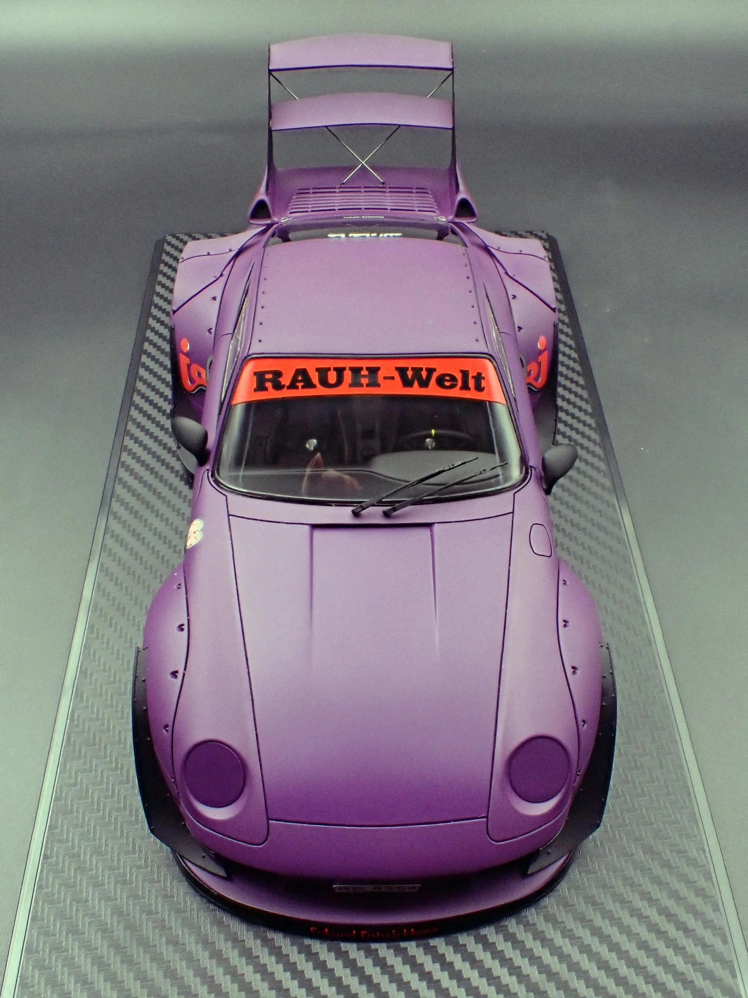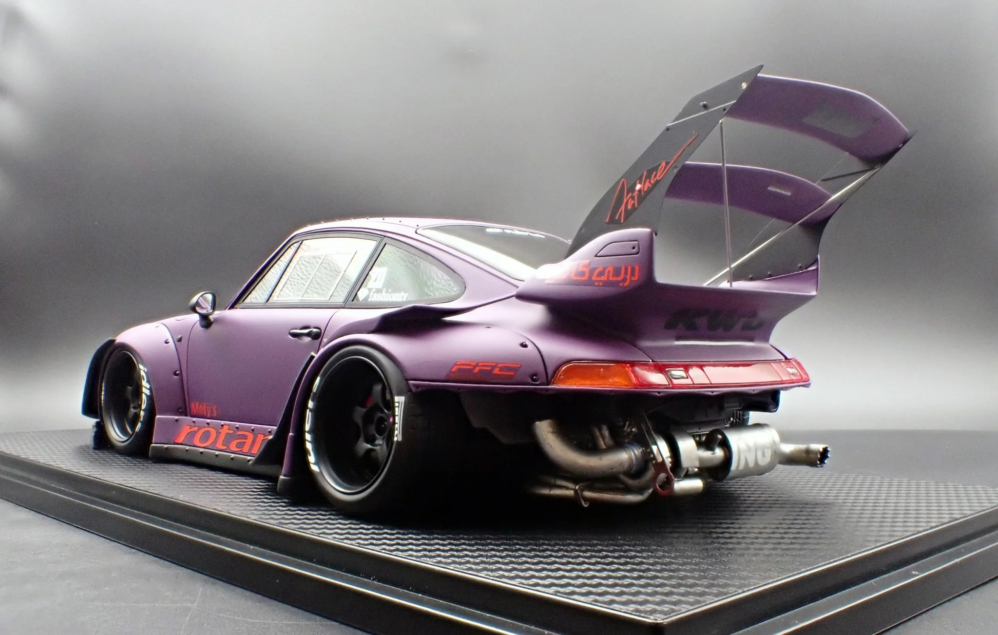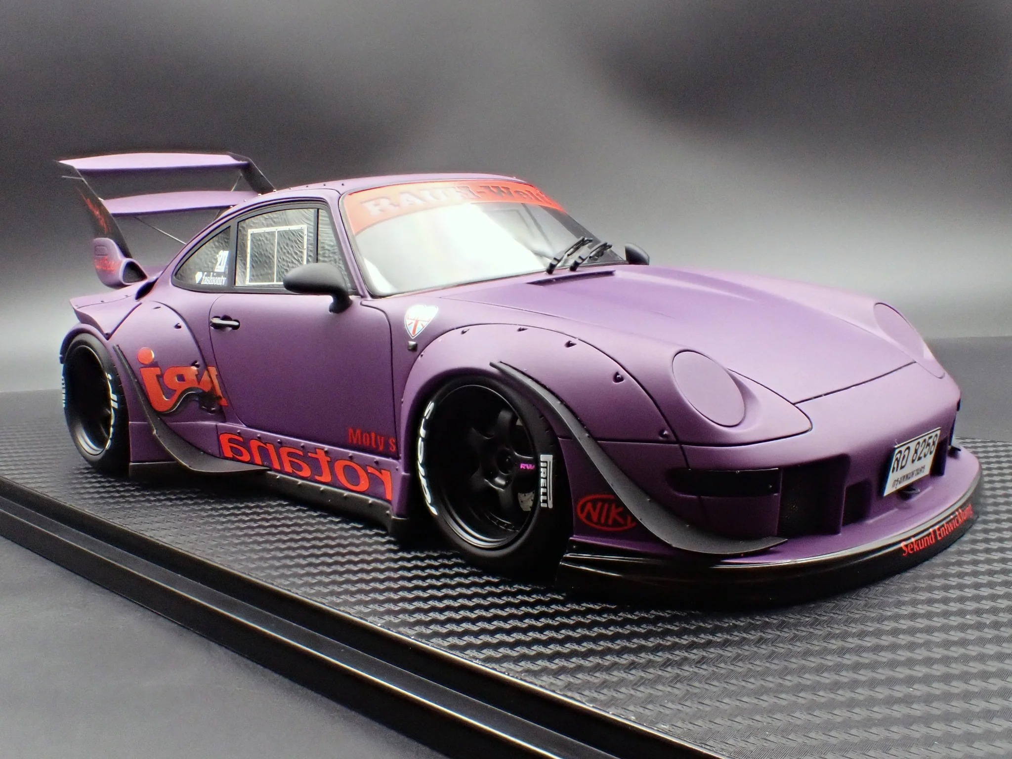 Produced by Ignition Model, the IG4035 reproduces the RWB 993 in 1/18 scale using resin construction. The exterior is finished in matte purple and sits on WORK S1-style 18-inch wheels in black, paired with a lowered stance that reinforces its track-oriented intent. This version adopts a rear-bumperless layout and a headlightless front, with the headlights embedded directly into the front bumper for a distinctly motorsport-driven appearance.