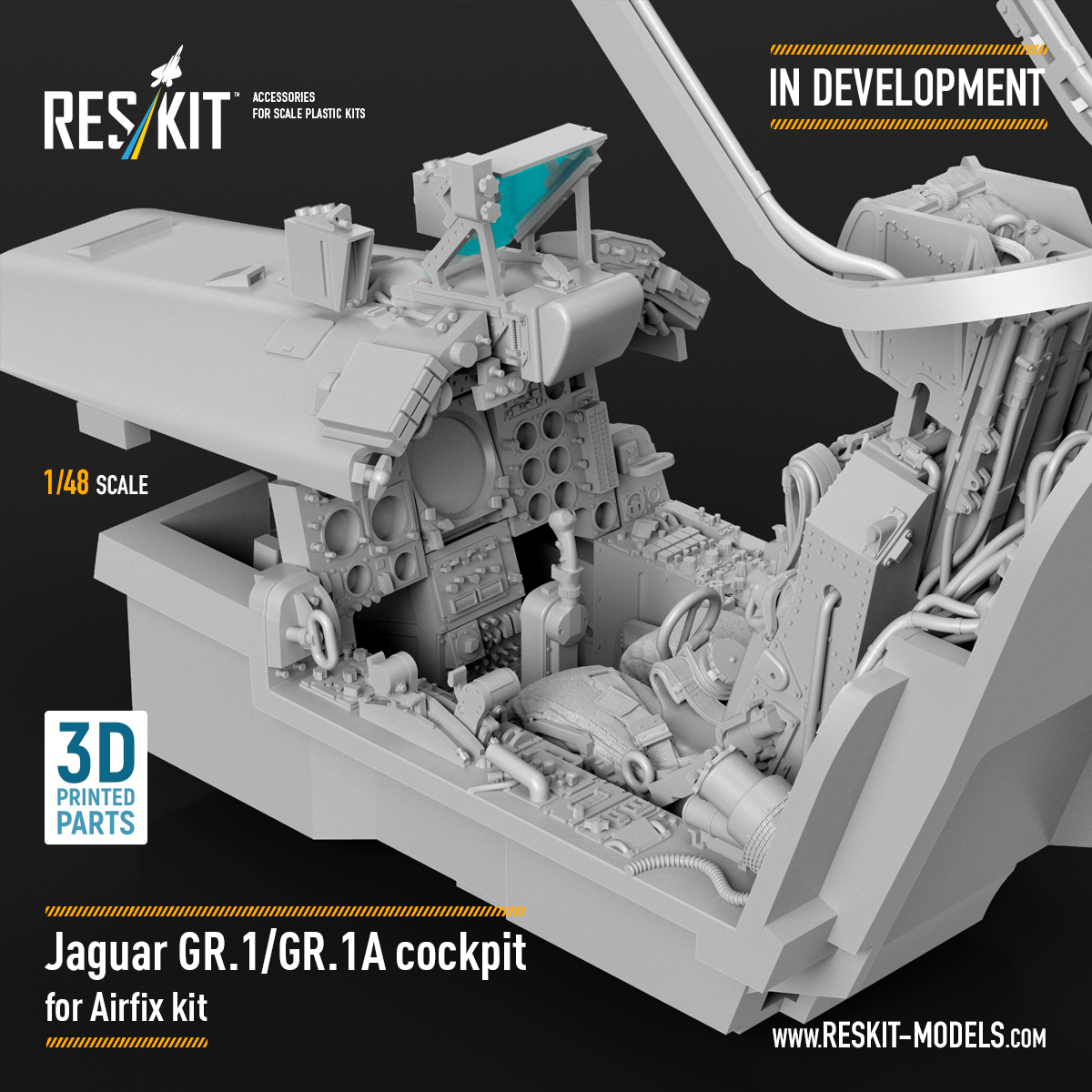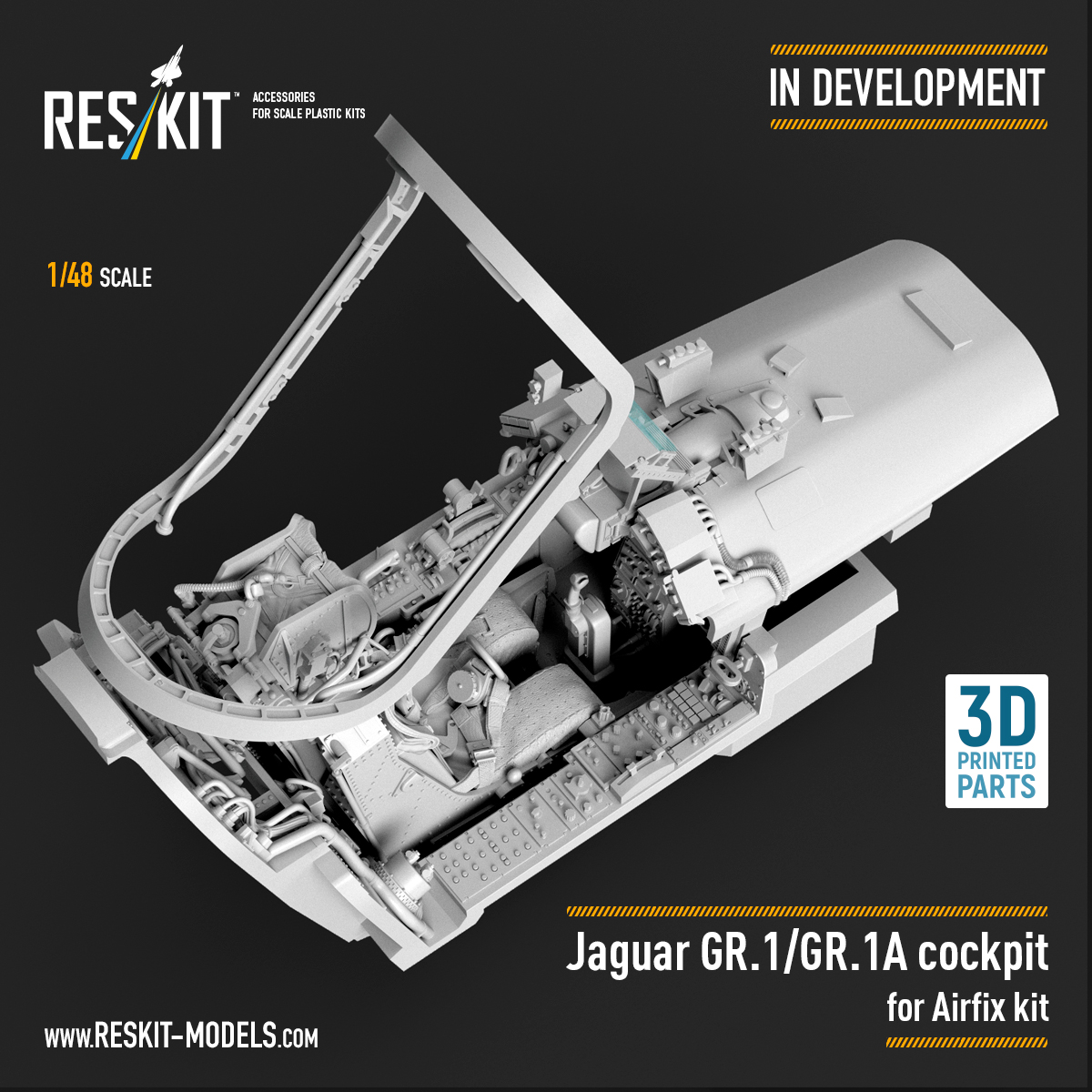 ResKit is preparing a 1/48 scale cockpit replacement for the Jaguar GR.1 and GR.1A, using 3D printing to address the limitations of injection-moulded parts. The set is being developed specifically for the classic Airfix kit, with the goal of transforming the cockpit into a more detailed and visually accurate focal point.