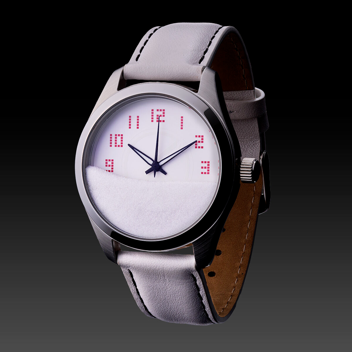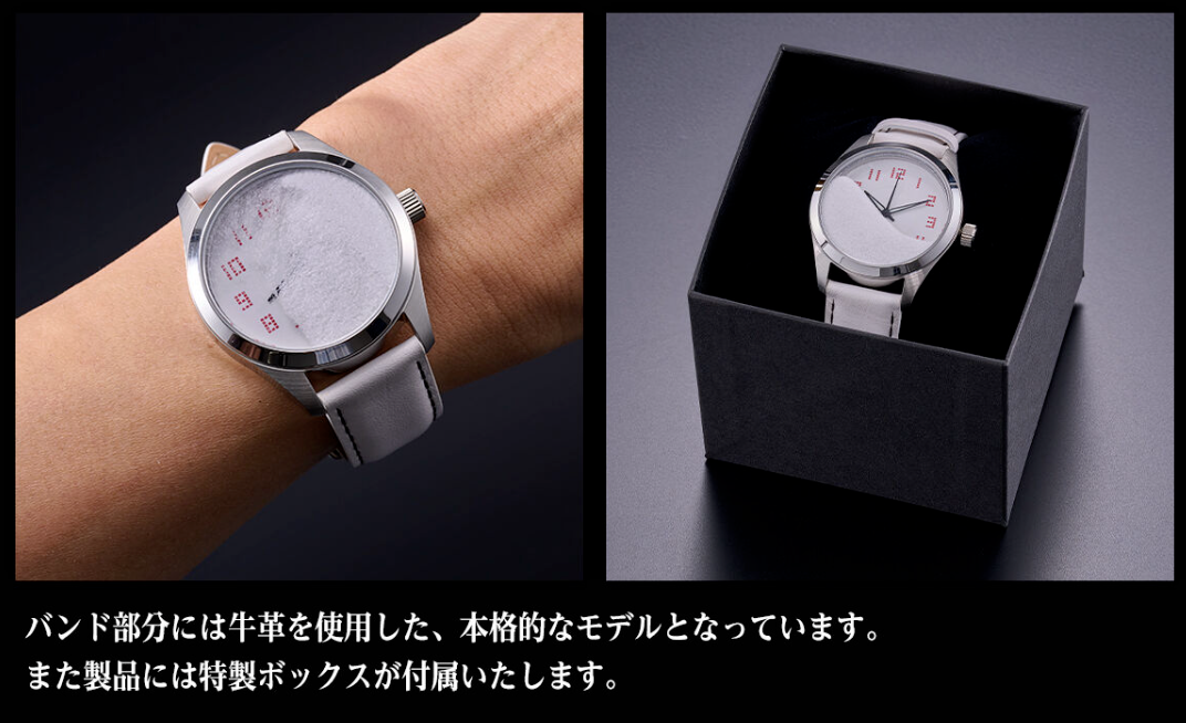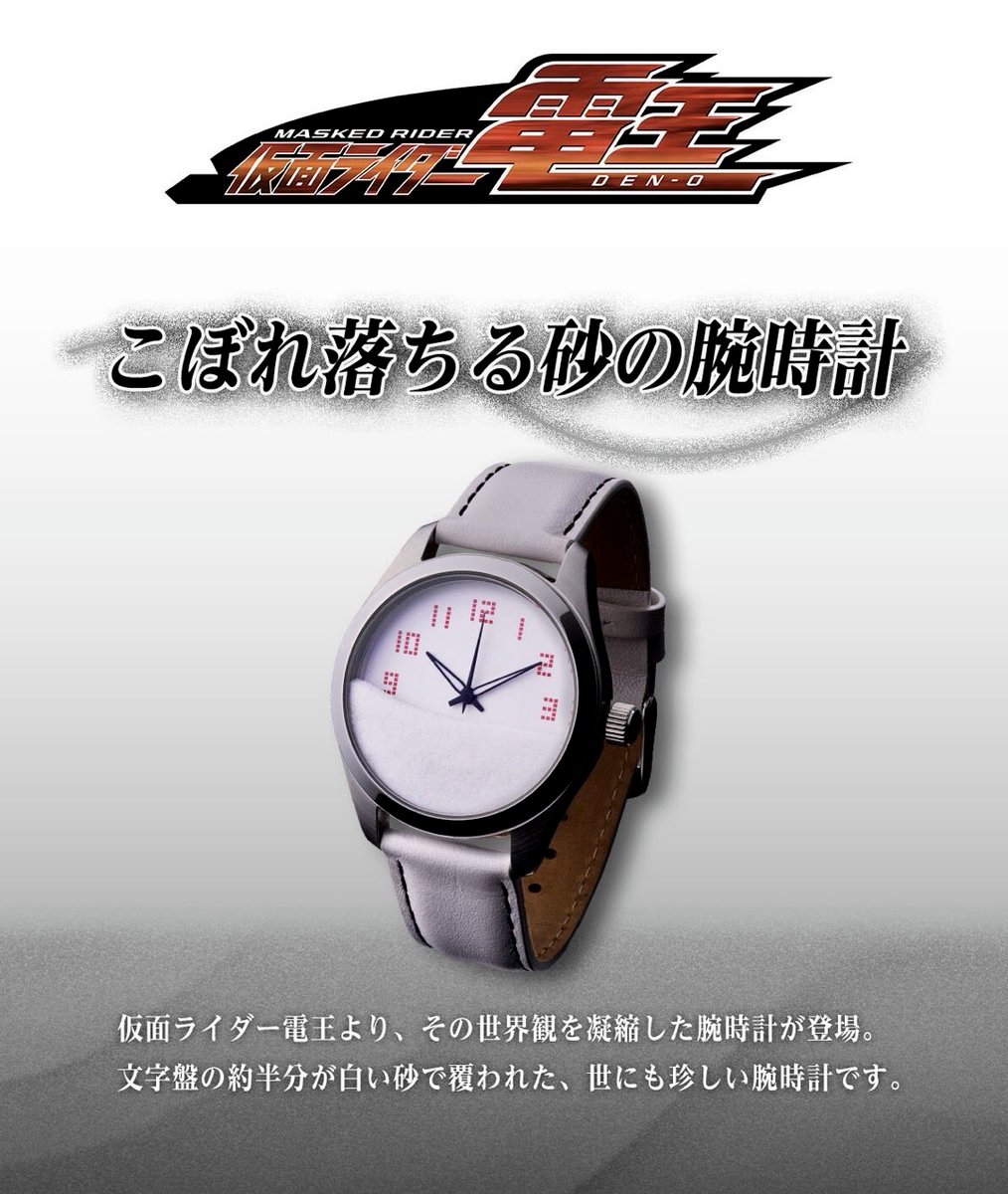 The design incorporates the concept of flowing sand to symbolise the passage of time — a central motif in Kamen Rider Den-O, which focuses on time travel and the DenLiner train. The watch face is partially filled with white sand, creating the visual effect of time slipping away, while also referencing the show’s temporal themes.