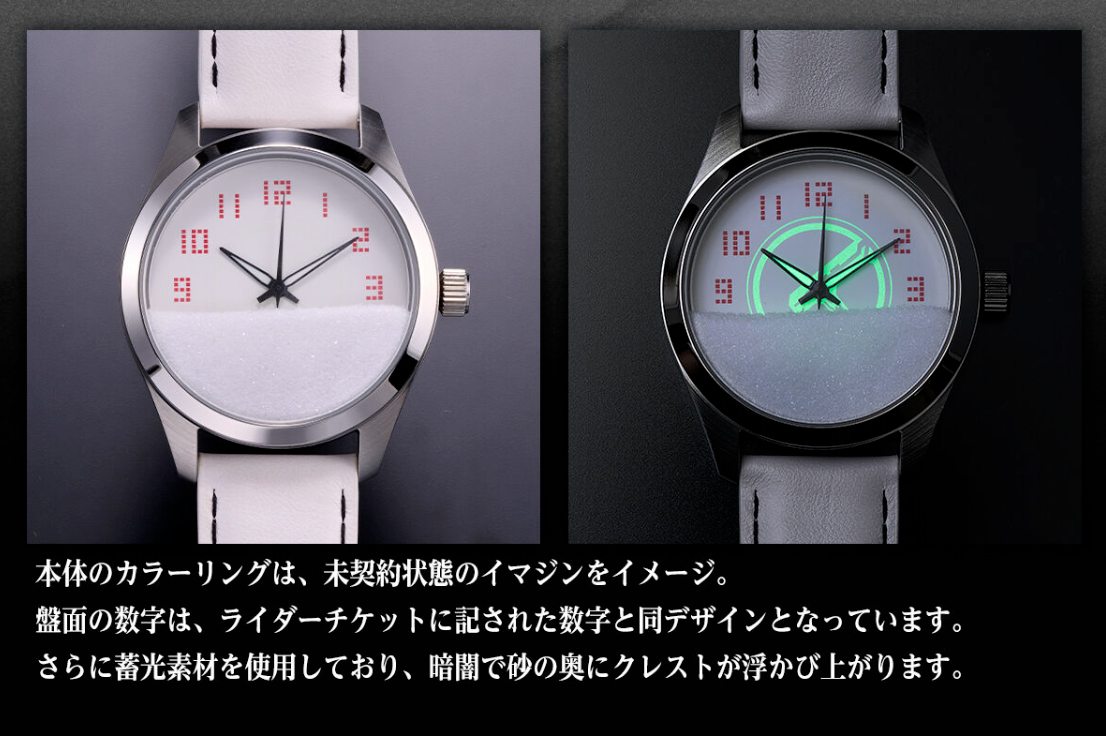Its colour scheme is based on the “Uncontracted Imagin” form, with dial numerals inspired by the Rider Tickets featured in the series. The phosphorescent dial reveals the Kamen Rider emblem glowing beneath the sand layer when viewed in low light.
