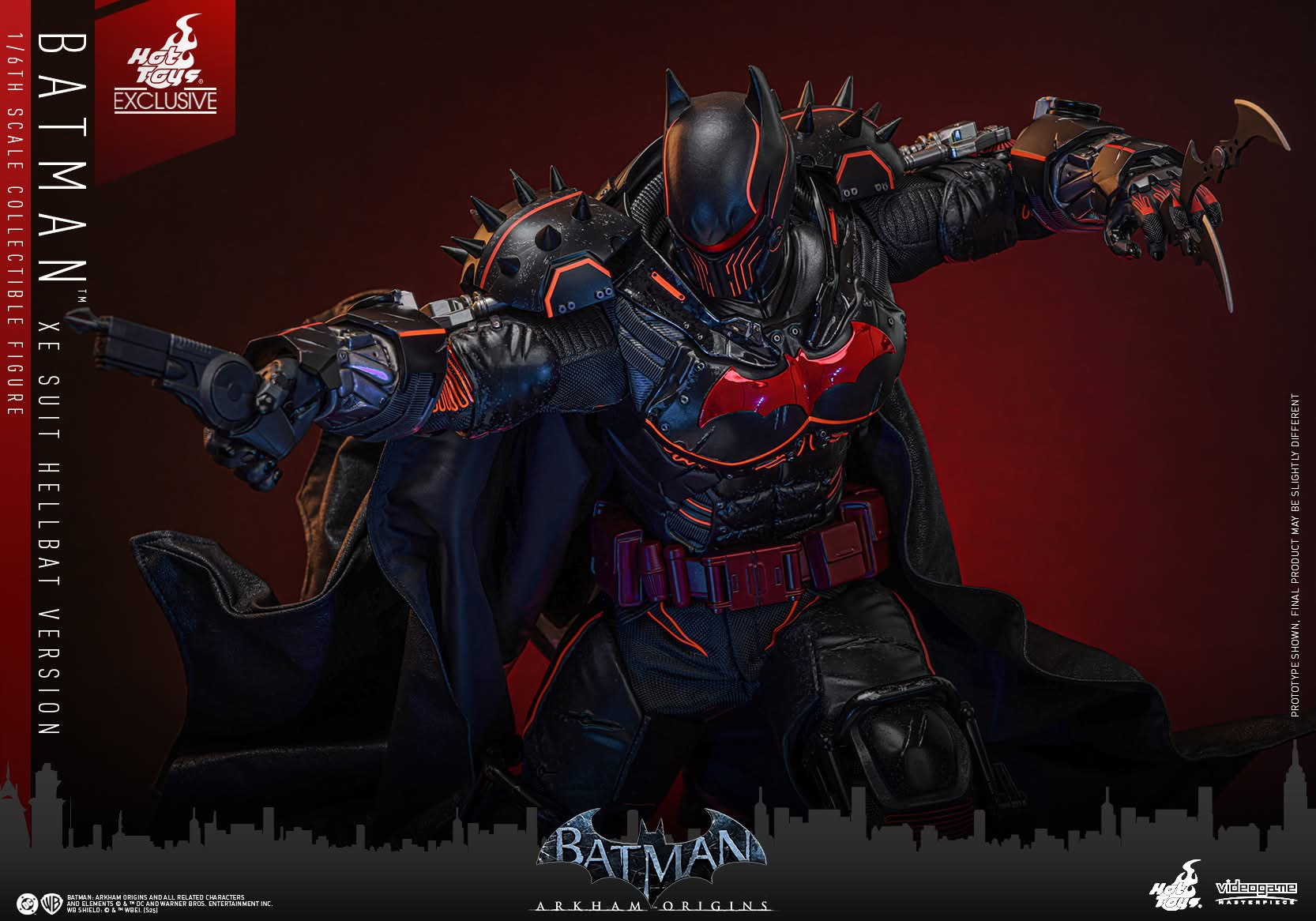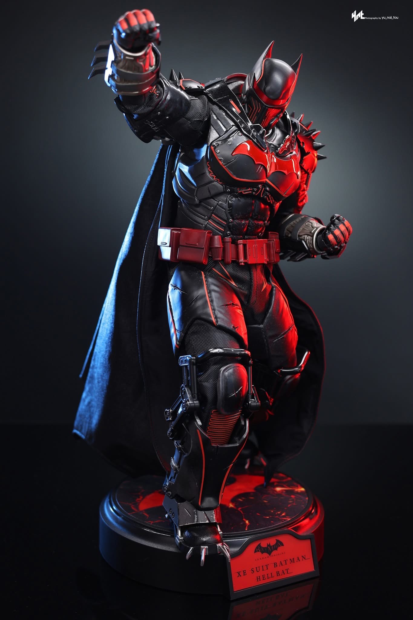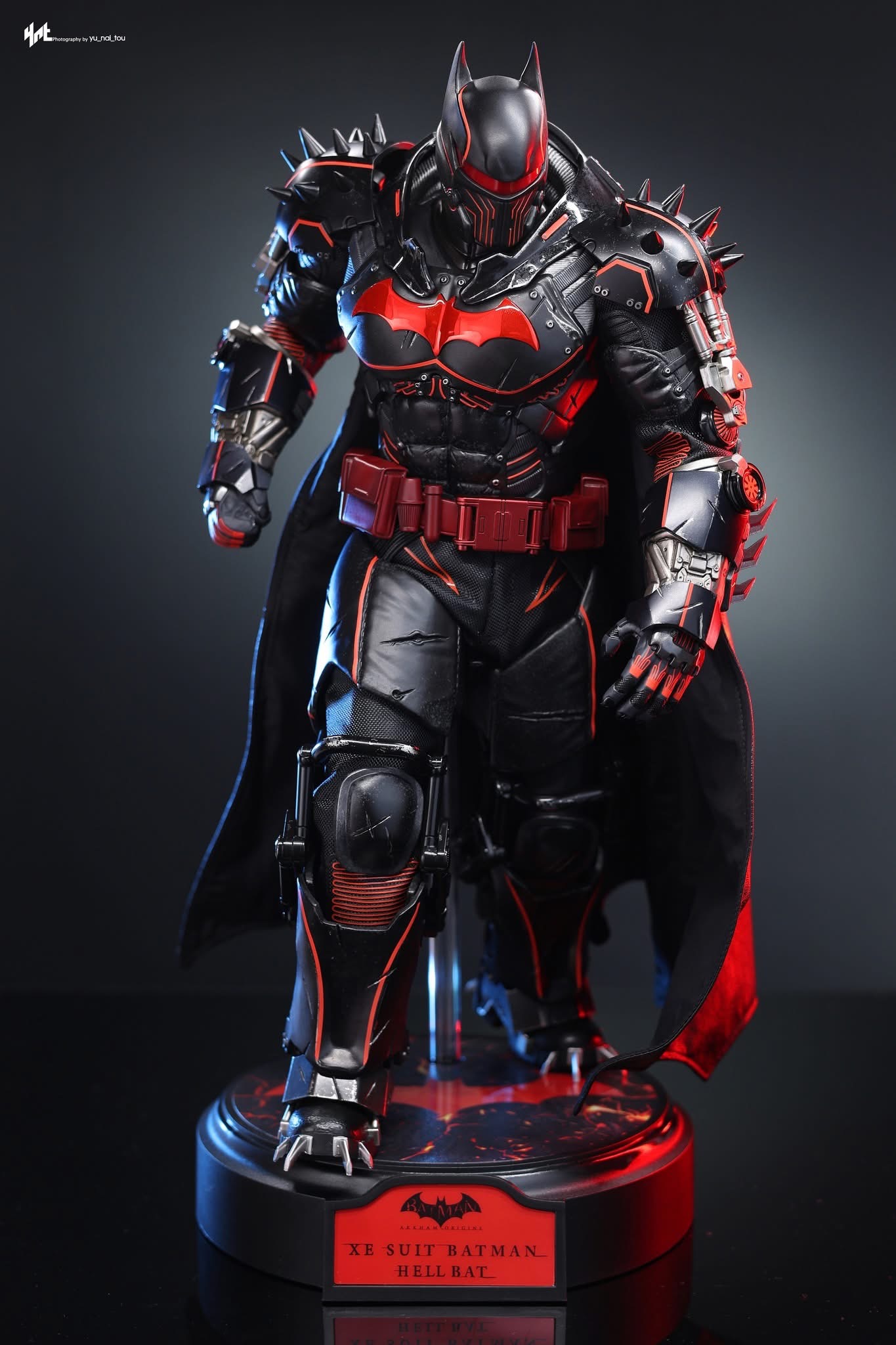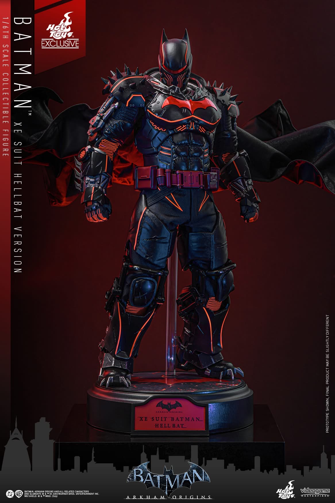 Standing 33 cm tall, the figure features a newly developed Hellbat-inspired helmeted head and a muscular body with 30 points of articulation. The heavily armoured suit merges the XE Suit’s resilience with Hellbat styling, including an electroplated red Bat-symbol, red-lined detailing with UV luminous reflective effects, and weathering to capture a battle-worn appearance. A wire-embedded black cape and a bold red utility belt complete the look.