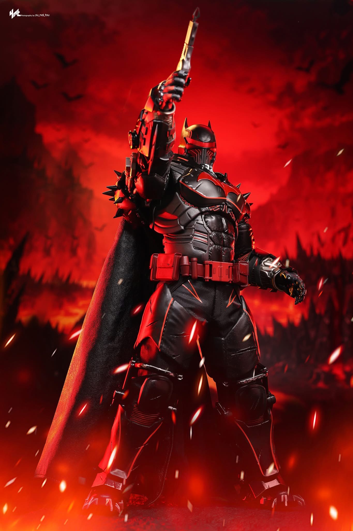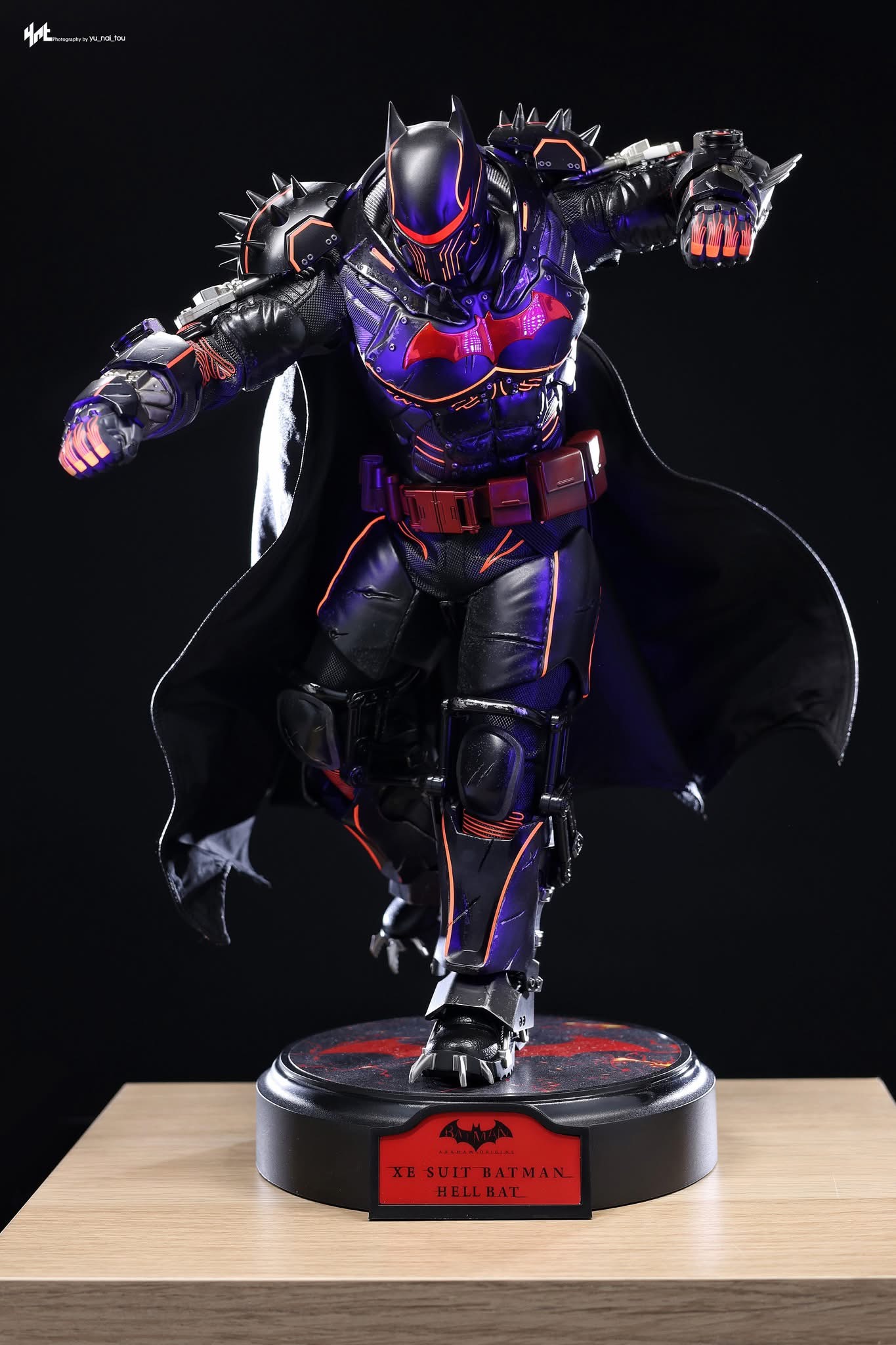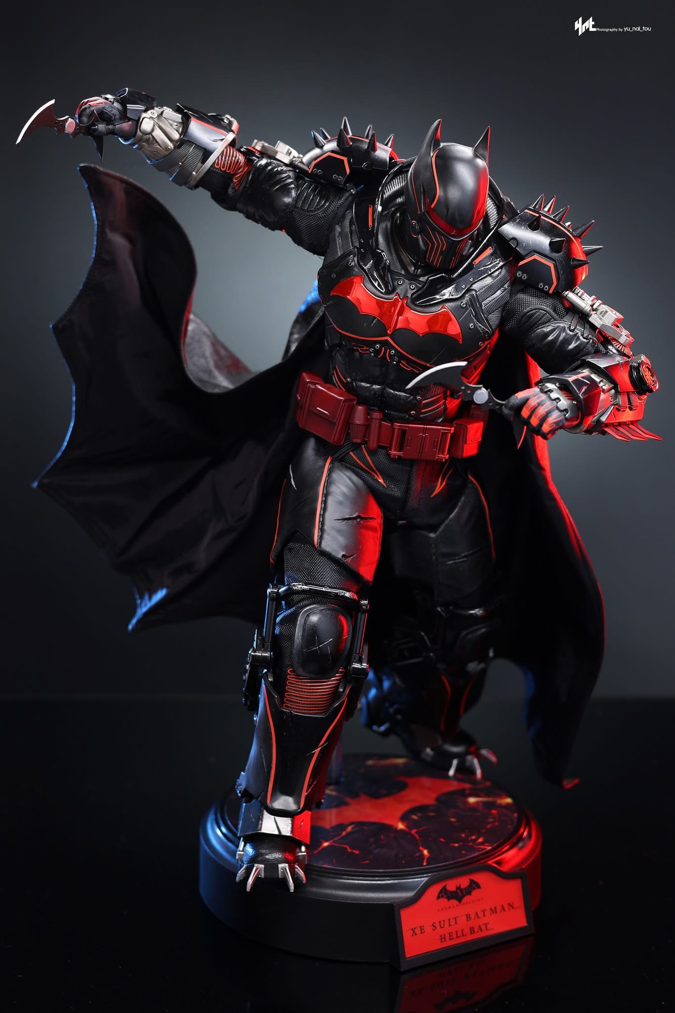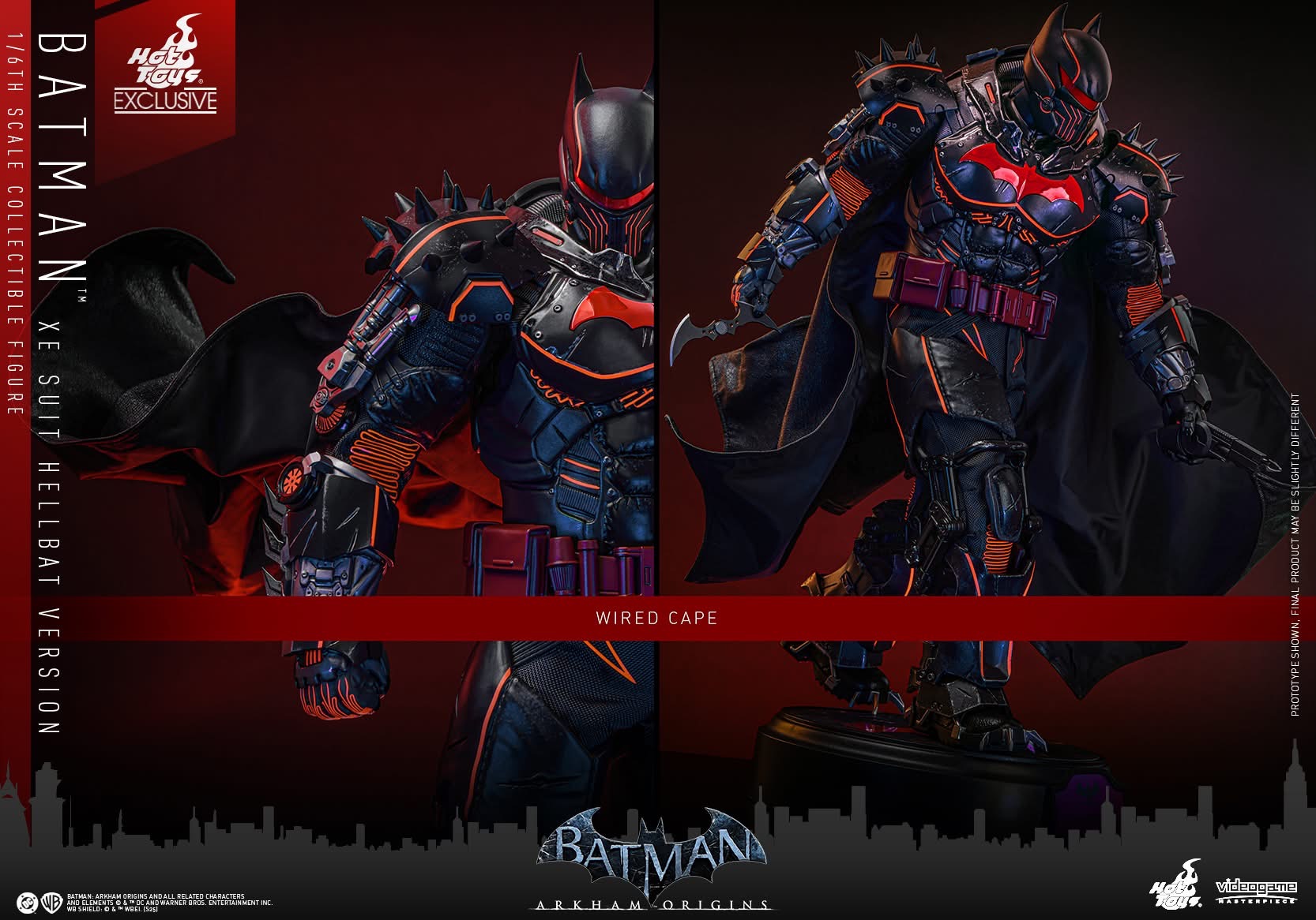 Standing 33 cm tall, the figure features a newly developed Hellbat-inspired helmeted head and a muscular body with 30 points of articulation. The heavily armoured suit merges the XE Suit’s resilience with Hellbat styling, including an electroplated red Bat-symbol, red-lined detailing with UV luminous reflective effects, and weathering to capture a battle-worn appearance. A wire-embedded black cape and a bold red utility belt complete the look.