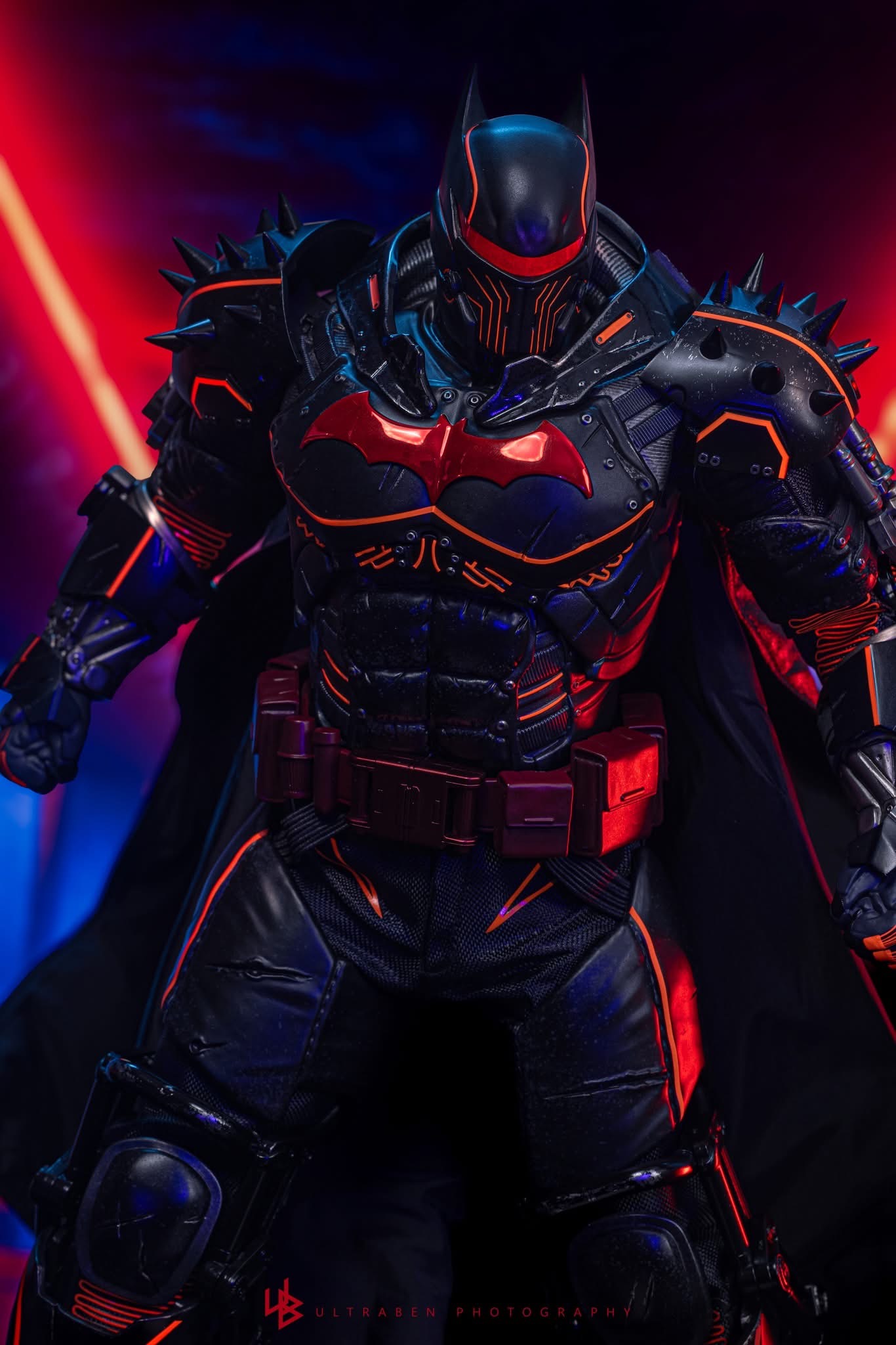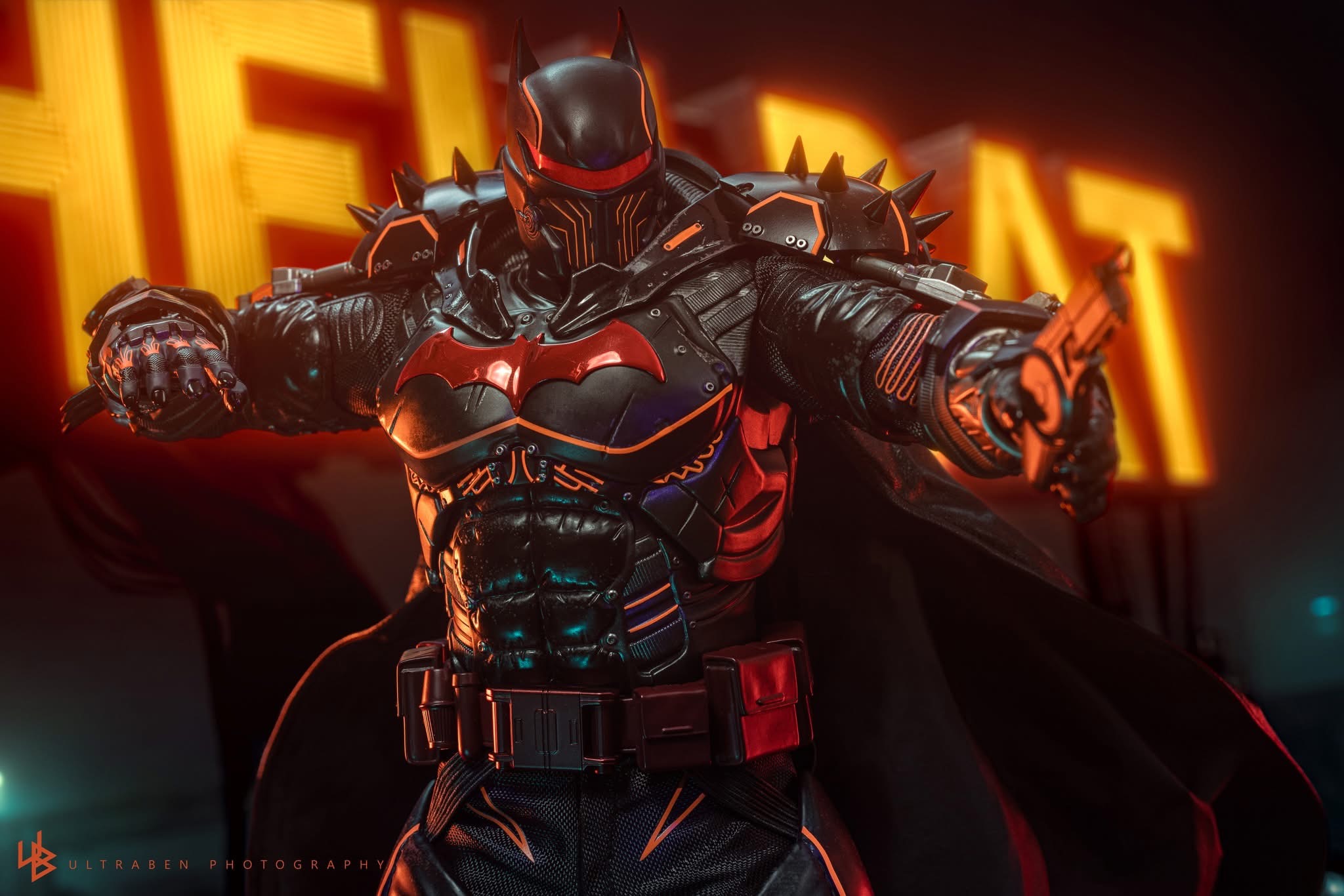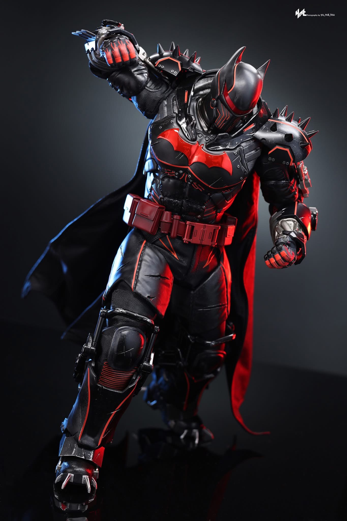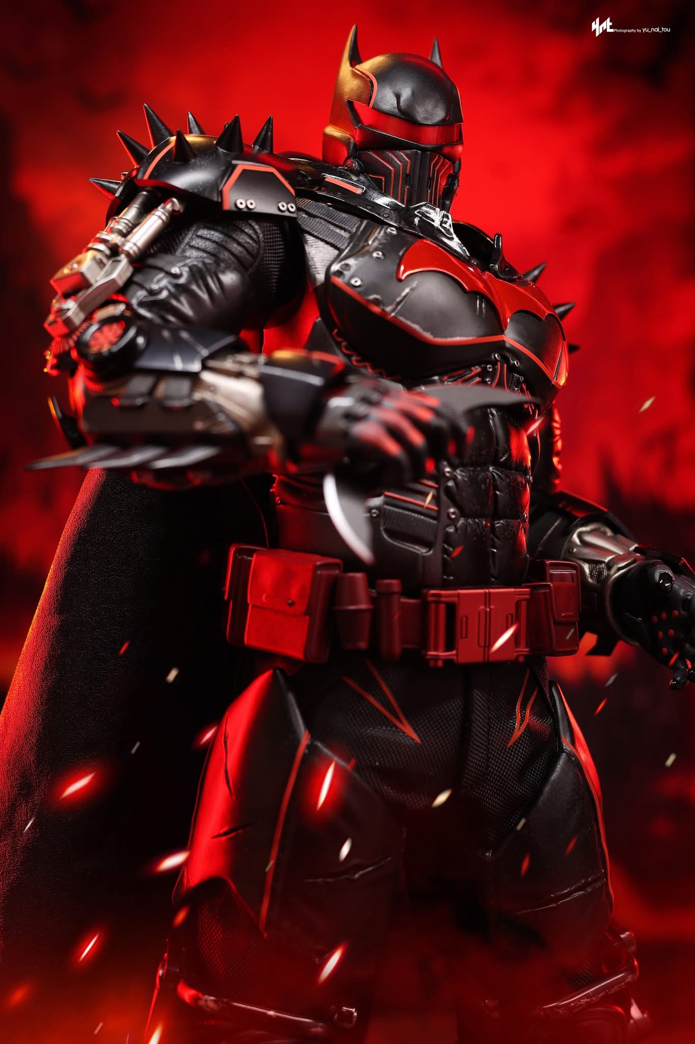 Standing 33 cm tall, the figure features a newly developed Hellbat-inspired helmeted head and a muscular body with 30 points of articulation. The heavily armoured suit merges the XE Suit’s resilience with Hellbat styling, including an electroplated red Bat-symbol, red-lined detailing with UV luminous reflective effects, and weathering to capture a battle-worn appearance. A wire-embedded black cape and a bold red utility belt complete the look.