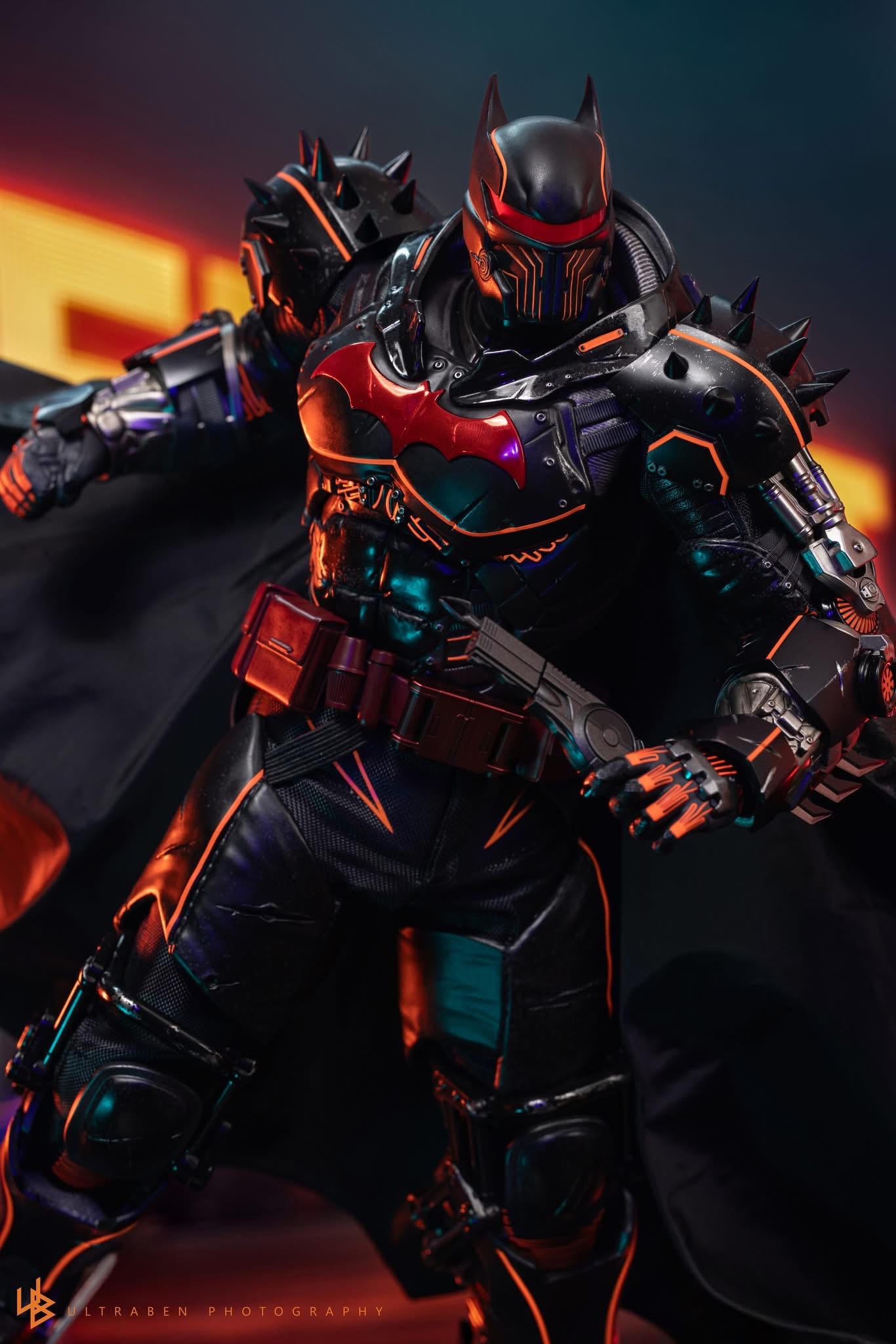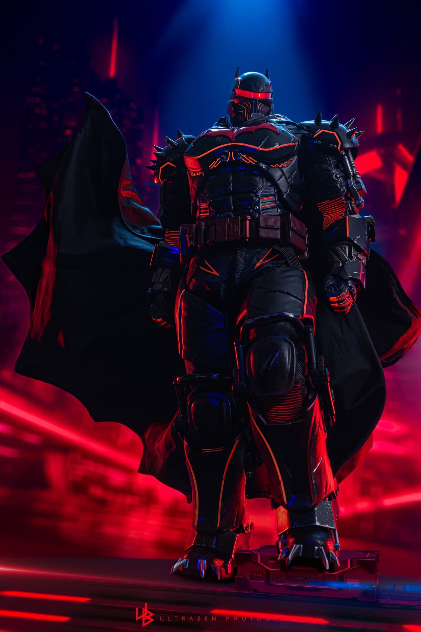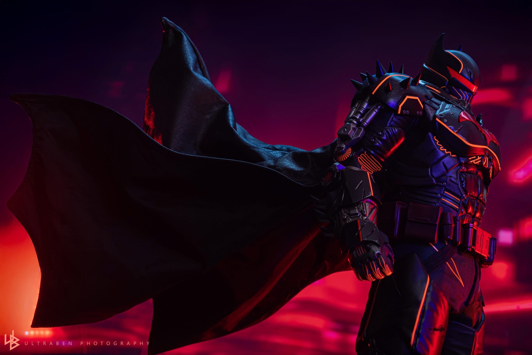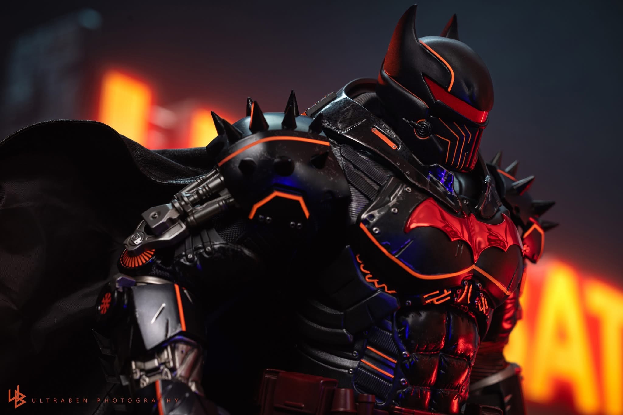 Standing 33 cm tall, the figure features a newly developed Hellbat-inspired helmeted head and a muscular body with 30 points of articulation. The heavily armoured suit merges the XE Suit’s resilience with Hellbat styling, including an electroplated red Bat-symbol, red-lined detailing with UV luminous reflective effects, and weathering to capture a battle-worn appearance. A wire-embedded black cape and a bold red utility belt complete the look.