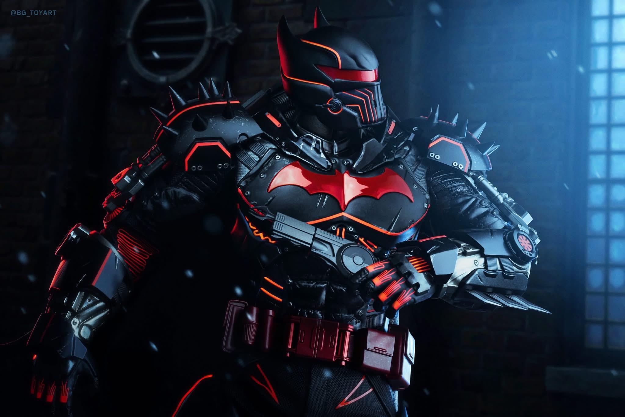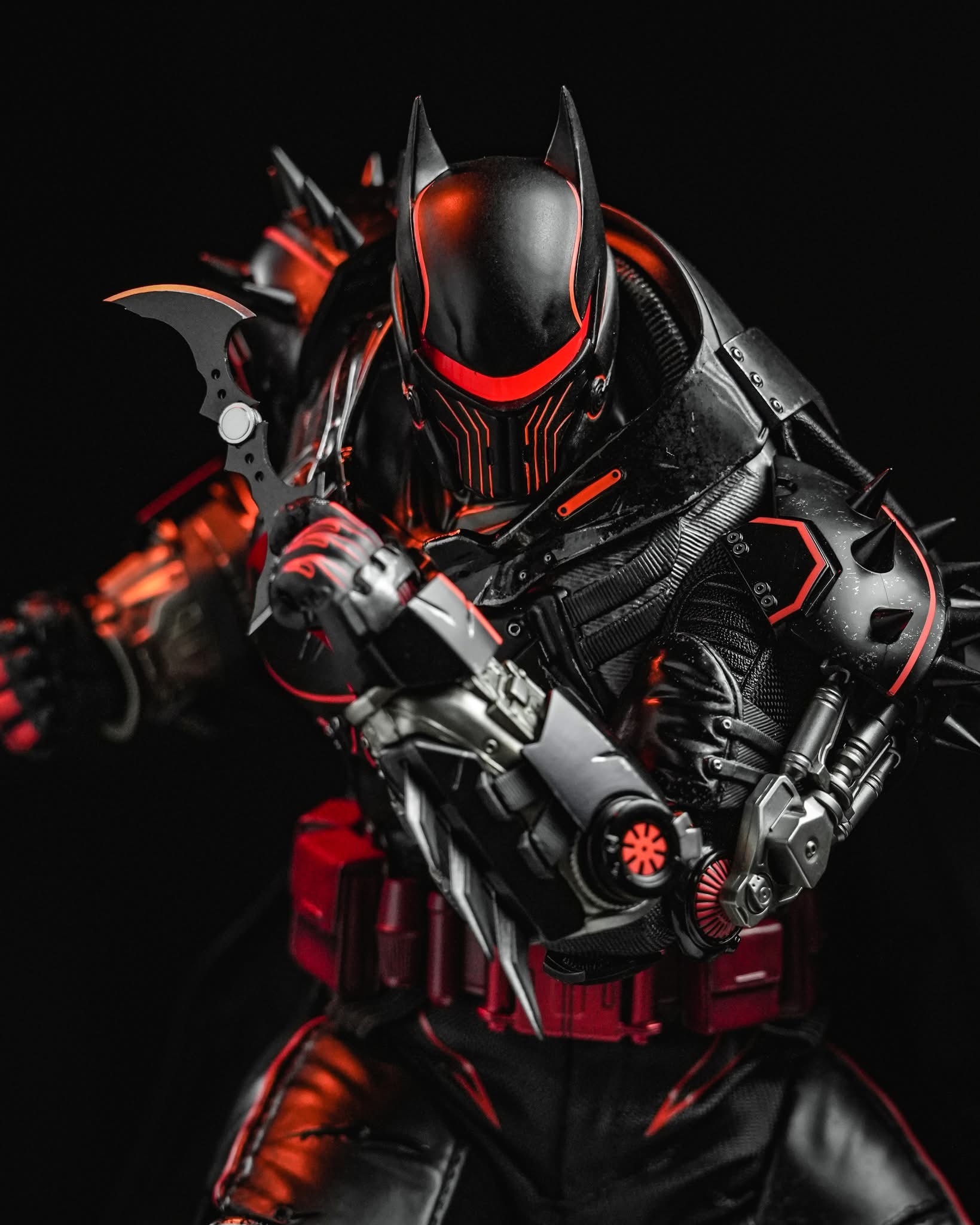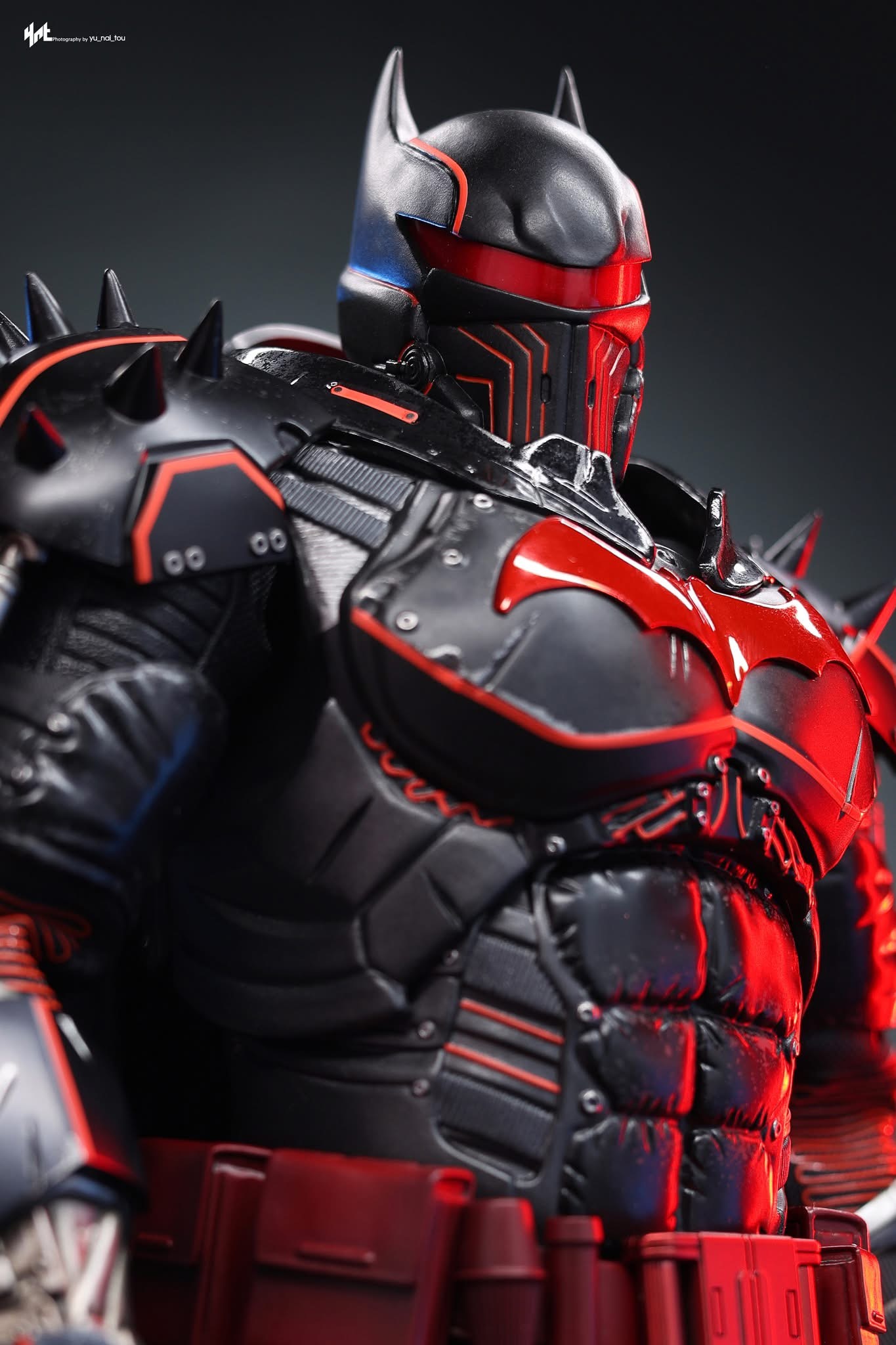 - Heavily armoured XE Suit with electroplated red Bat-symbol, reflective red line detailing, and weathering