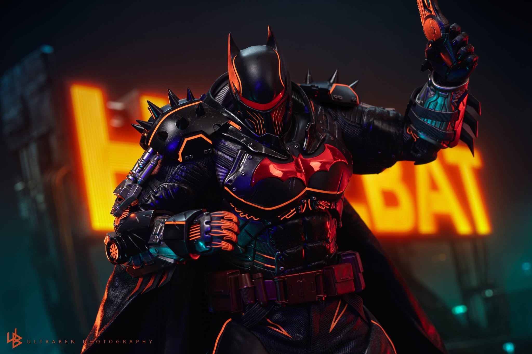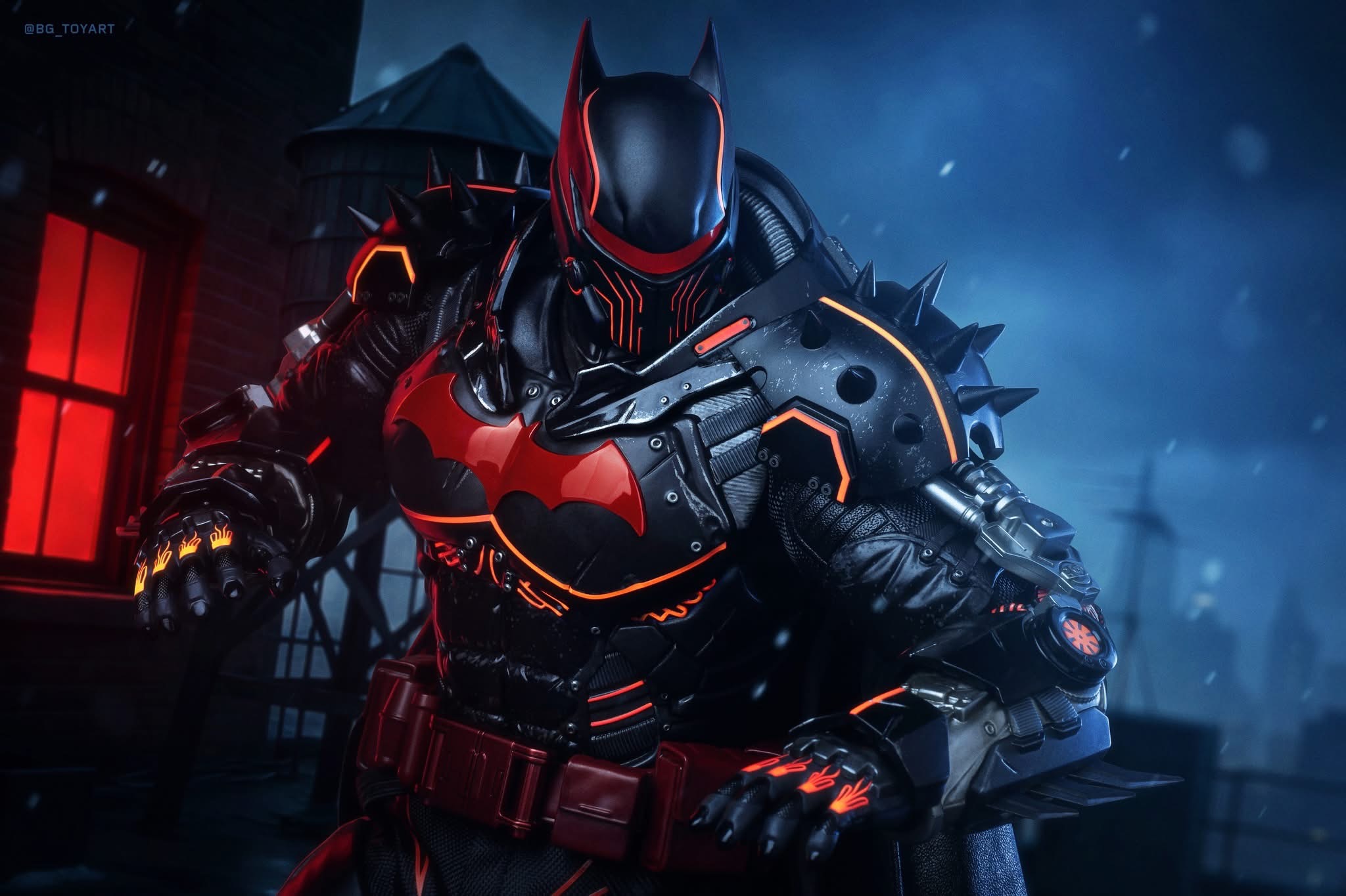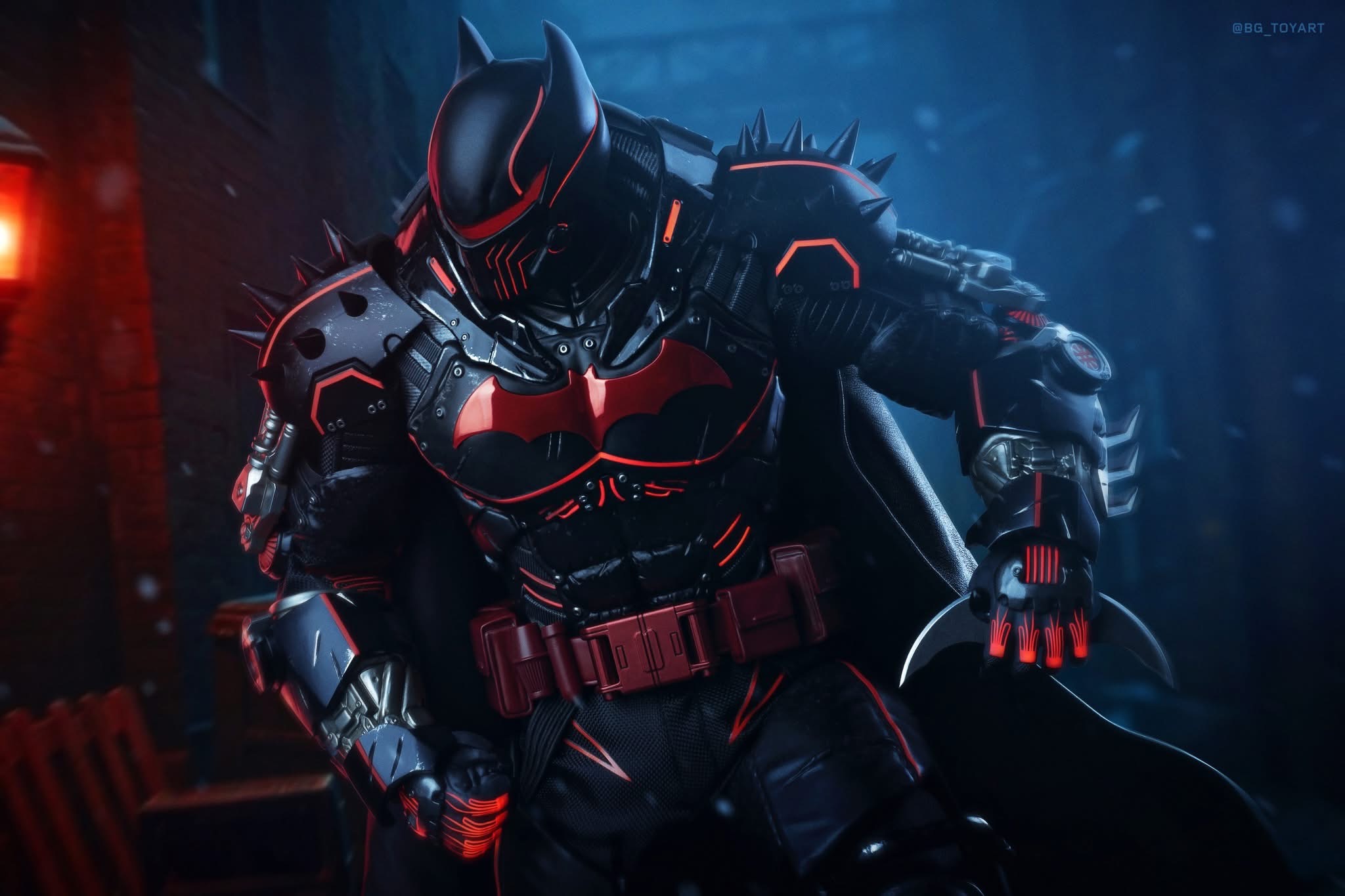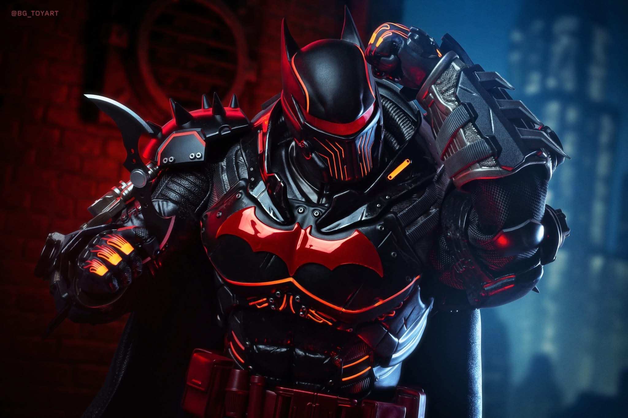 - Heavily armoured XE Suit with electroplated red Bat-symbol, reflective red line detailing, and weathering