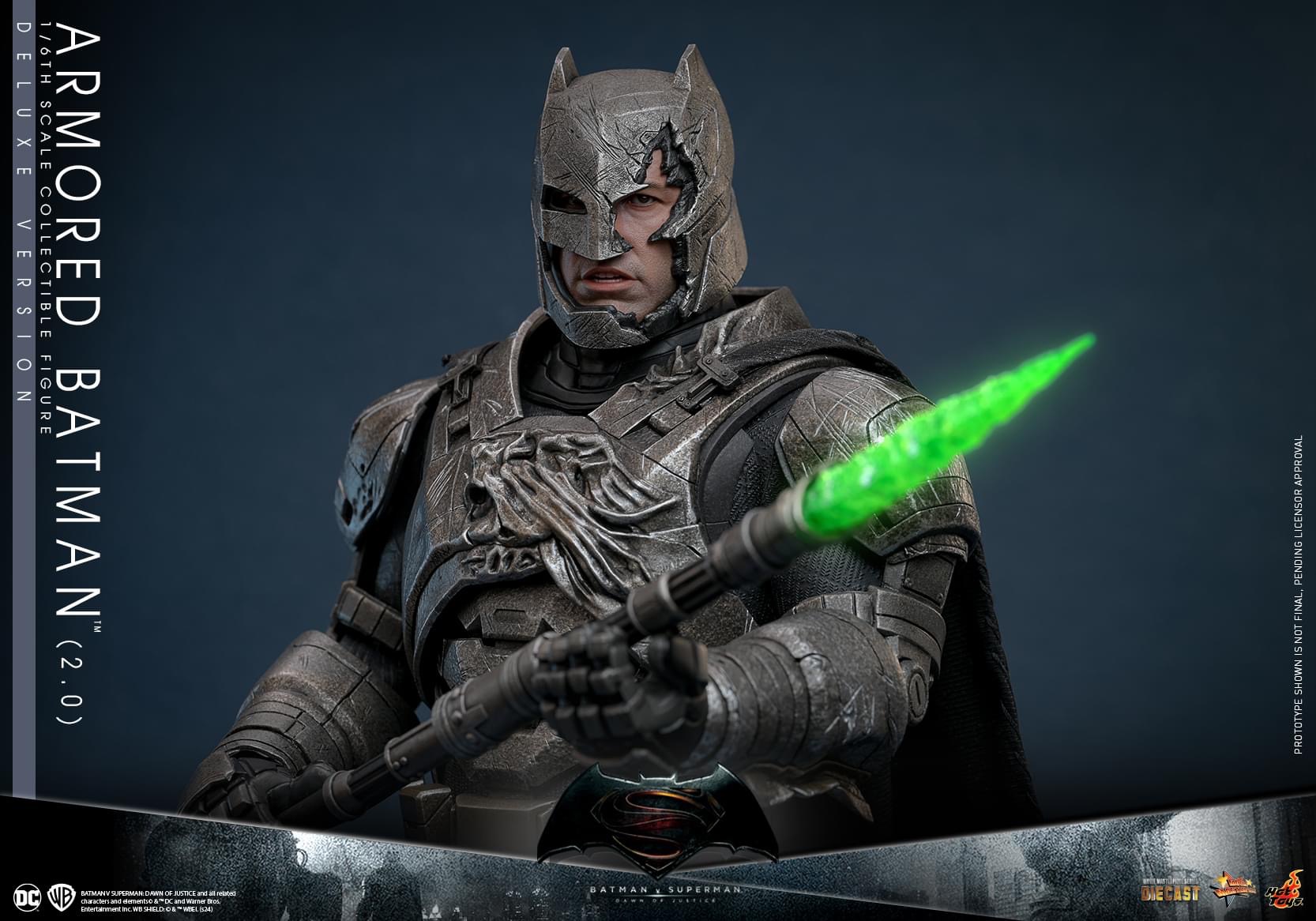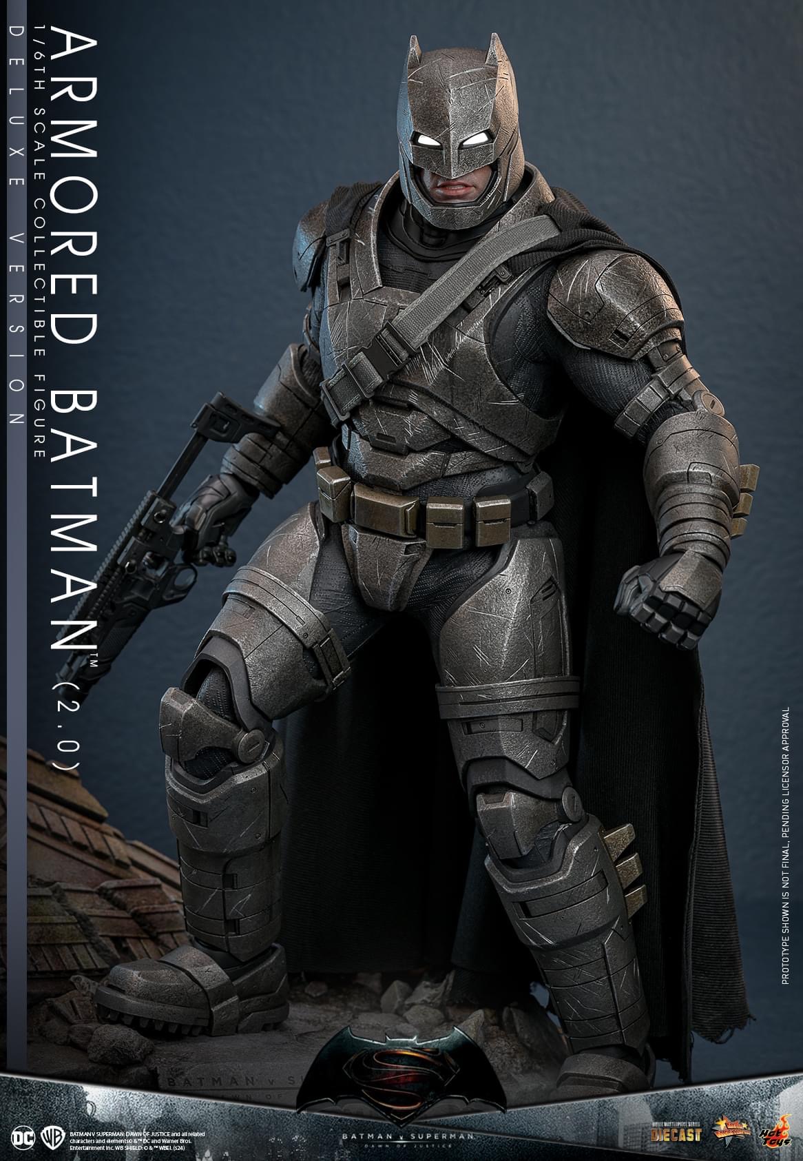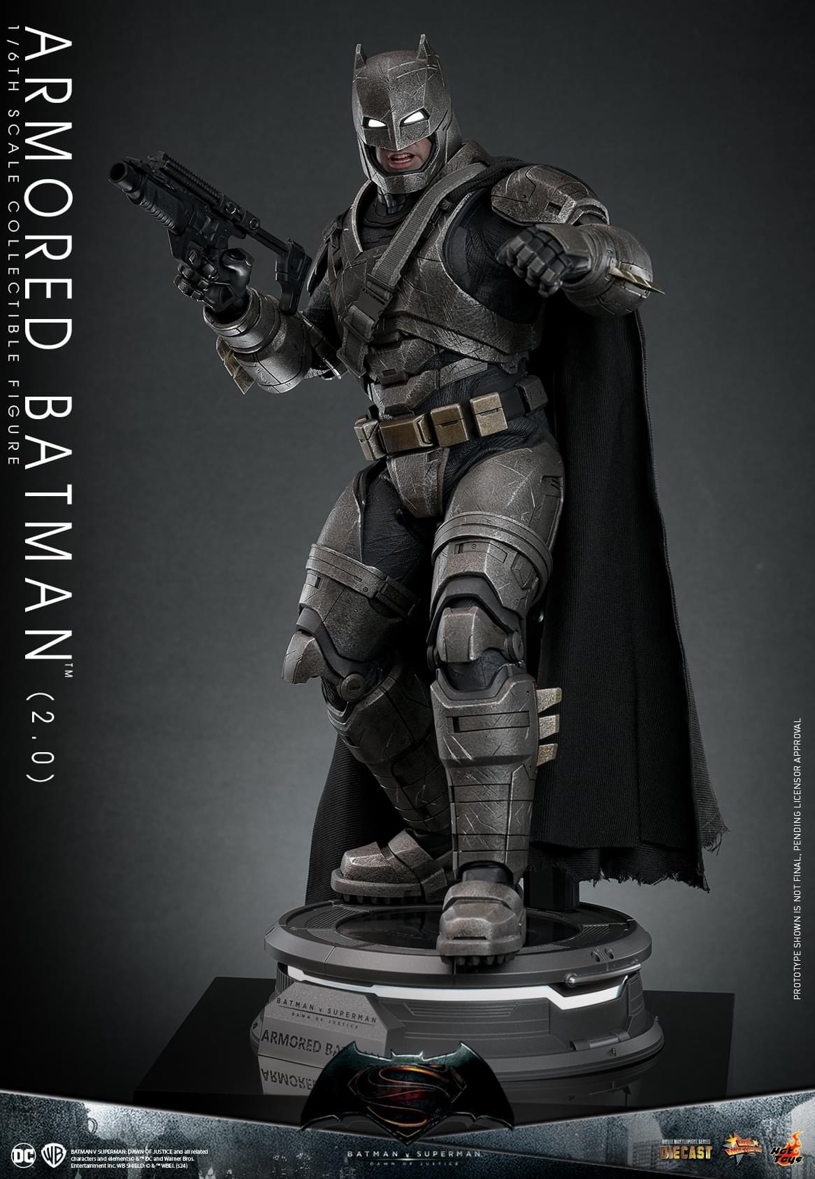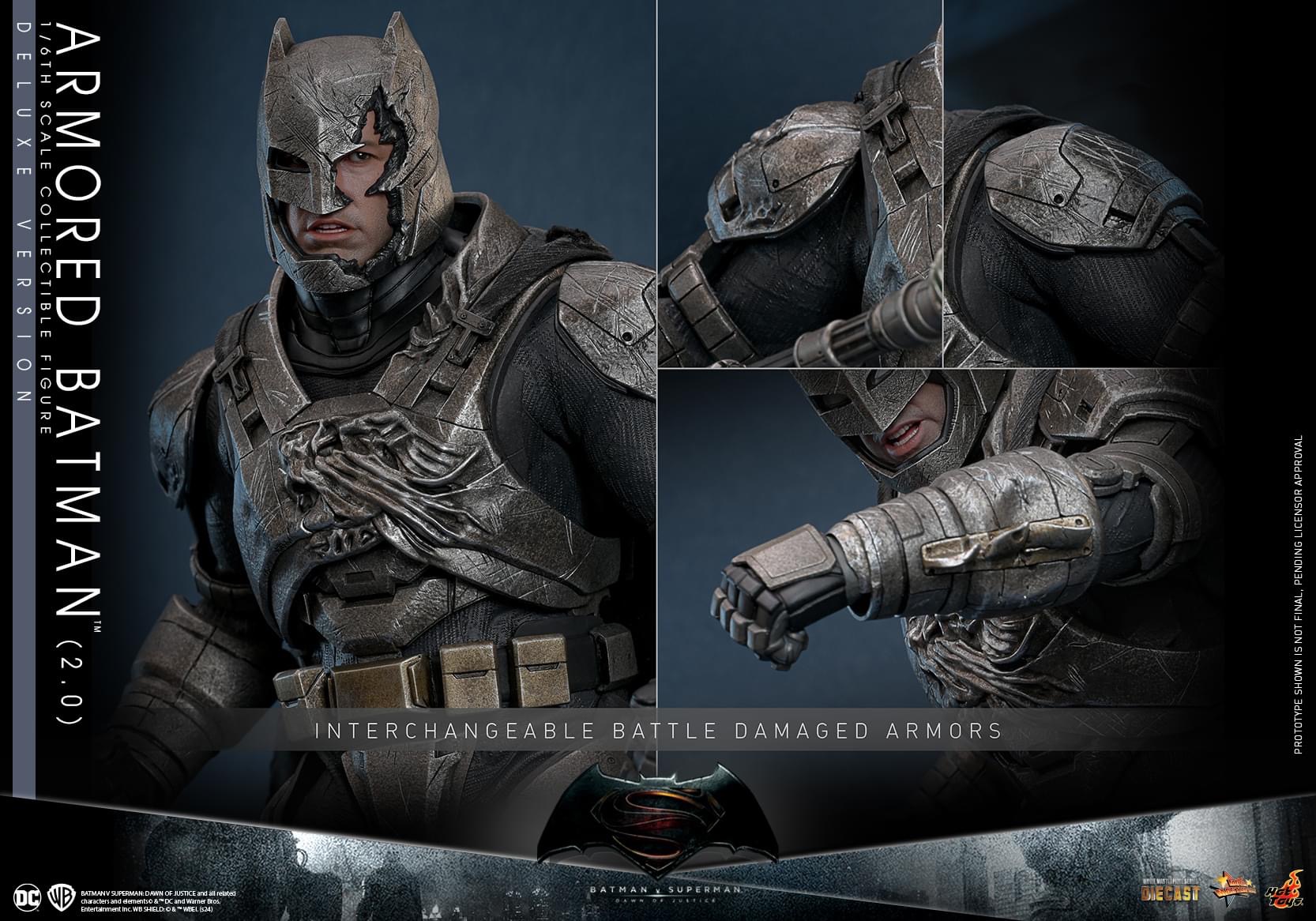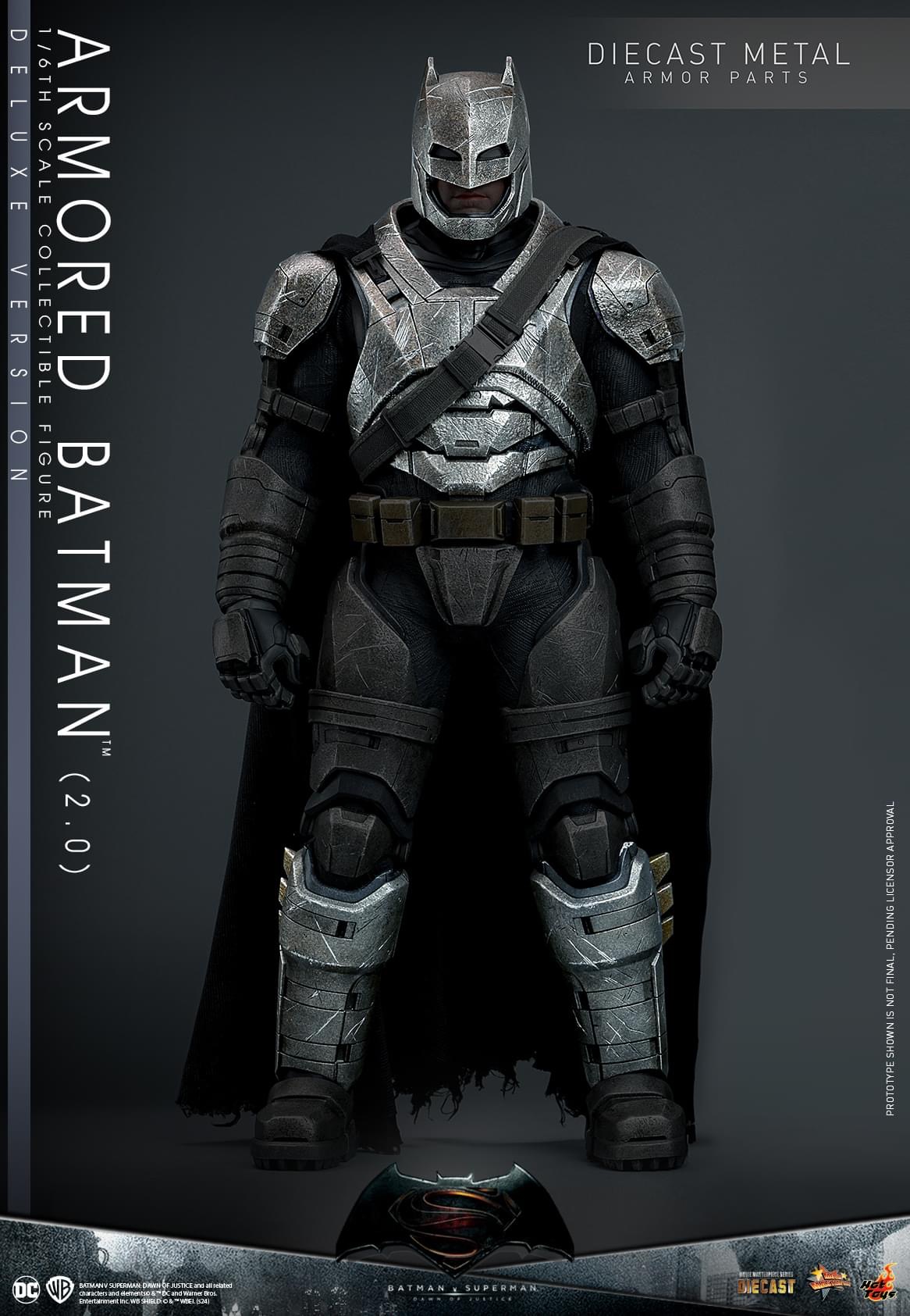 The Armoured Batman from Batman v Superman: Dawn of Justice has received a 2.0 from Hot Toys. The new figure now comes with diecast armour and improved weathering. Two versions have been announced by Hot Toys, a regular version and a deluxe version.