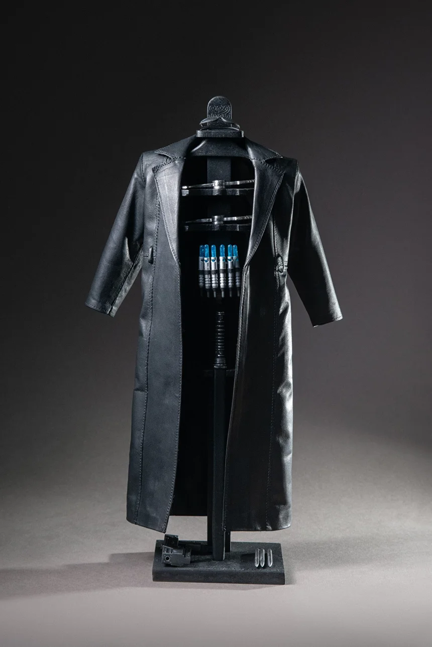 This collector’s piece showcases a diverse range of high-quality materials: fabrics, genuine leather, metal fittings, synthetic glass, and wood. The figure includes: