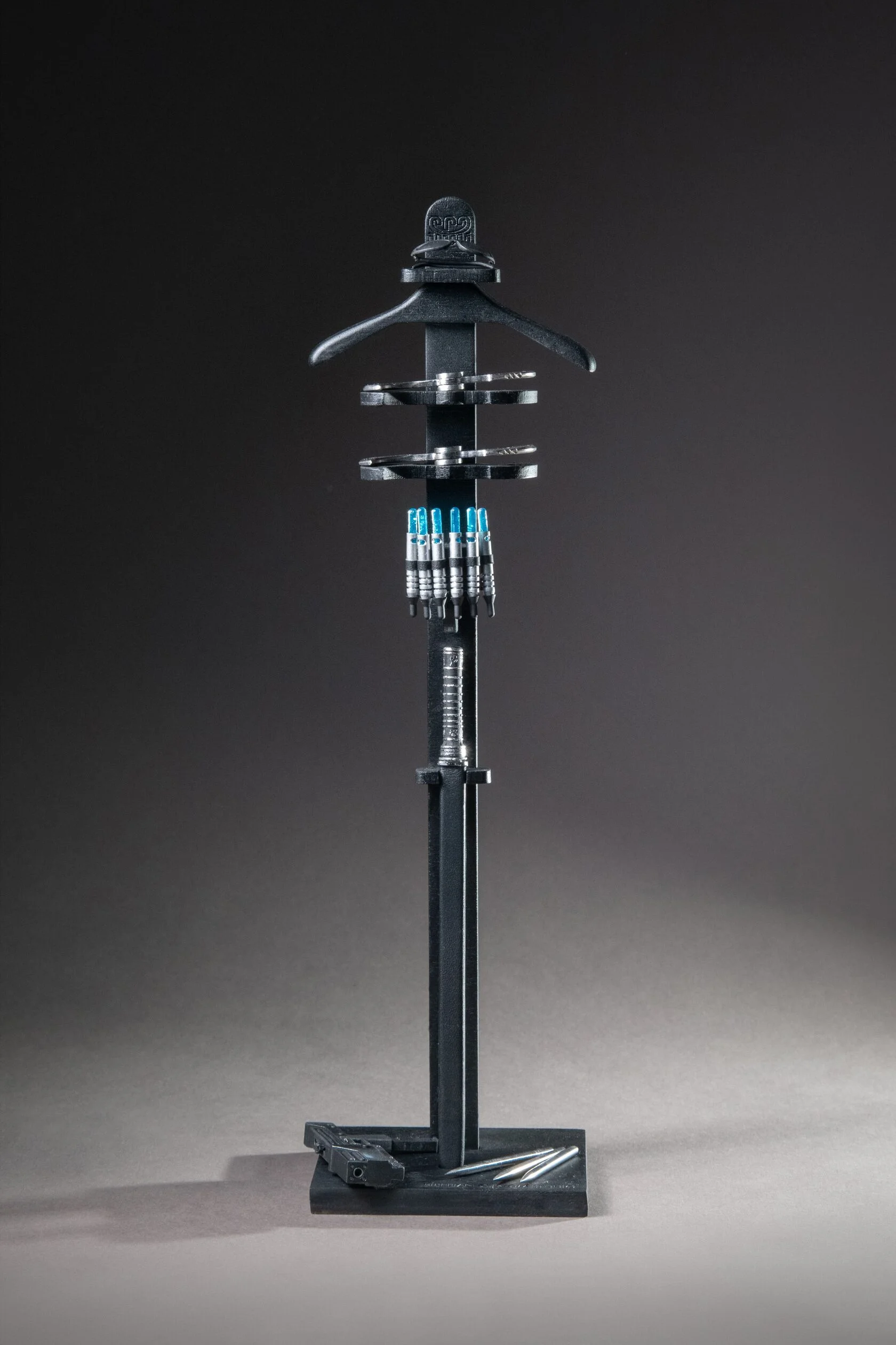 Each figure is supplied with a wooden coat hanger fitted with an accessory holder and an autonomous backlit stand, powered by batteries, complete with vampire rune designs—enhancing both display and dramatic presentation.