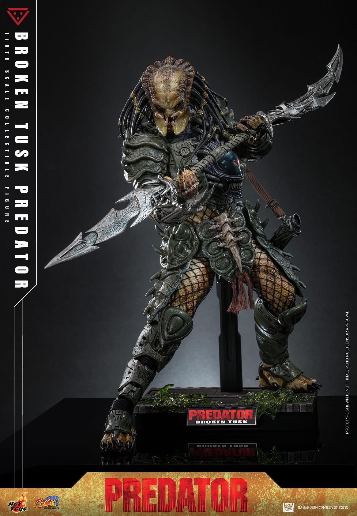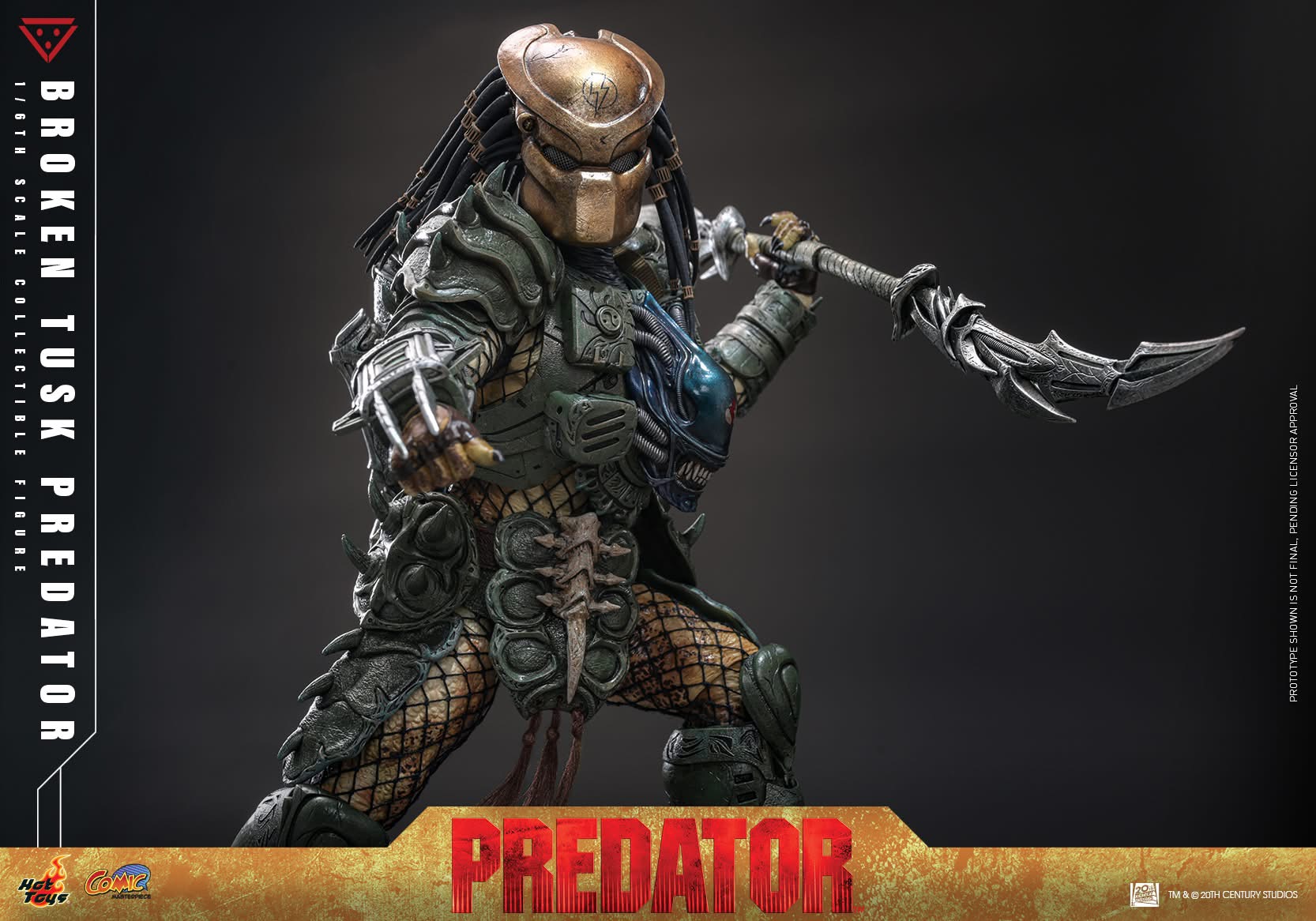 Standing at approximately 35 cm tall, the Broken Tusk Predator features a finely crafted head sculpt with rubber hair strands and a distinctive chipped tusk. The Predator mask carries its lightning motif, while the newly designed armour incorporates weathering effects and a Xenomorph head emblem across the chest. With over 16 points of articulation, the figure is engineered for menacing poses that recall Broken Tusk’s final battle.