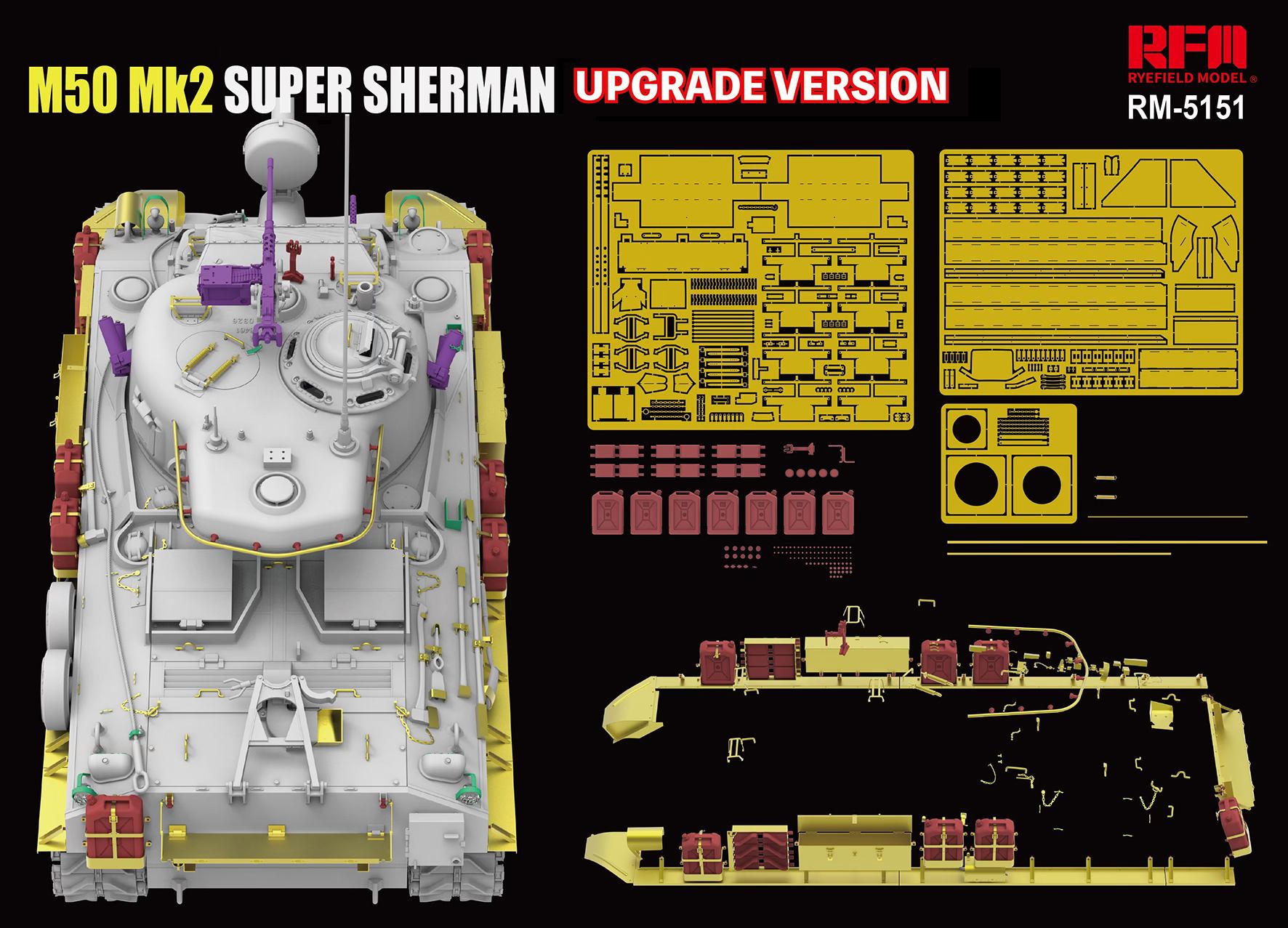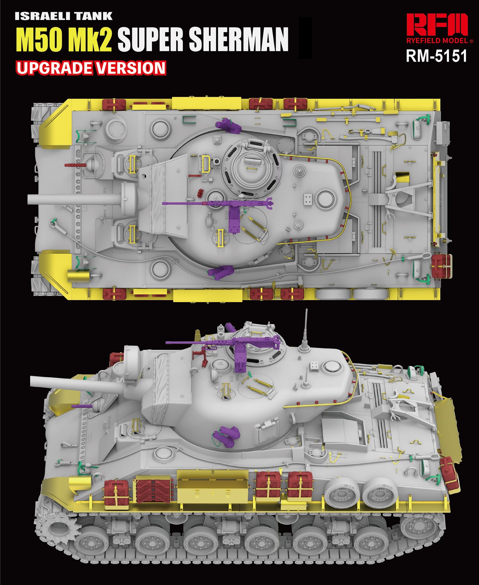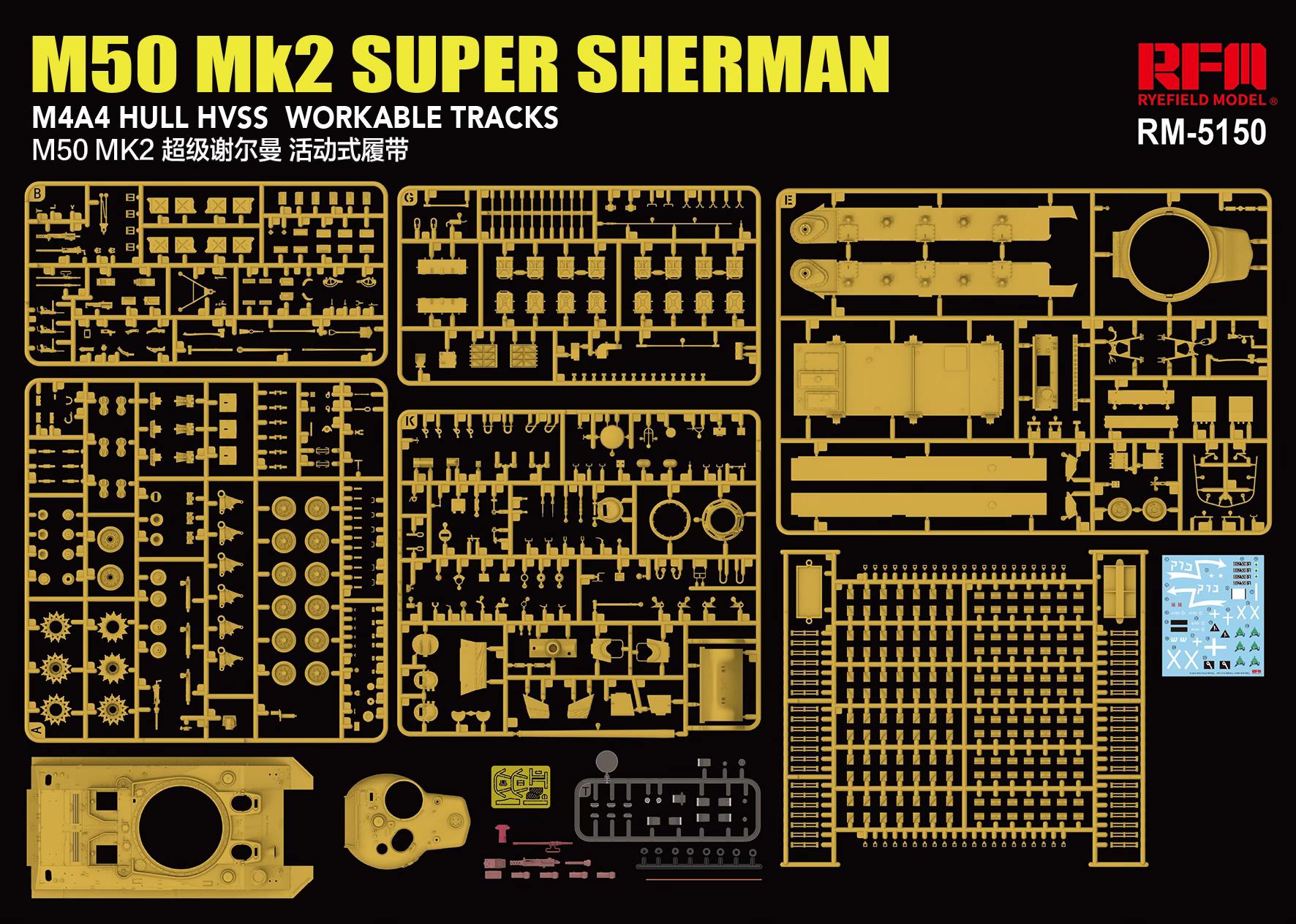 From post-war battlefields to the workbench, RYE FIELD MODEL has introduced two new 1/35 scale kits depicting the Israeli M50 Mk2 Super Sherman. Listed as item numbers 5150 and 5151, the releases recreate the M4A4 hull fitted with the HVSS suspension system, representing a key stage in the Sherman’s evolution during its extended service life.