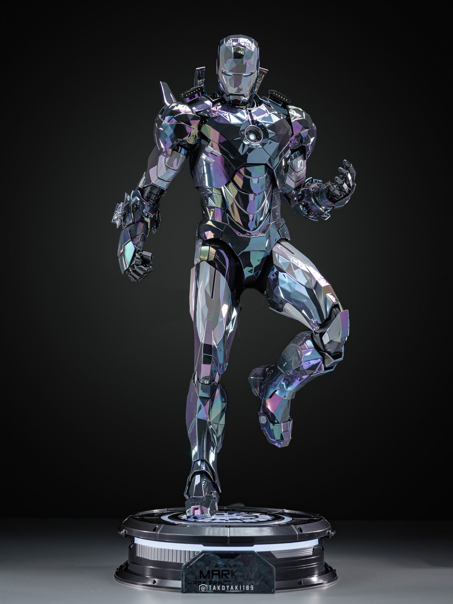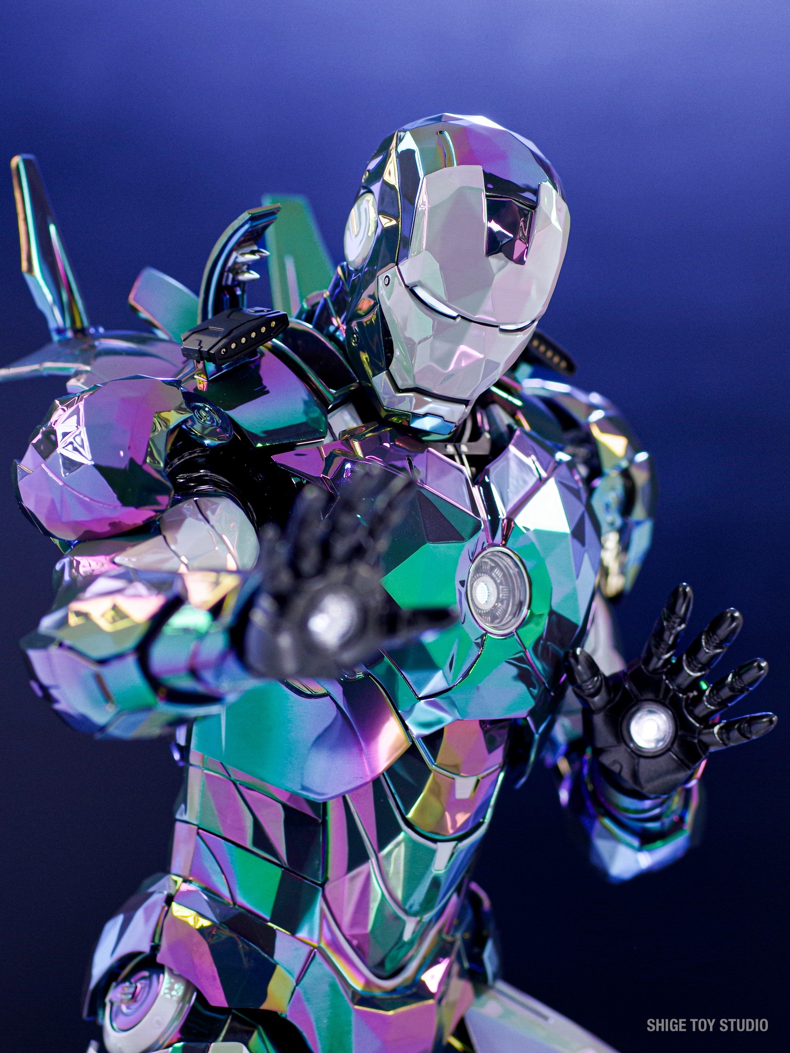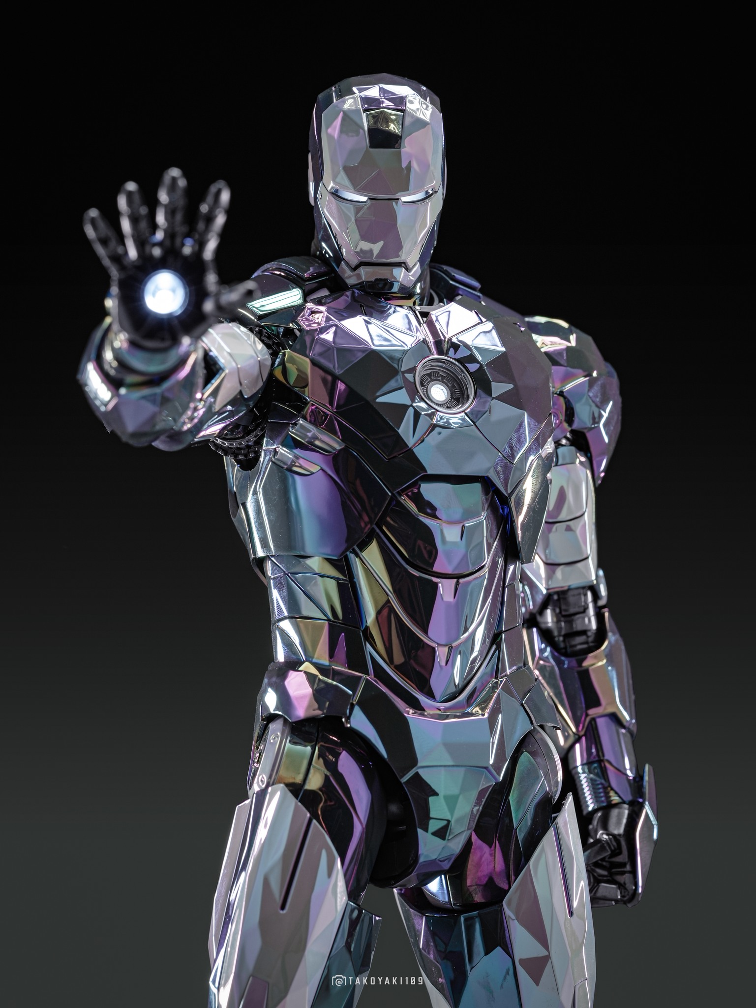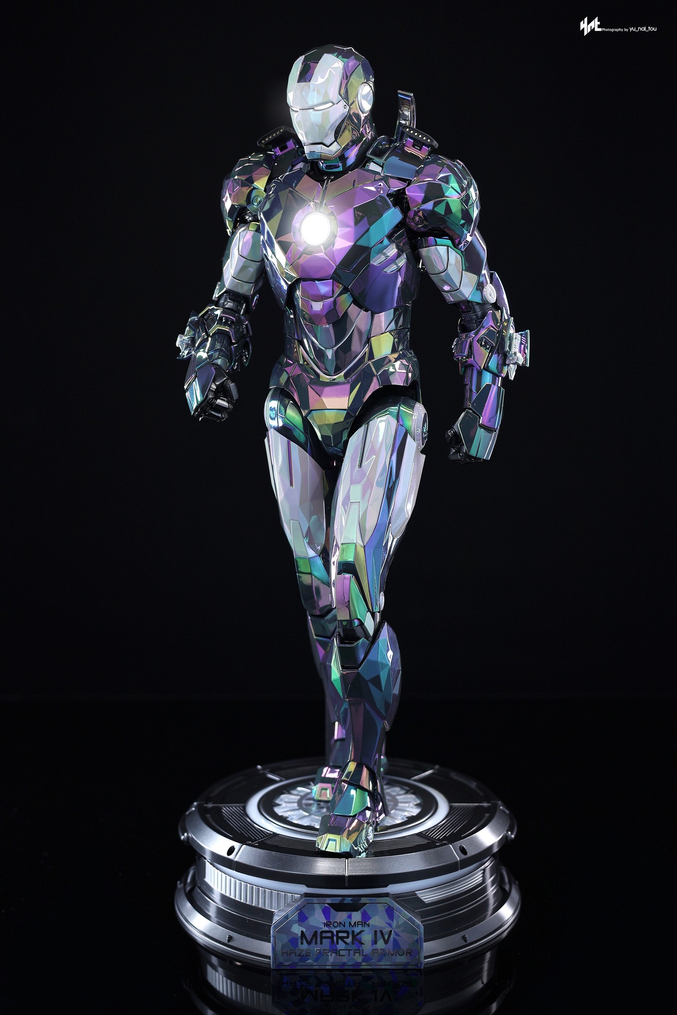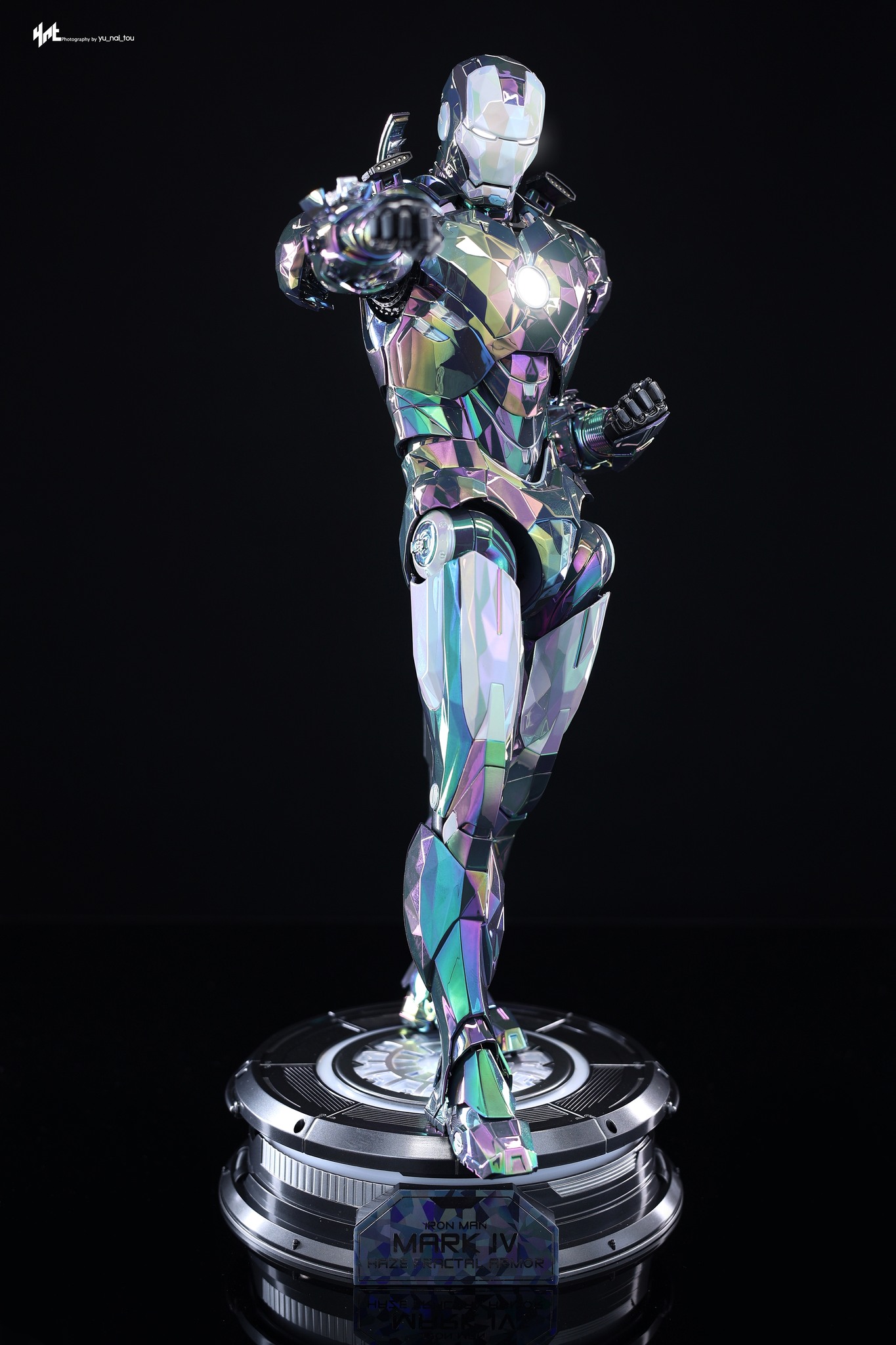 The Mark IV is constructed with die-cast components, giving the figure added weight and structural presence. The armour features an electroplated iridescent coating applied across irregular, prism-like surfaces, creating a refractive effect that shifts under lighting. LED functions are integrated throughout the suit, including the helmet eyes, Arc Reactor, and repulsors in white light, alongside blue illumination within the forearm sections.