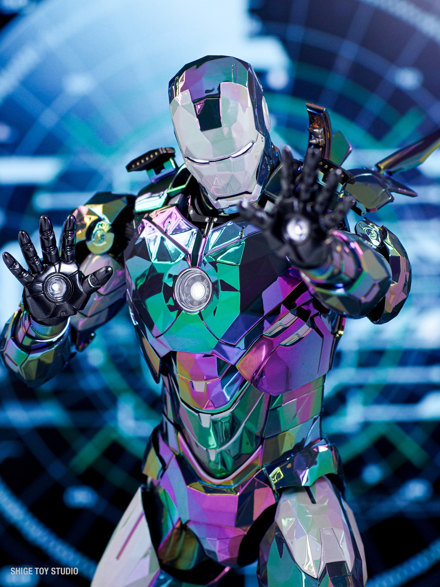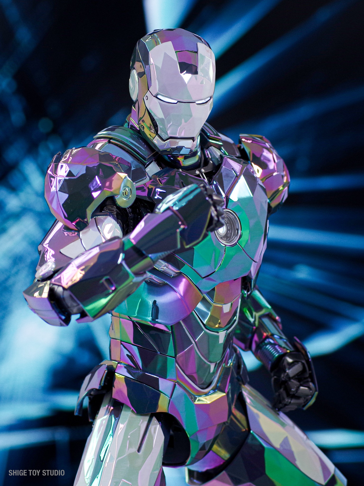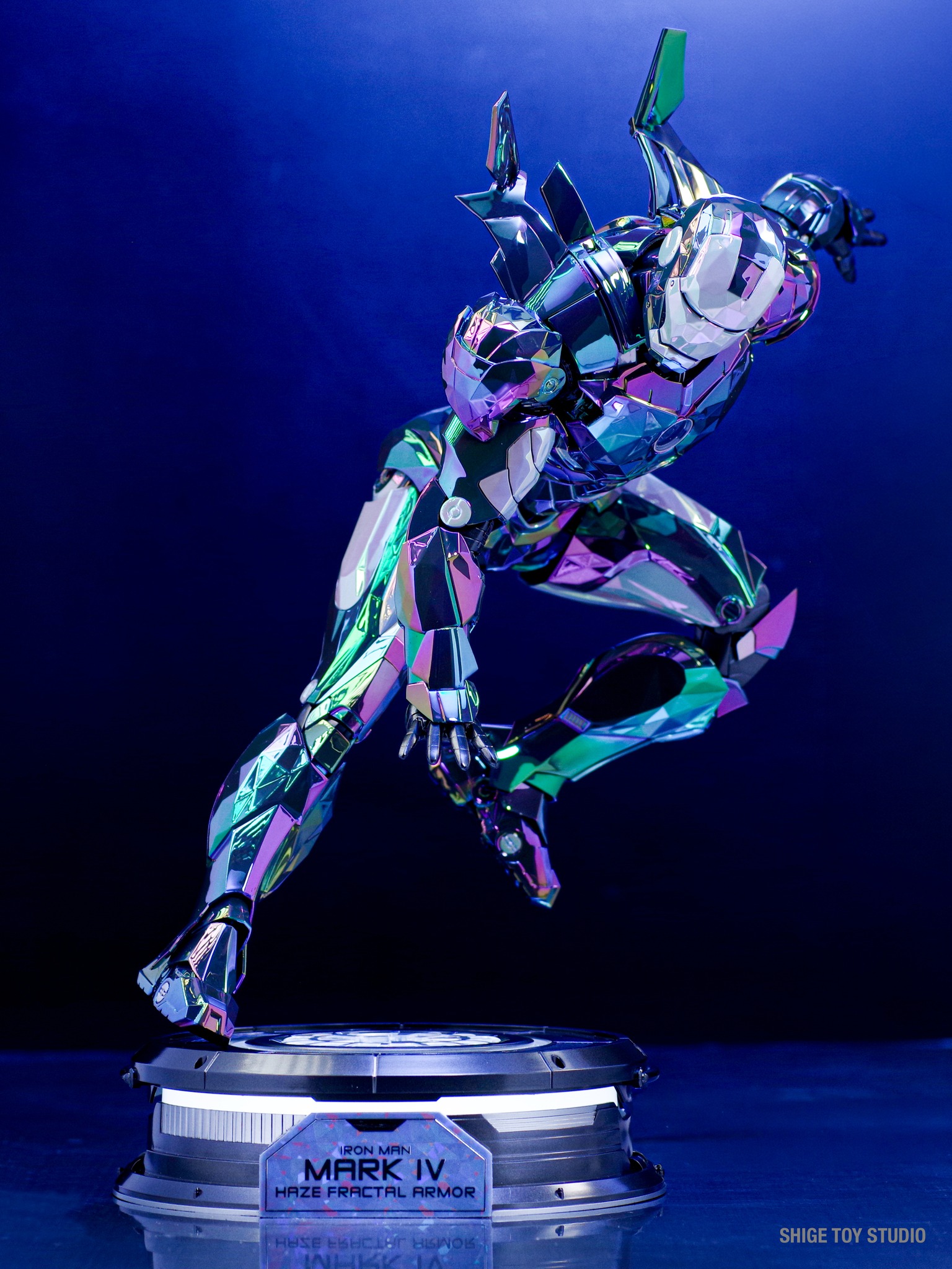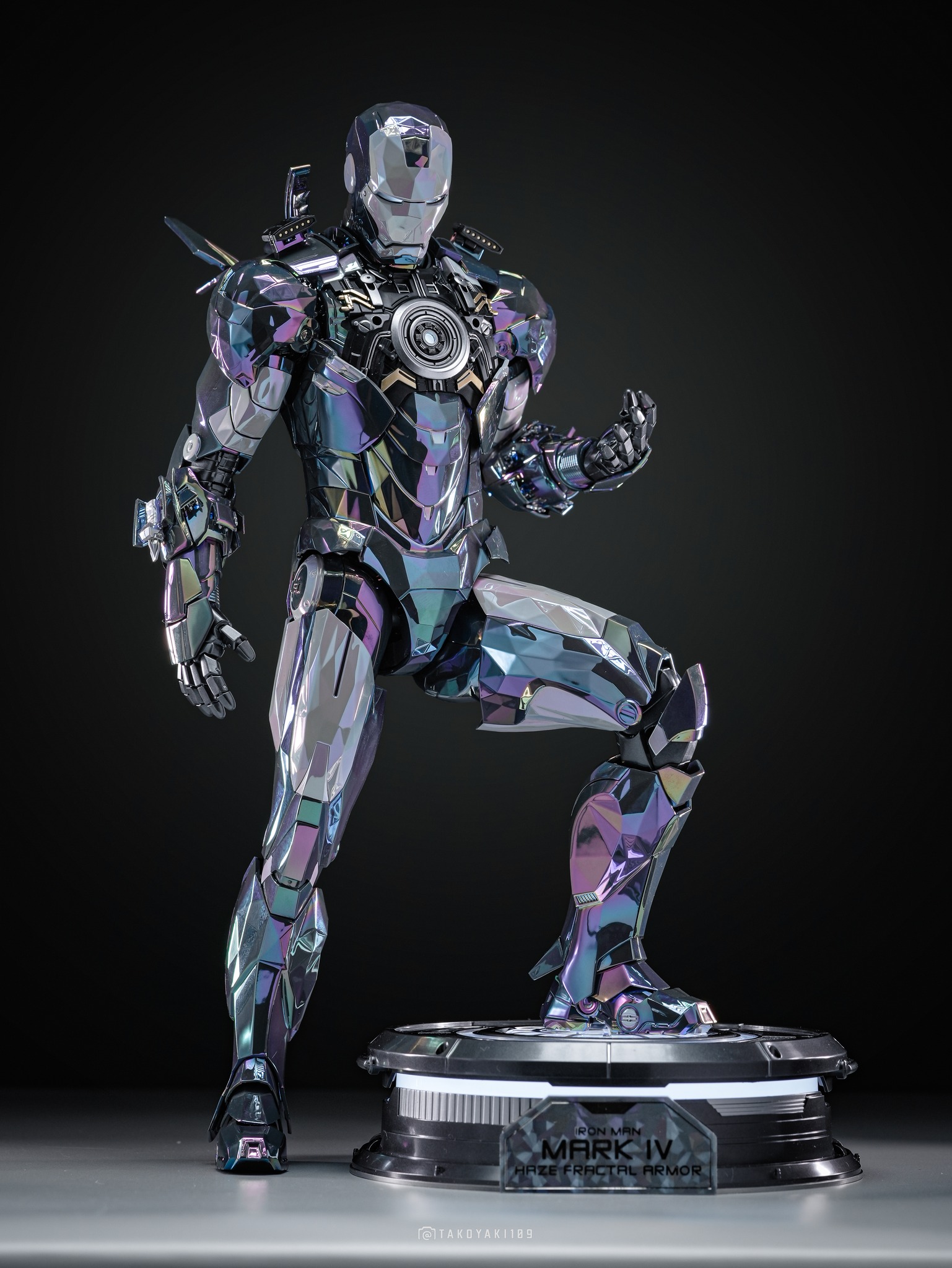 The Mark IV is constructed with die-cast components, giving the figure added weight and structural presence. The armour features an electroplated iridescent coating applied across irregular, prism-like surfaces, creating a refractive effect that shifts under lighting. LED functions are integrated throughout the suit, including the helmet eyes, Arc Reactor, and repulsors in white light, alongside blue illumination within the forearm sections.