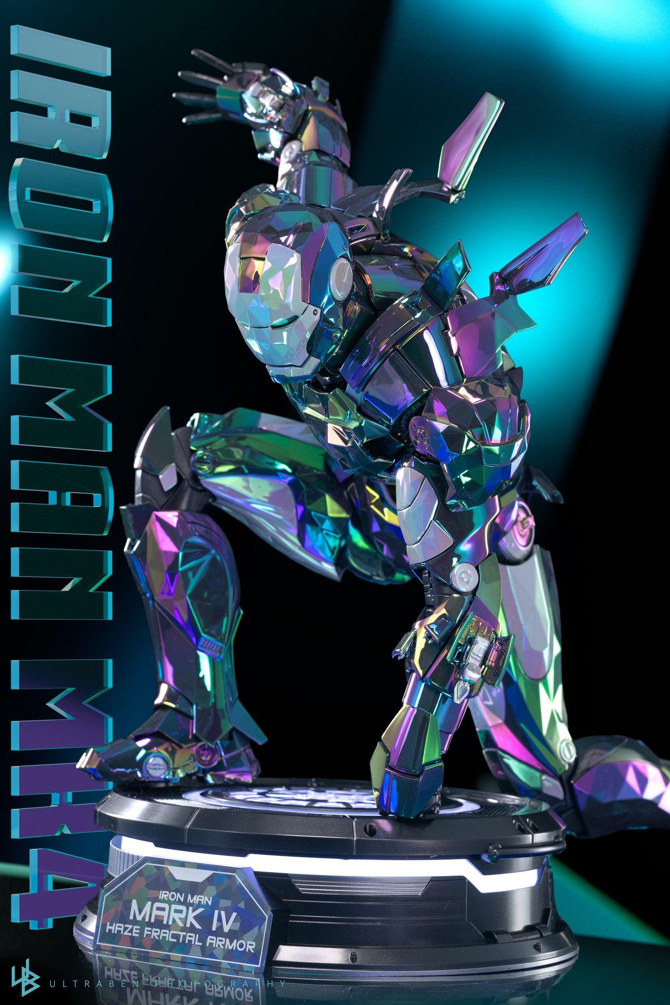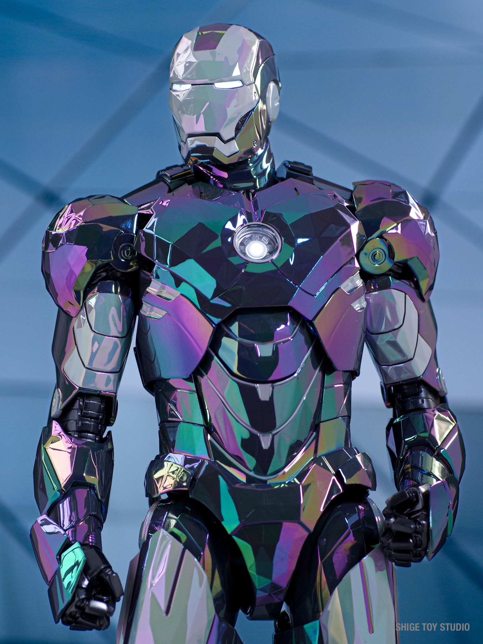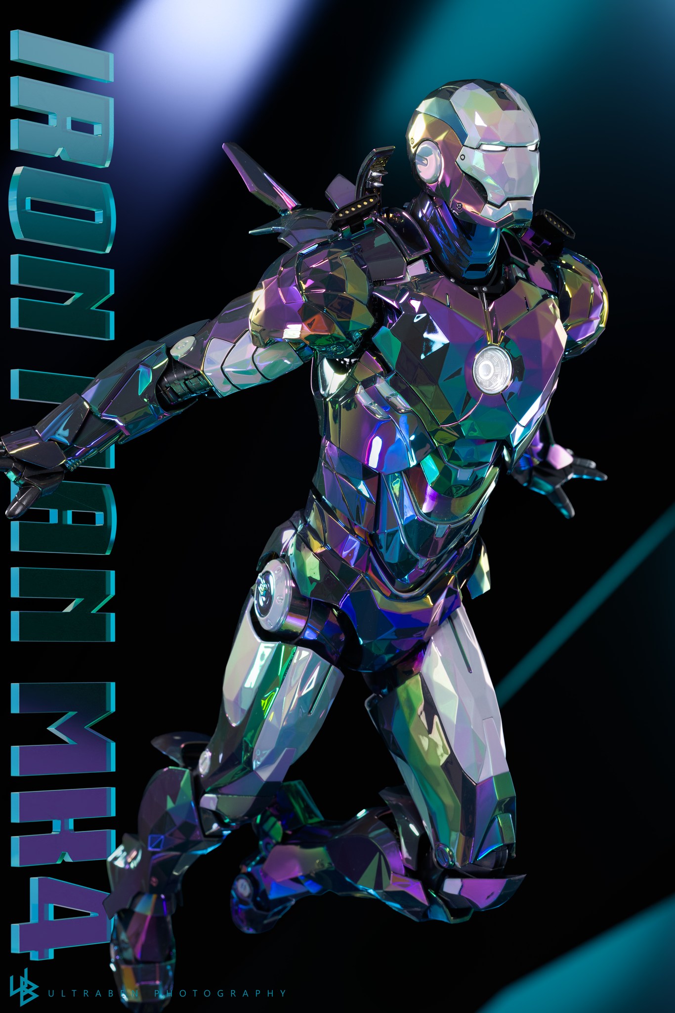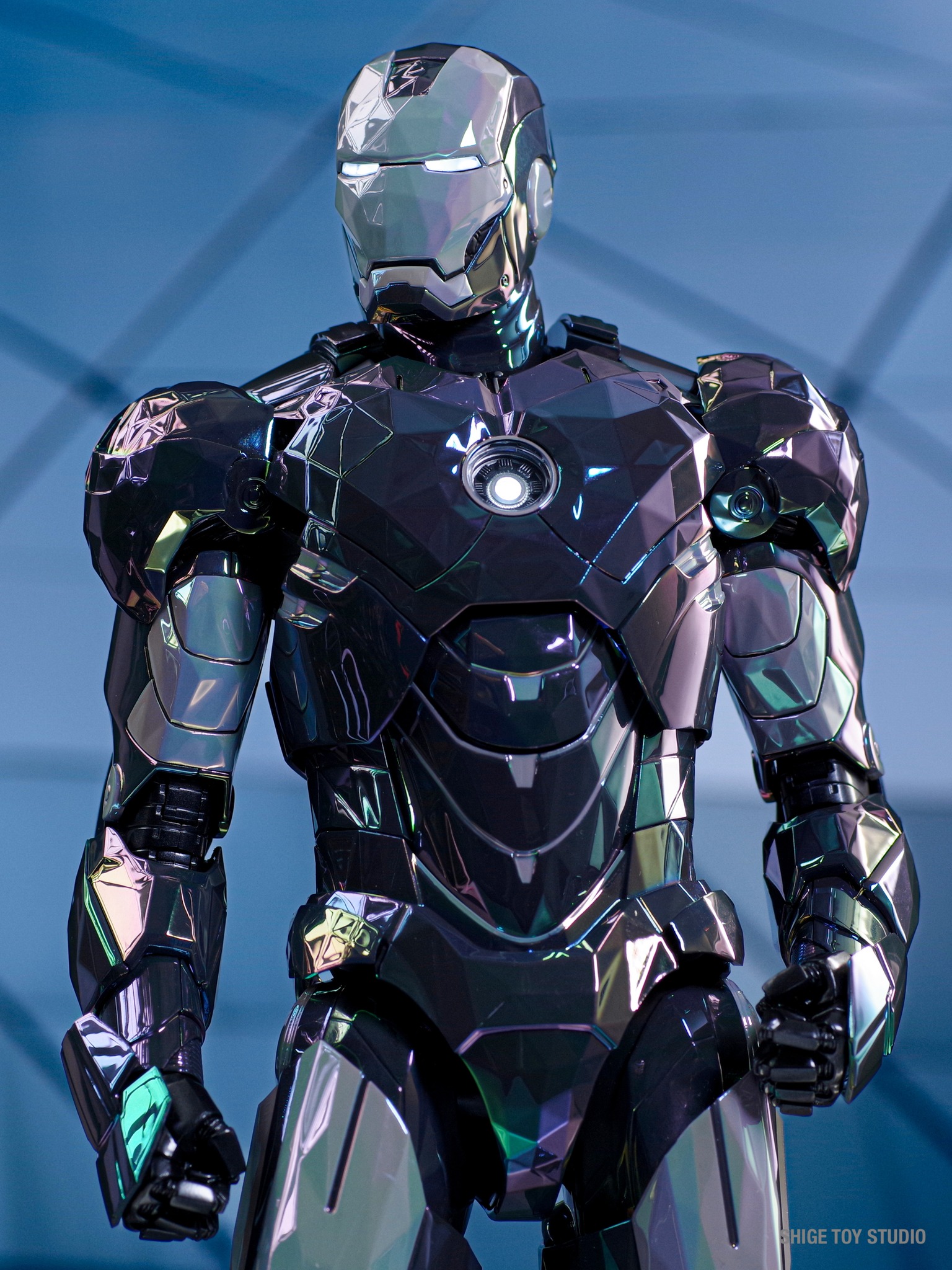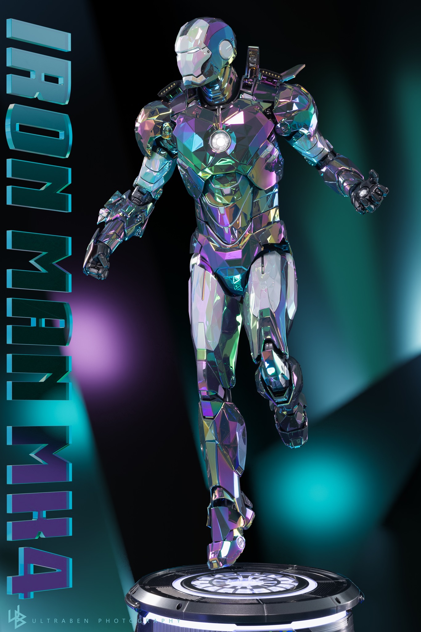 The Mark IV is constructed with die-cast components, giving the figure added weight and structural presence. The armour features an electroplated iridescent coating applied across irregular, prism-like surfaces, creating a refractive effect that shifts under lighting. LED functions are integrated throughout the suit, including the helmet eyes, Arc Reactor, and repulsors in white light, alongside blue illumination within the forearm sections.