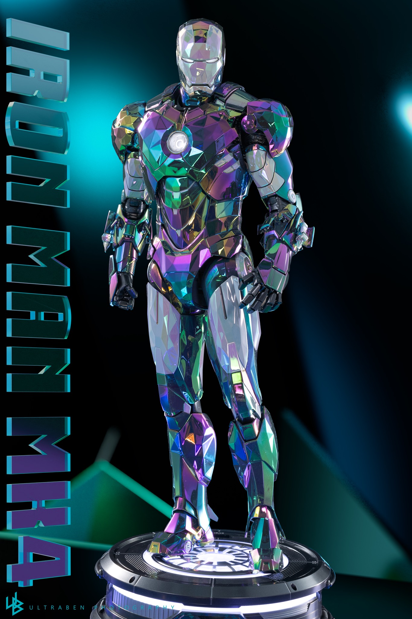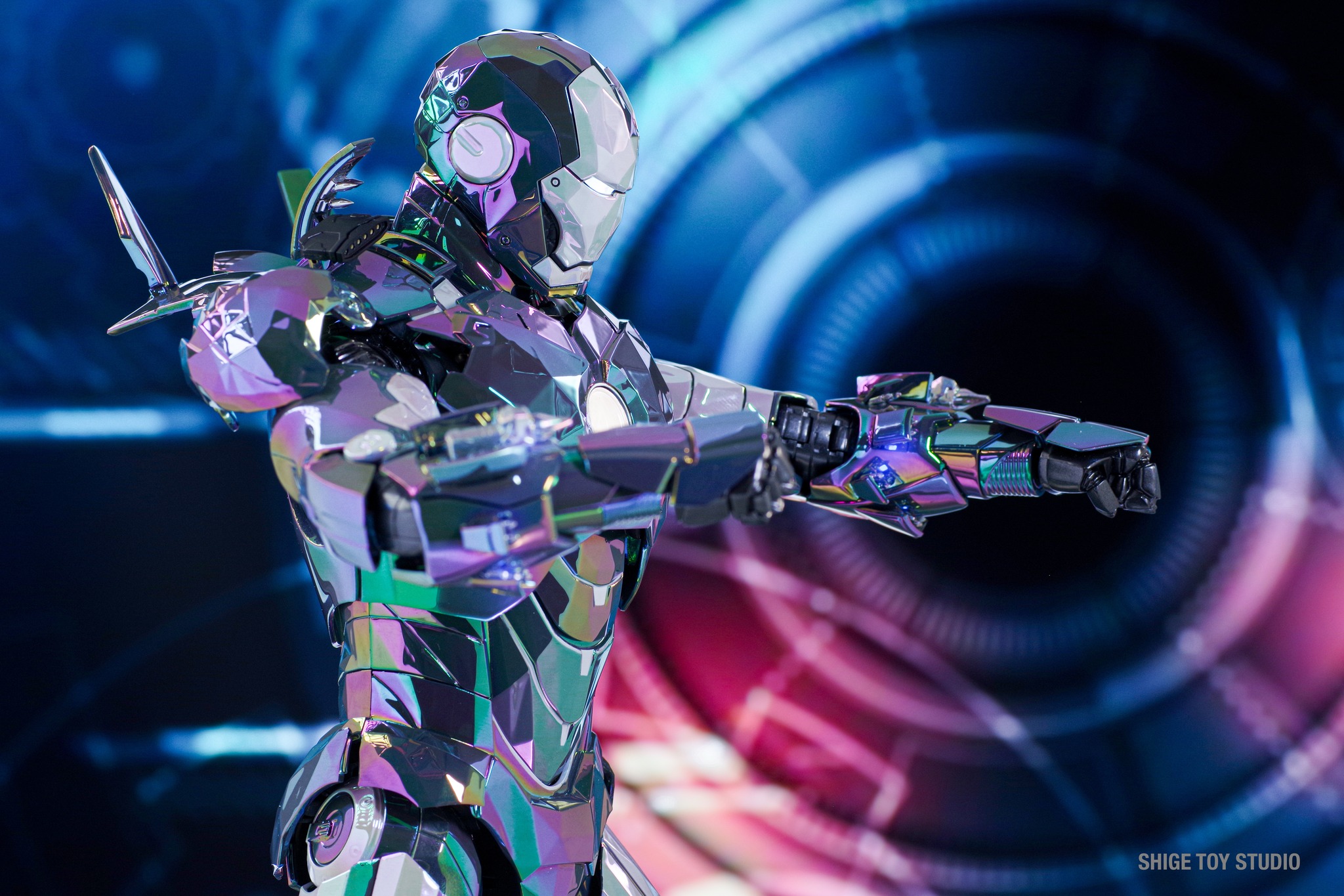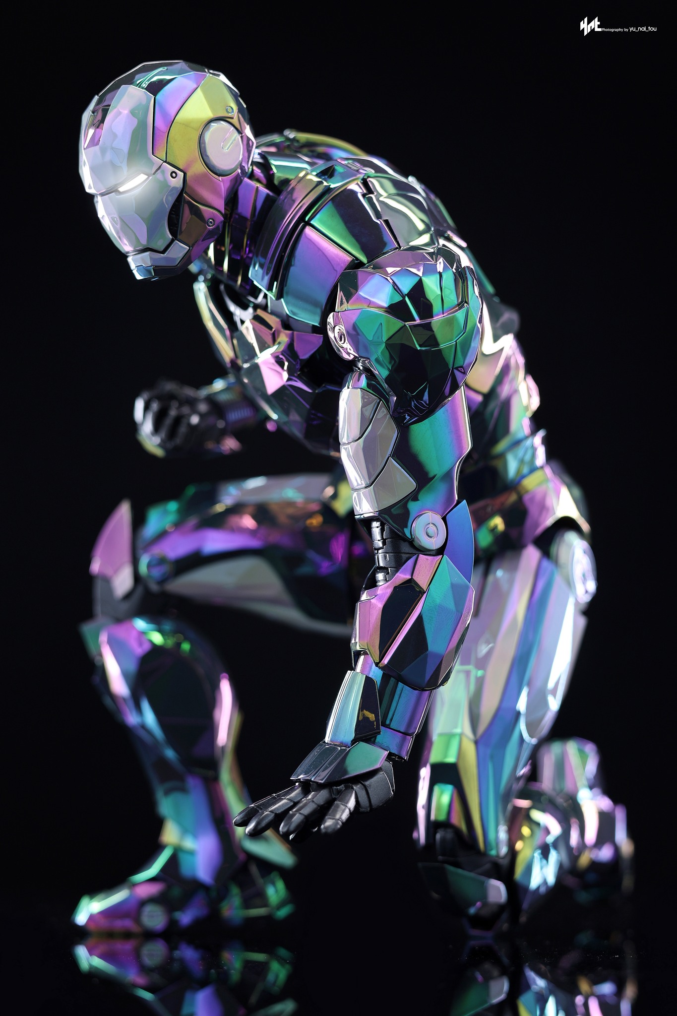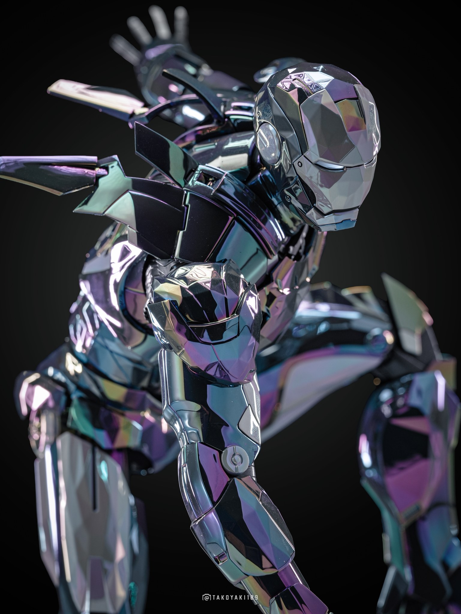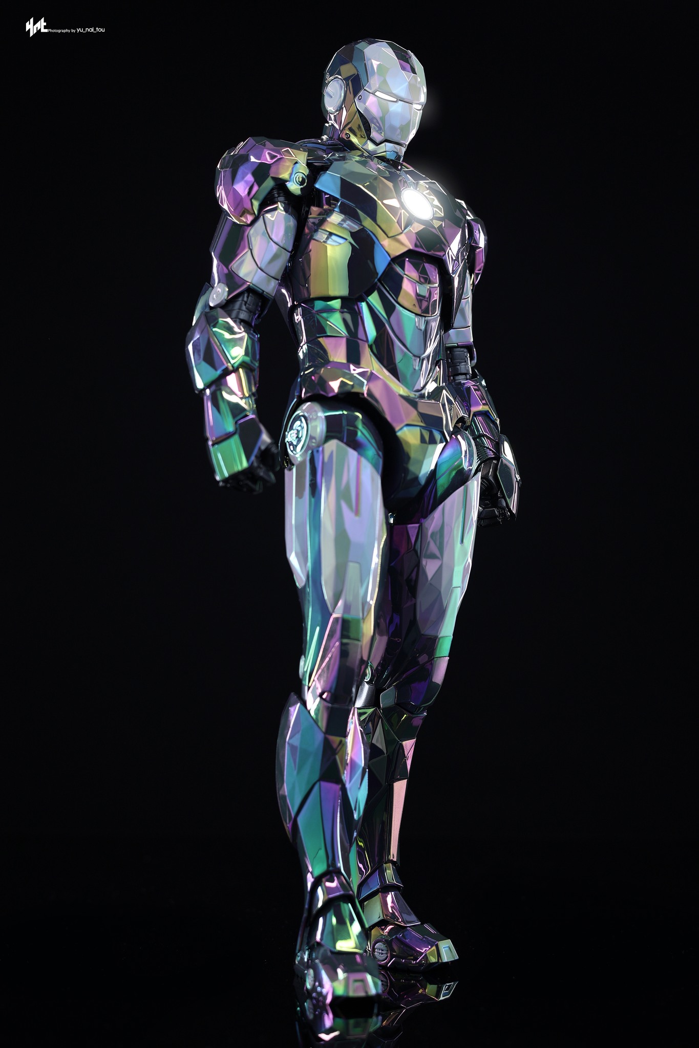 The Mark IV is constructed with die-cast components, giving the figure added weight and structural presence. The armour features an electroplated iridescent coating applied across irregular, prism-like surfaces, creating a refractive effect that shifts under lighting. LED functions are integrated throughout the suit, including the helmet eyes, Arc Reactor, and repulsors in white light, alongside blue illumination within the forearm sections.