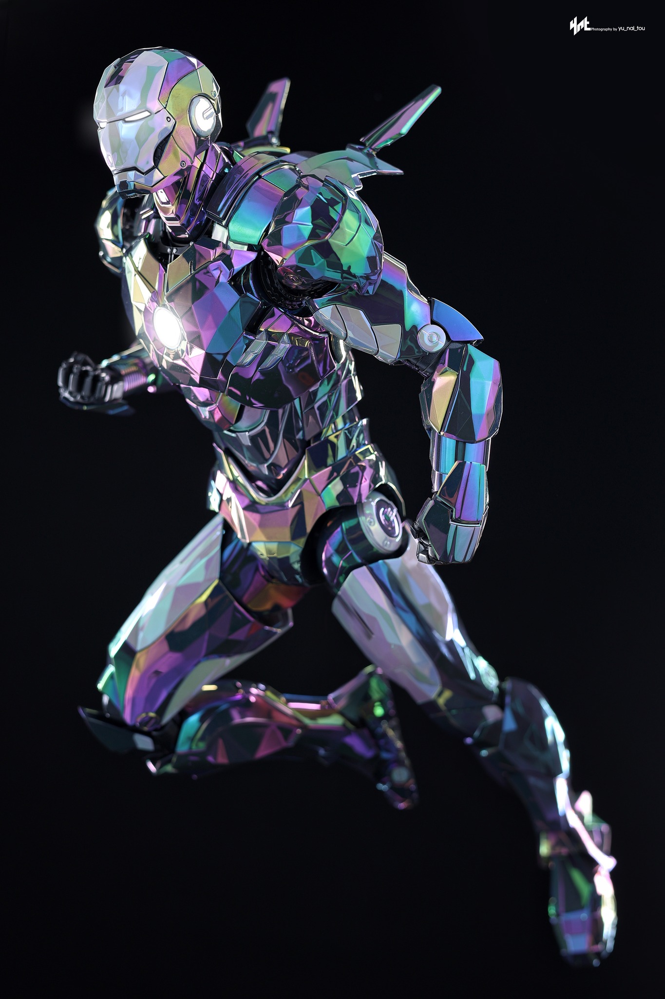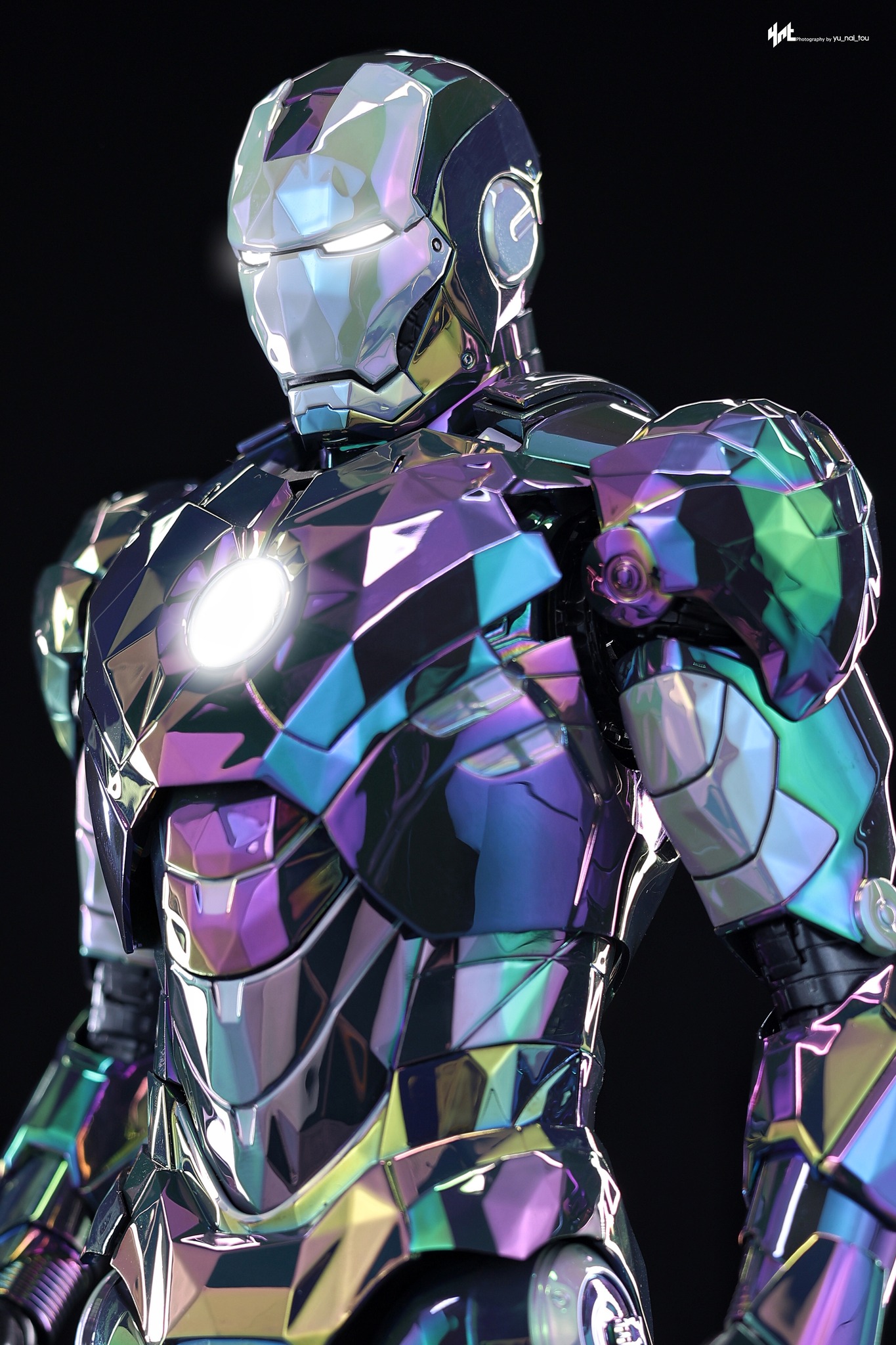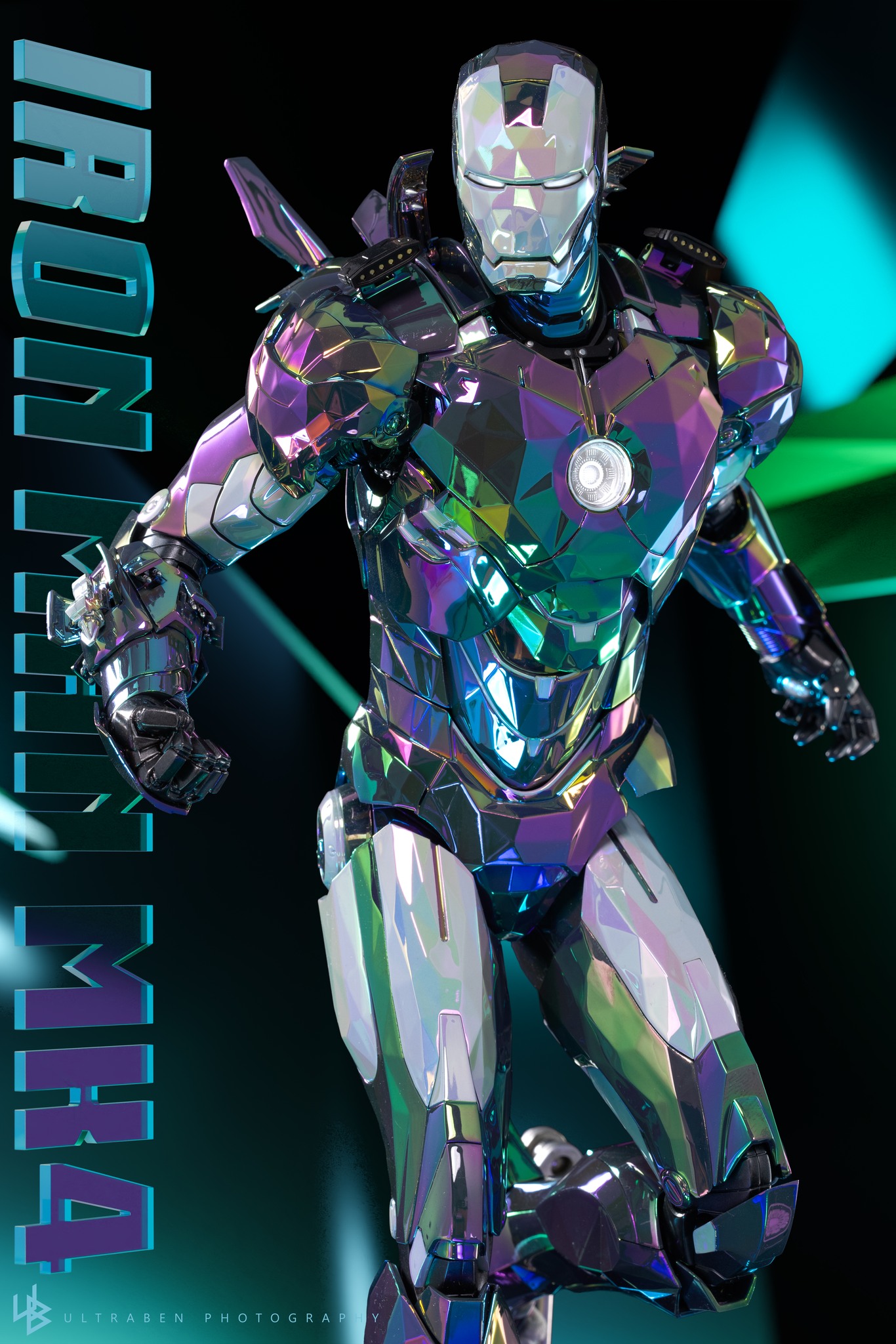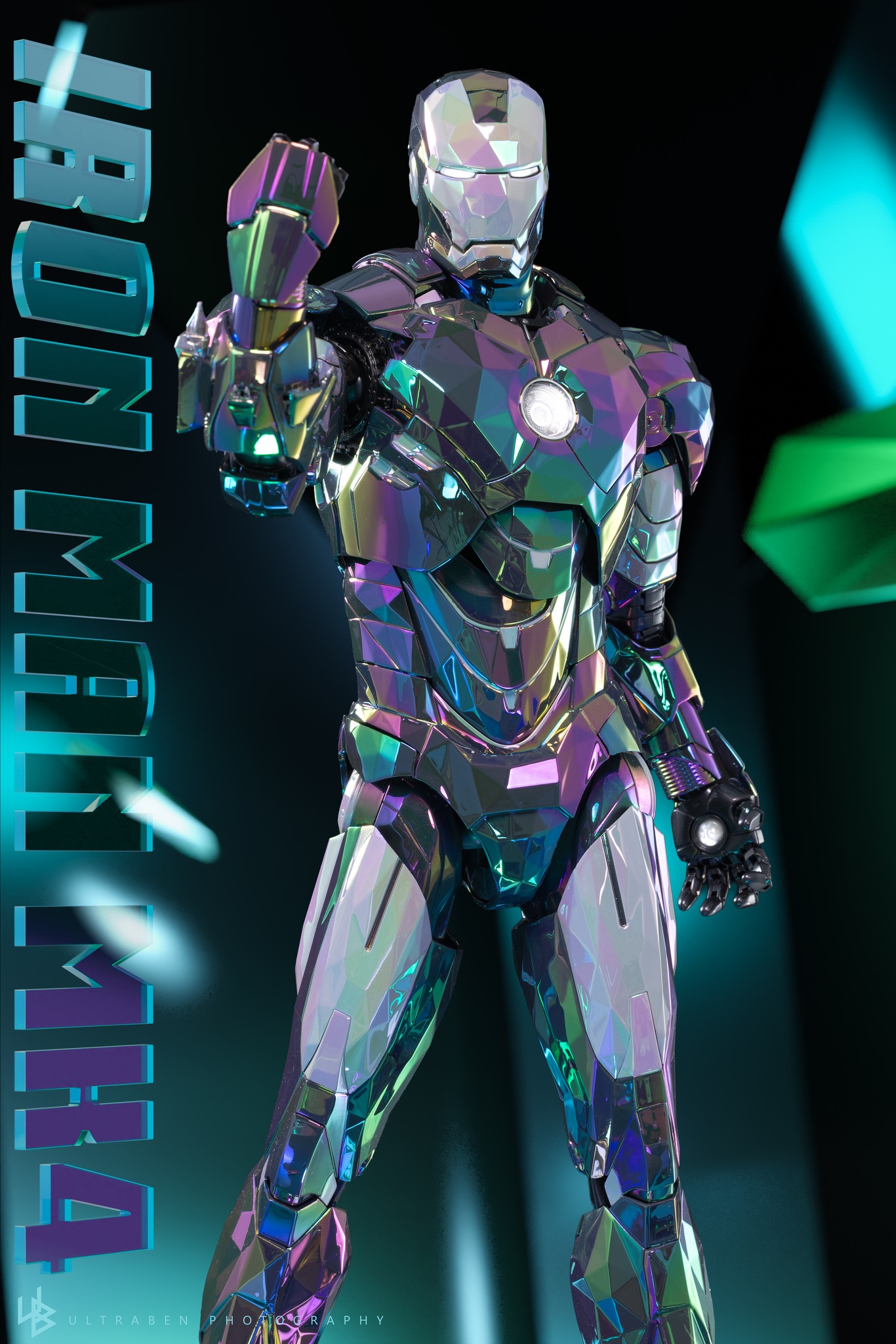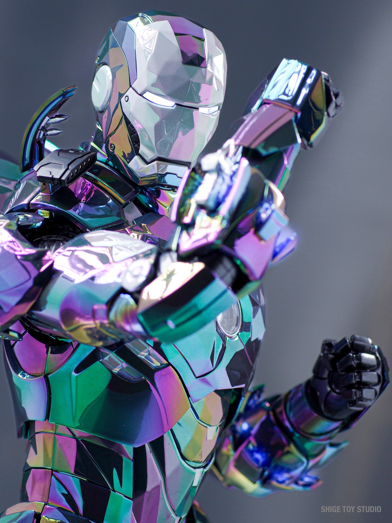The Mark IV is constructed with die-cast components, giving the figure added weight and structural presence. The armour features an electroplated iridescent coating applied across irregular, prism-like surfaces, creating a refractive effect that shifts under lighting. LED functions are integrated throughout the suit, including the helmet eyes, Arc Reactor, and repulsors in white light, alongside blue illumination within the forearm sections.