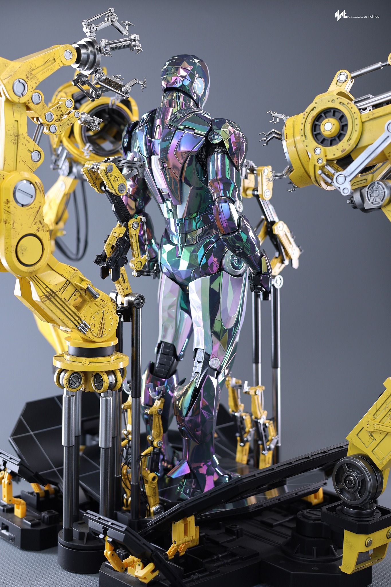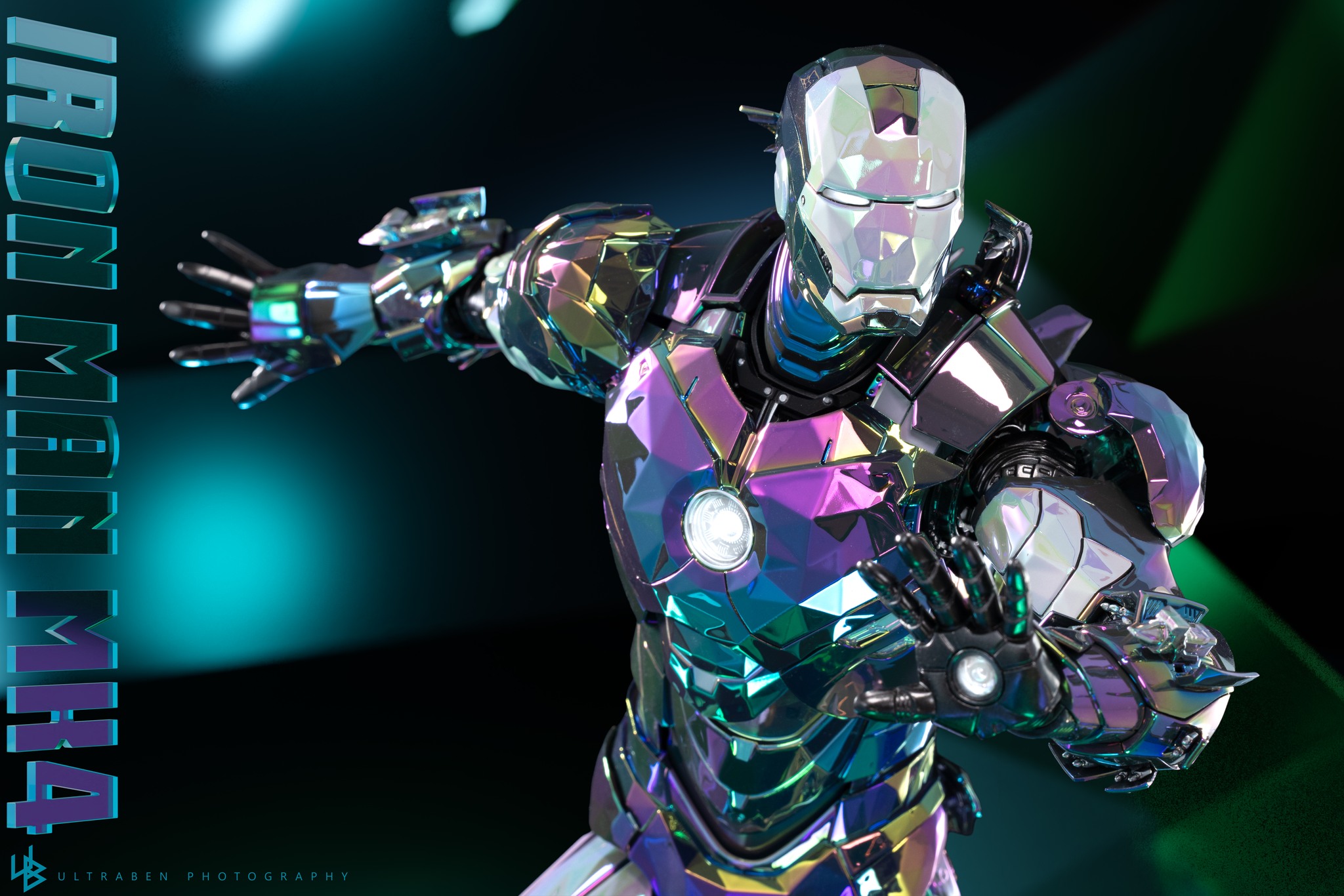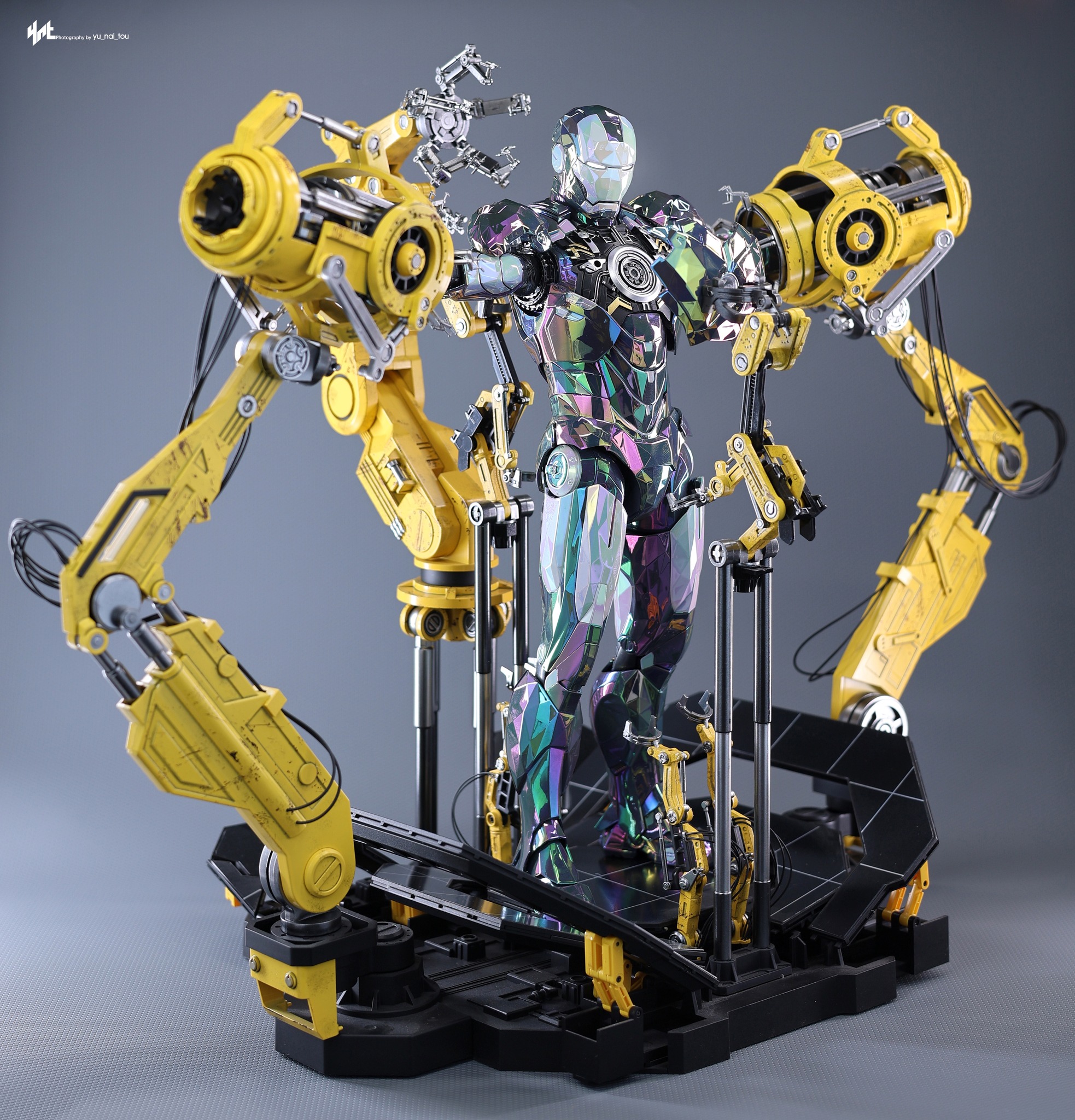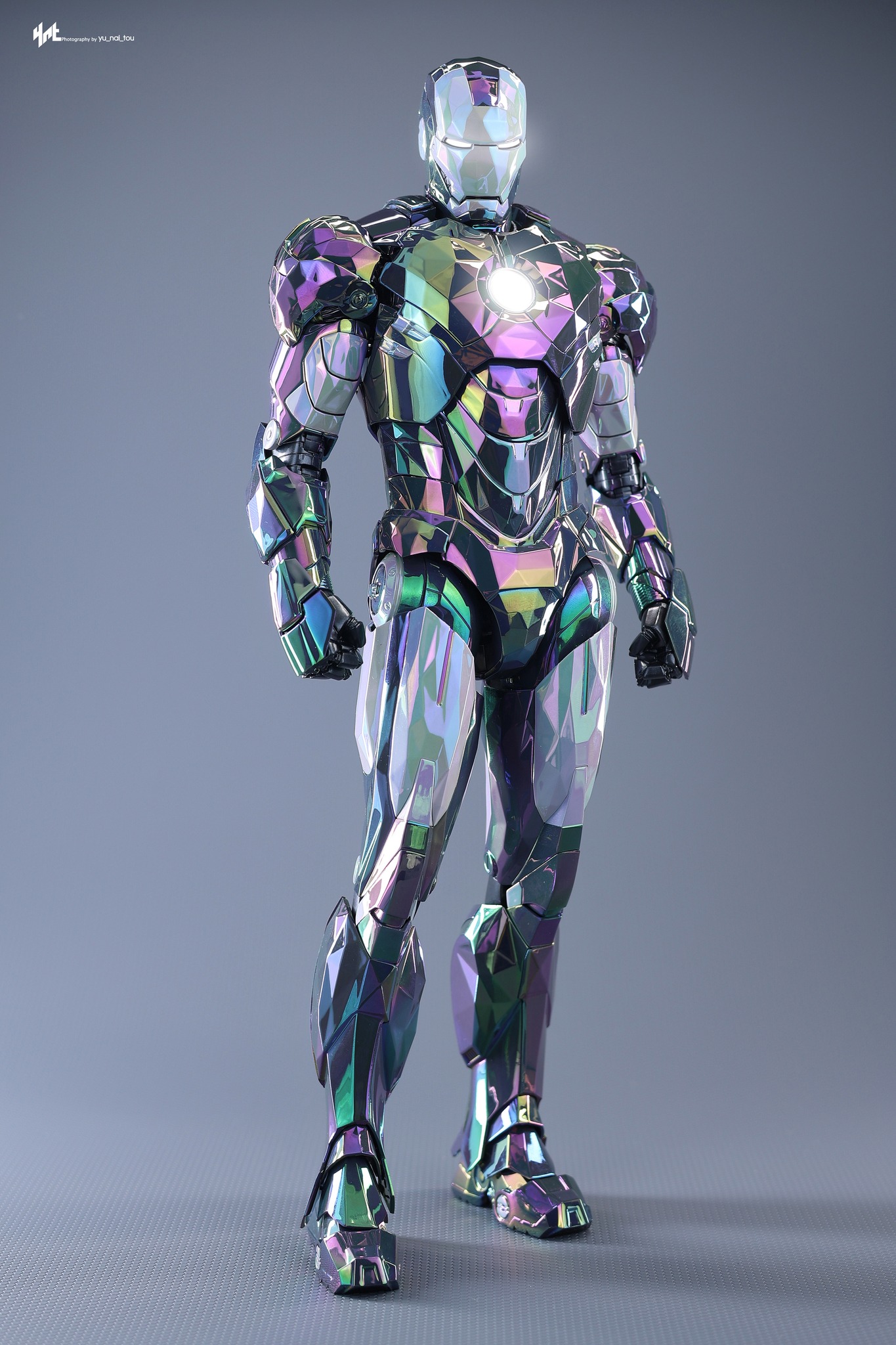 The Mark IV is constructed with die-cast components, giving the figure added weight and structural presence. The armour features an electroplated iridescent coating applied across irregular, prism-like surfaces, creating a refractive effect that shifts under lighting. LED functions are integrated throughout the suit, including the helmet eyes, Arc Reactor, and repulsors in white light, alongside blue illumination within the forearm sections.