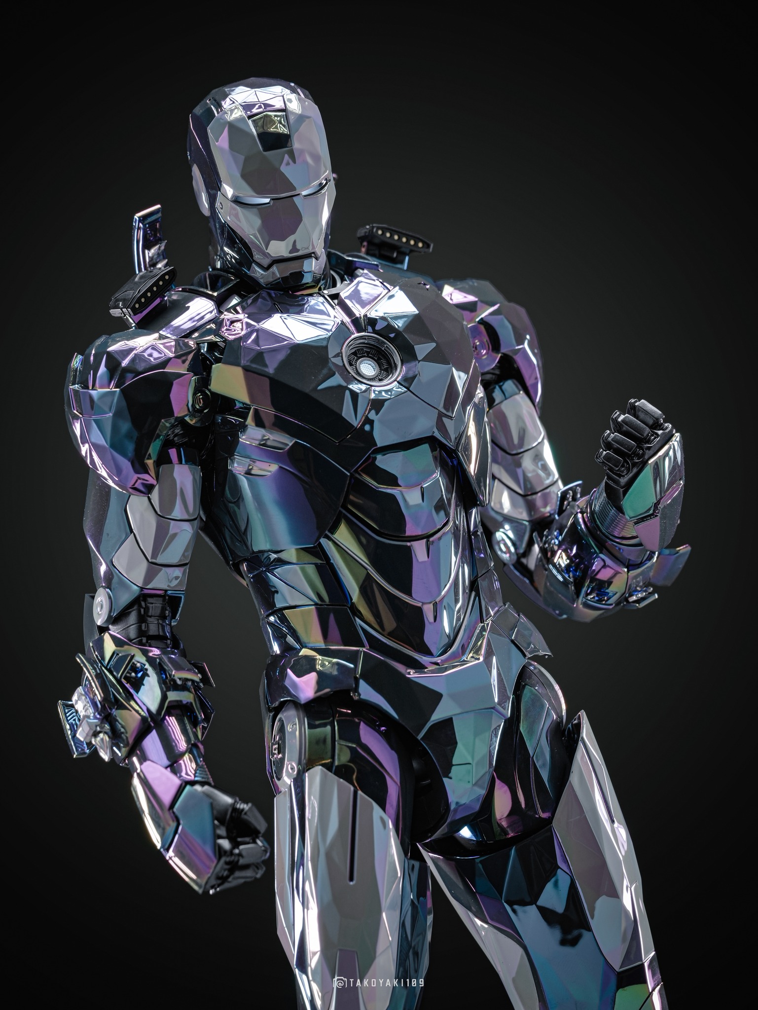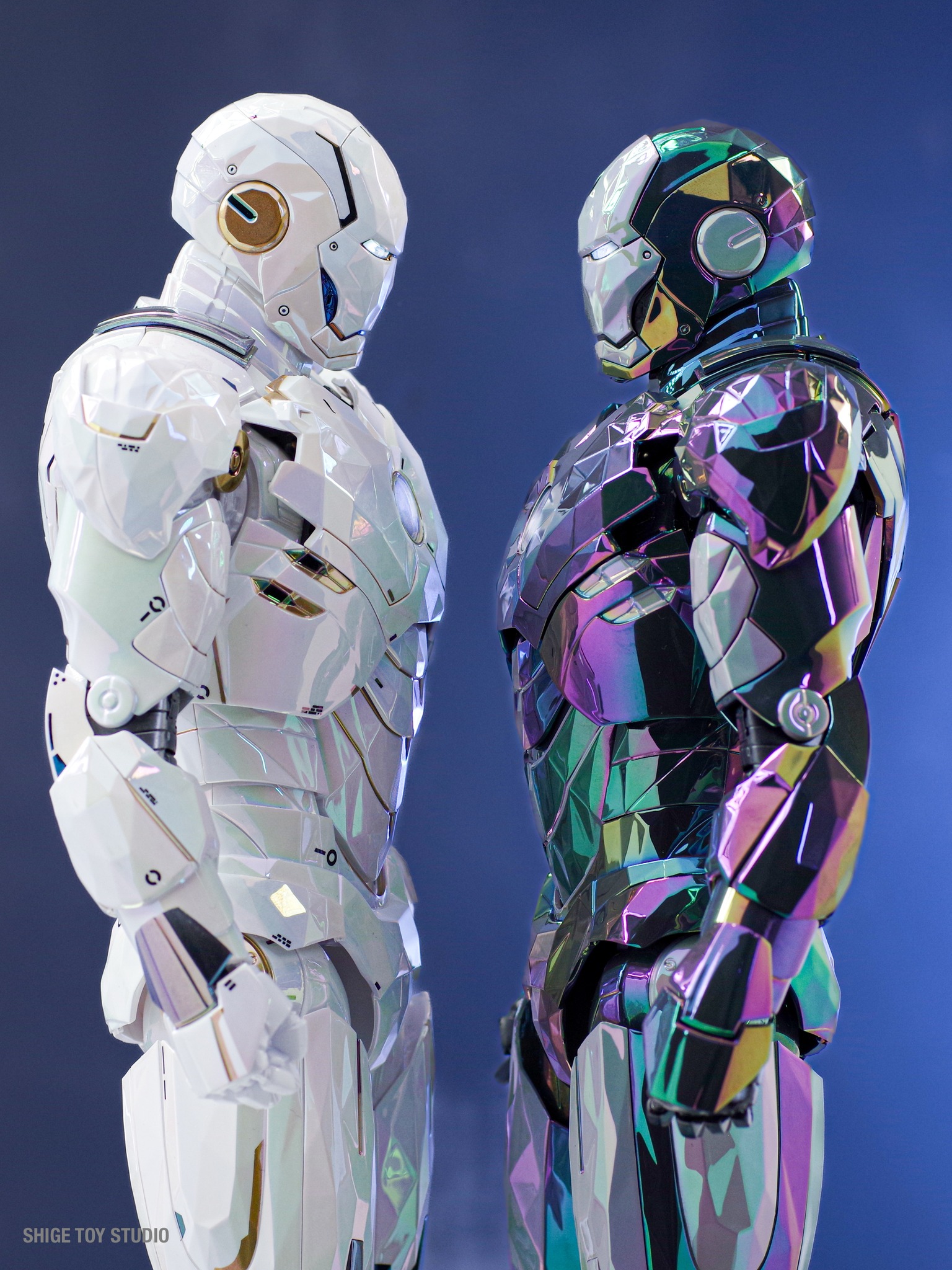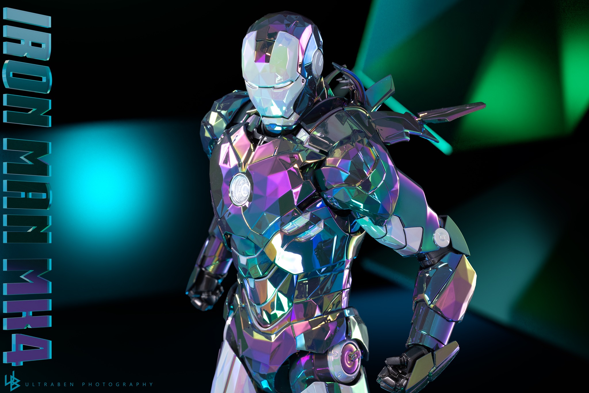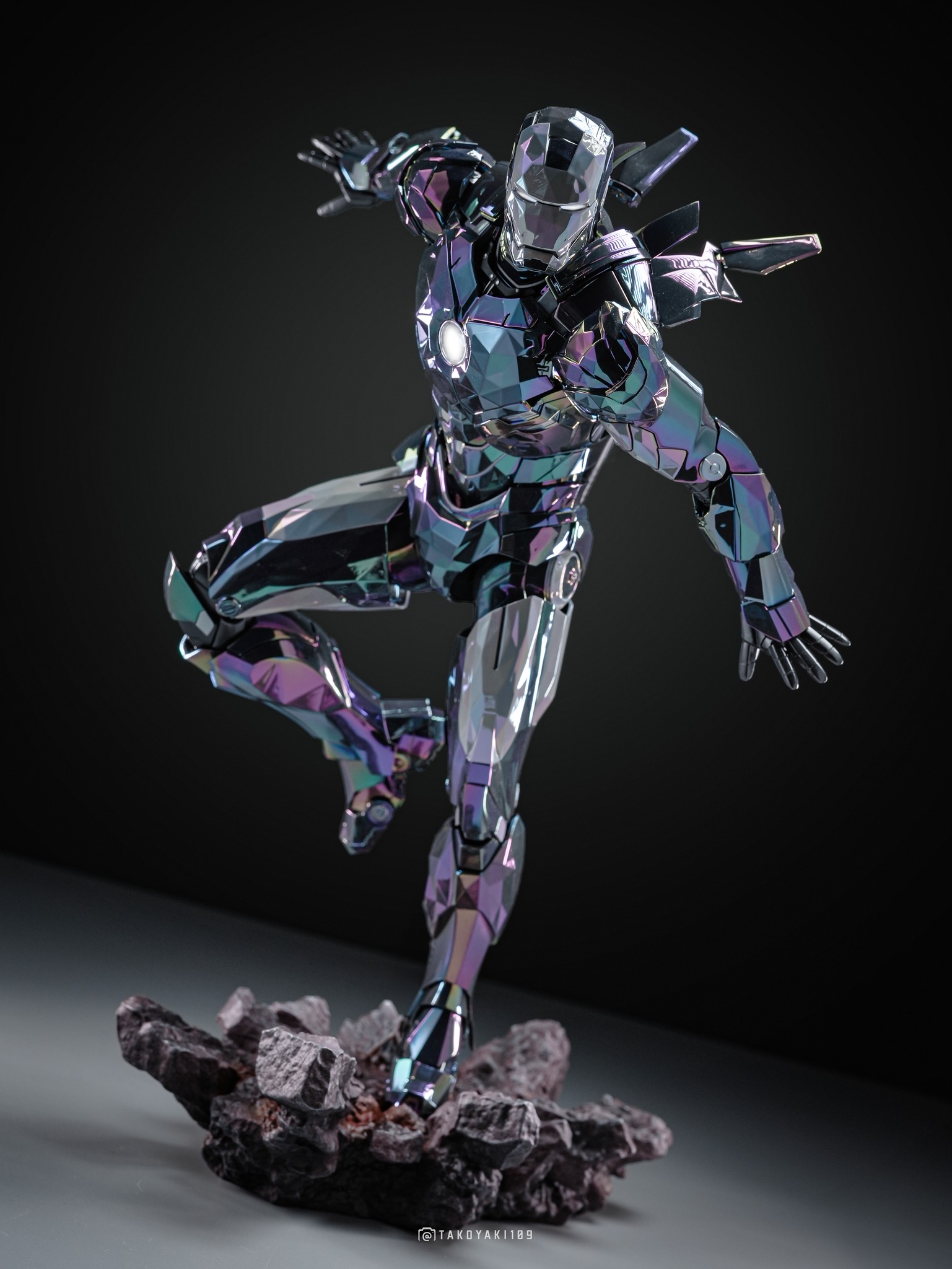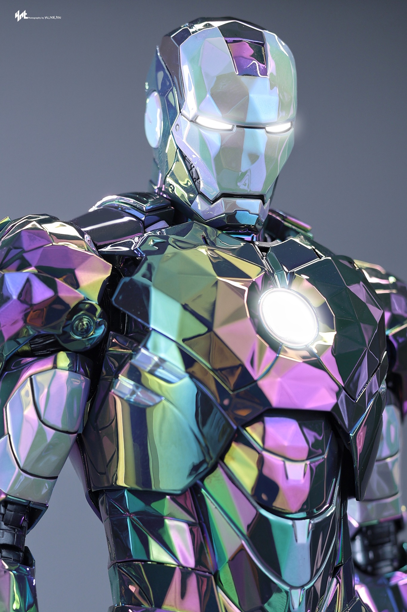 The Mark IV is constructed with die-cast components, giving the figure added weight and structural presence. The armour features an electroplated iridescent coating applied across irregular, prism-like surfaces, creating a refractive effect that shifts under lighting. LED functions are integrated throughout the suit, including the helmet eyes, Arc Reactor, and repulsors in white light, alongside blue illumination within the forearm sections.