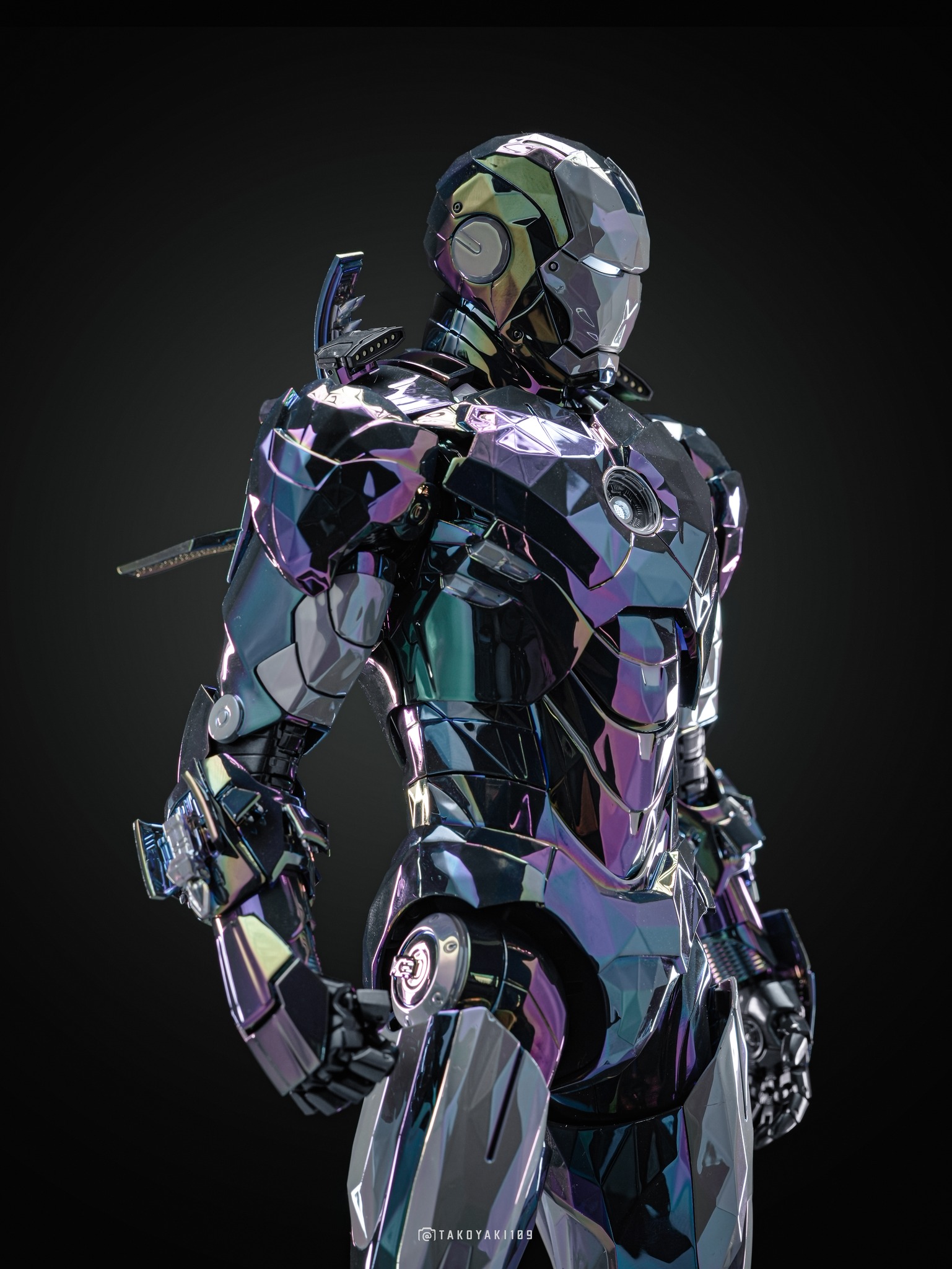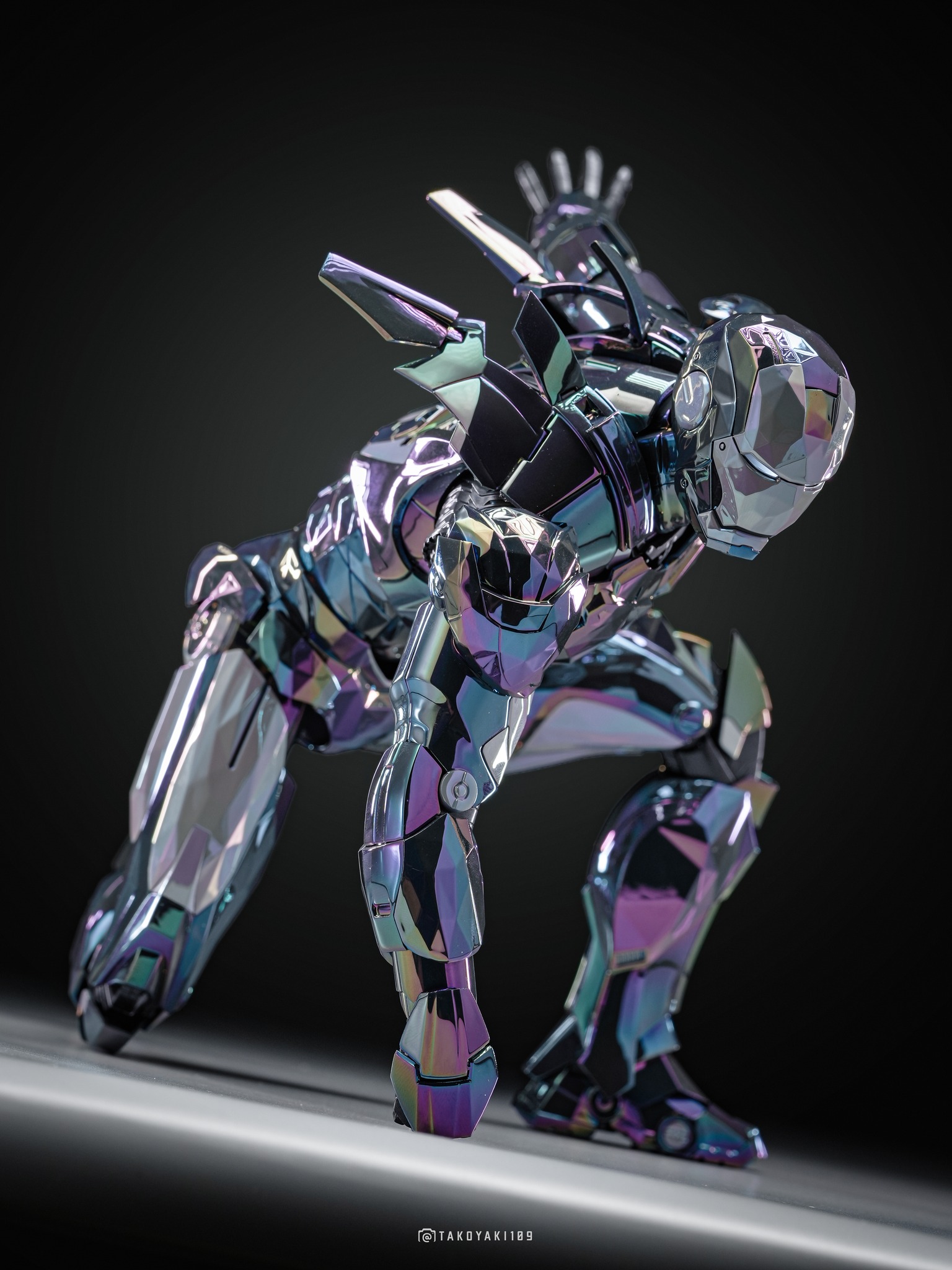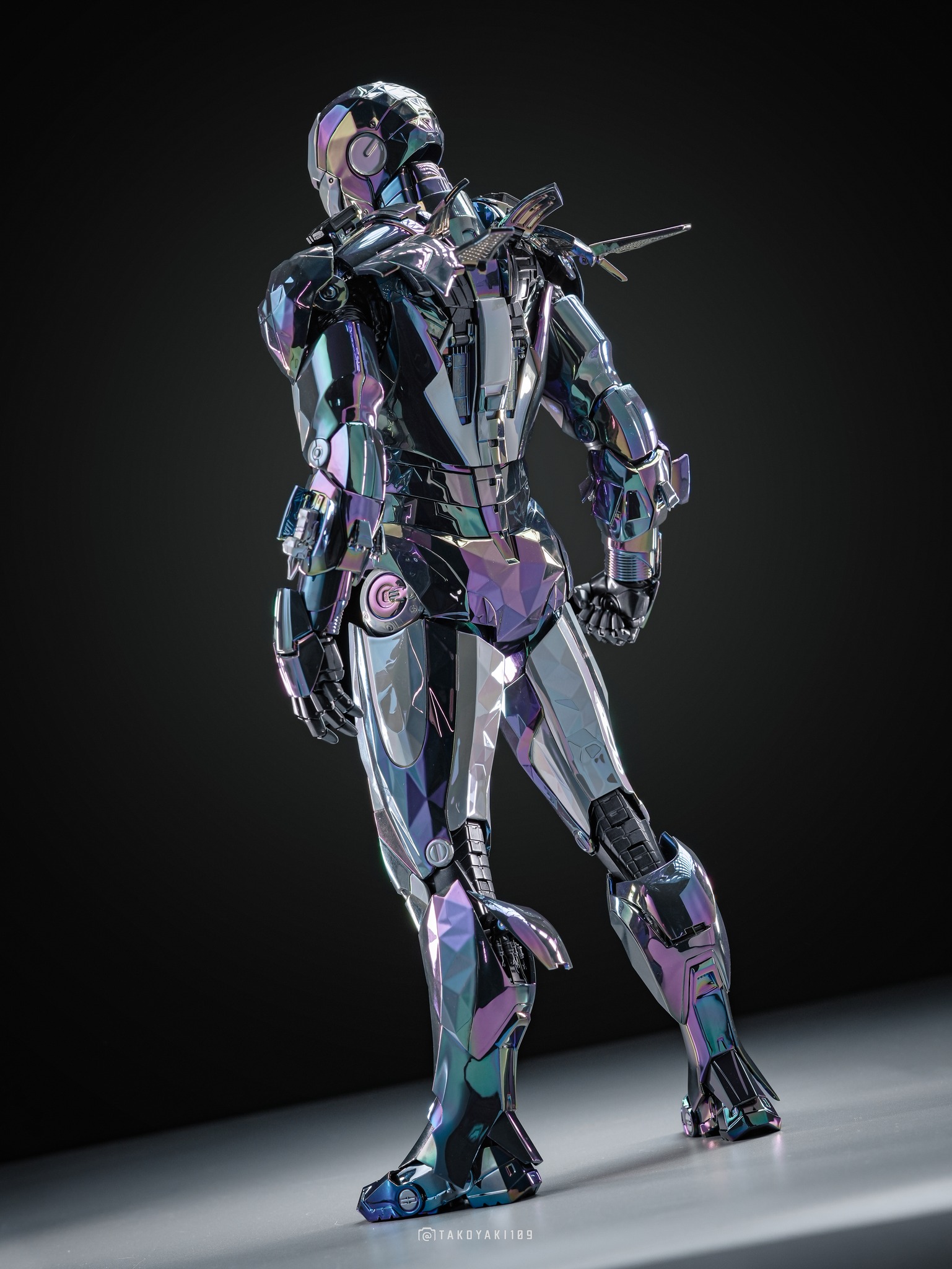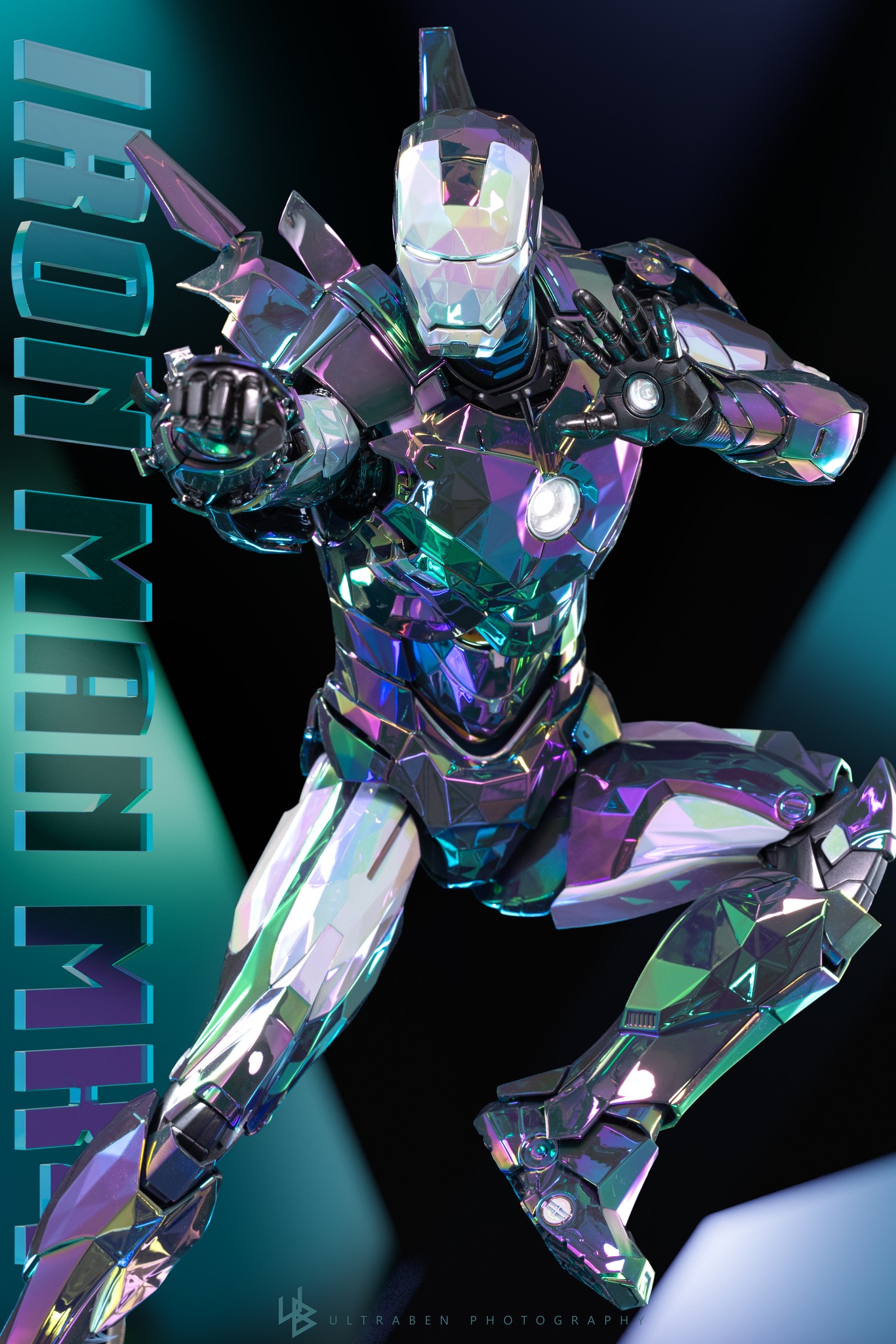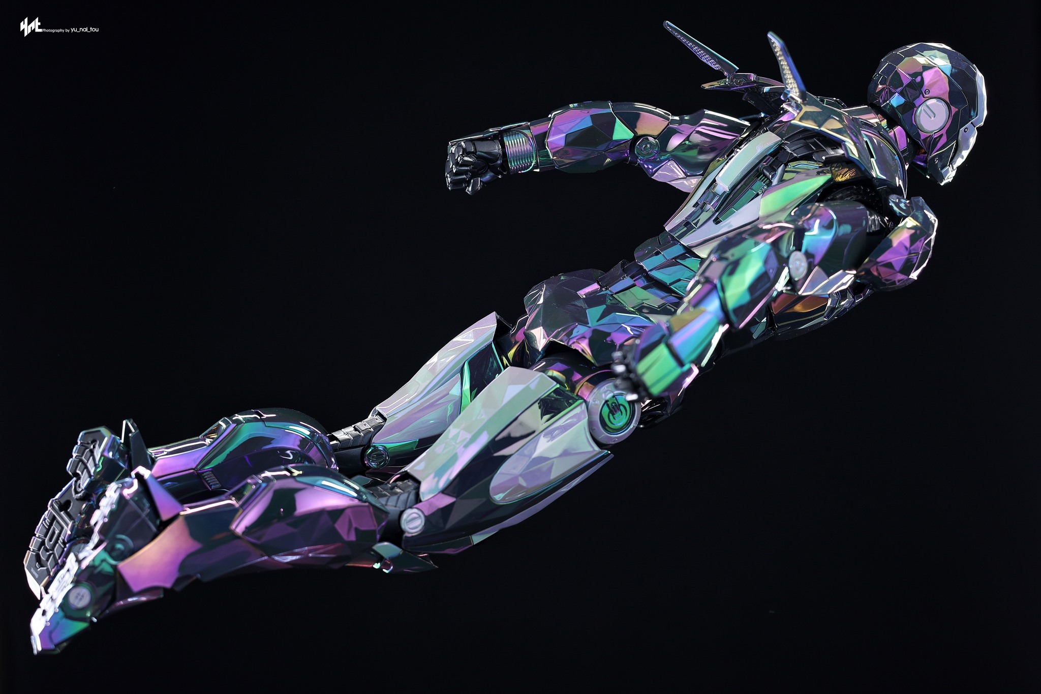 The Mark IV is constructed with die-cast components, giving the figure added weight and structural presence. The armour features an electroplated iridescent coating applied across irregular, prism-like surfaces, creating a refractive effect that shifts under lighting. LED functions are integrated throughout the suit, including the helmet eyes, Arc Reactor, and repulsors in white light, alongside blue illumination within the forearm sections.
