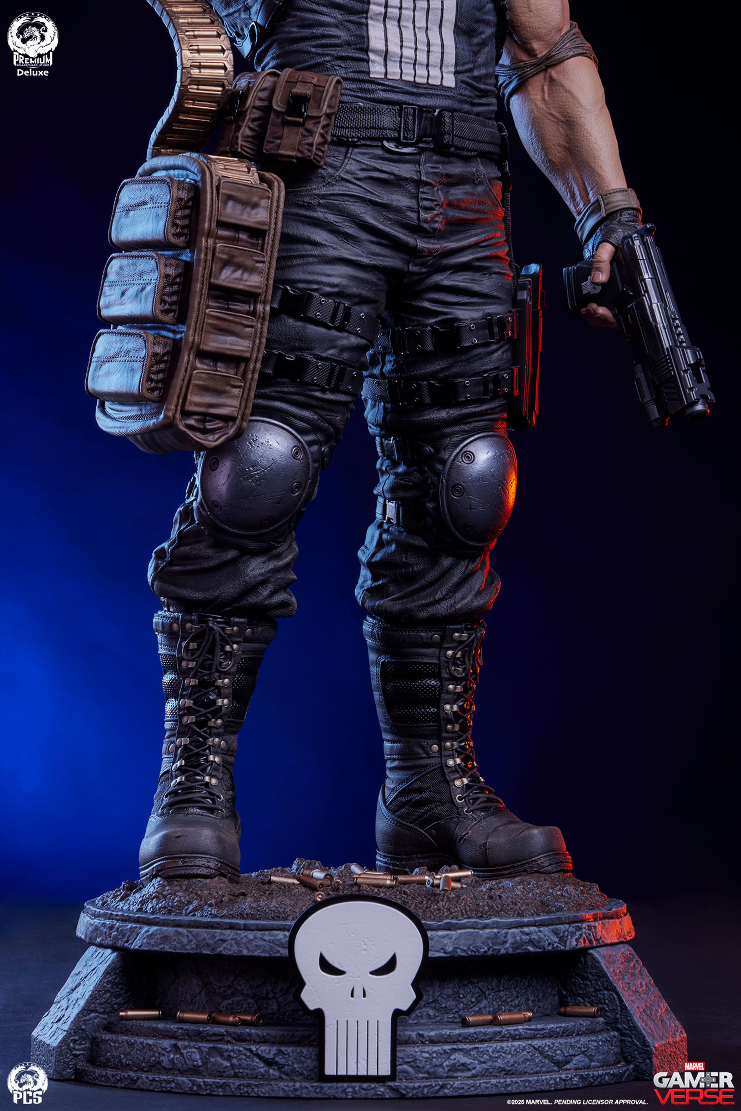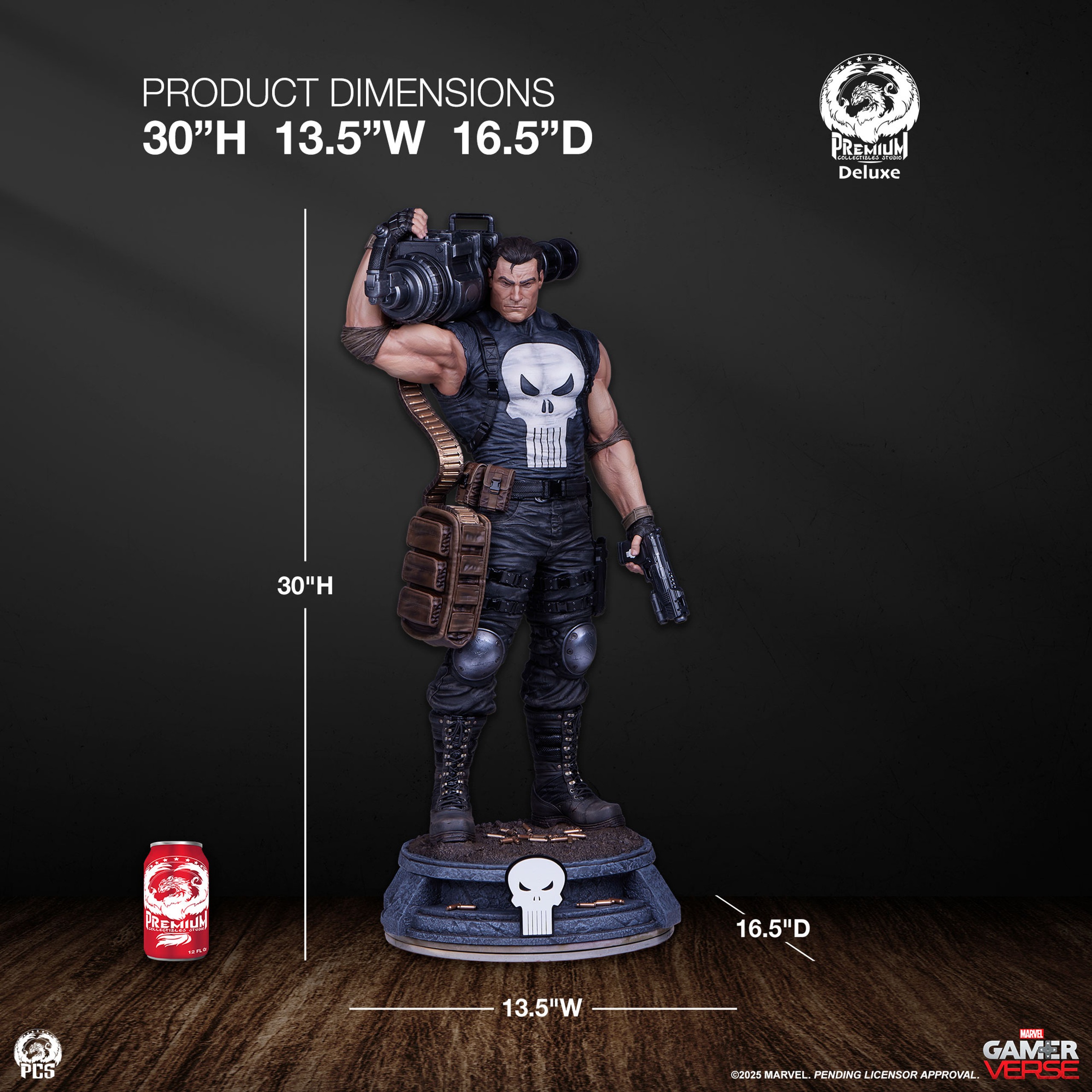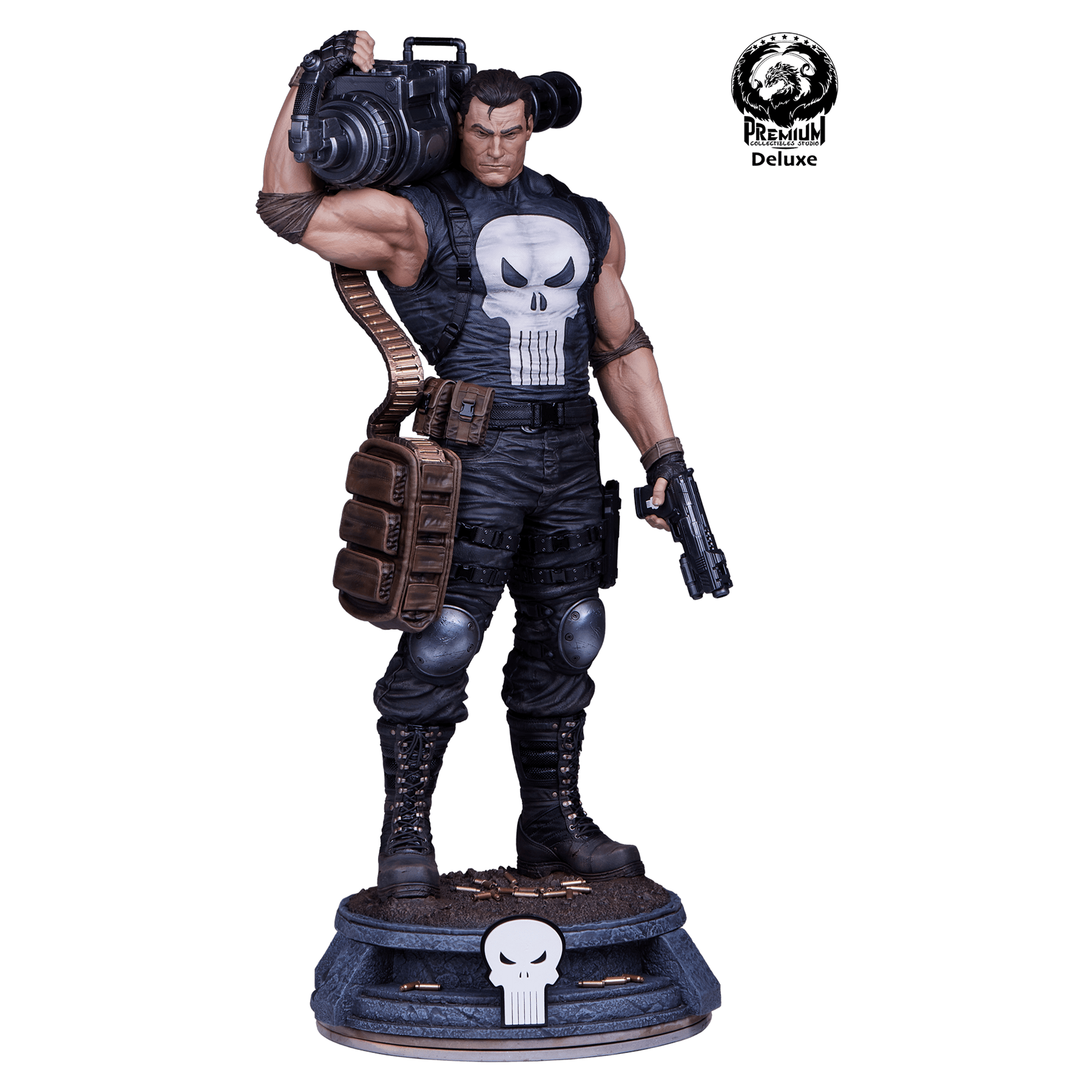 The Deluxe Edition increases the height to roughly 30 inches, with dimensions of 30โH ร 13.5โW ร 16.5โD, and has a more limited edition size of 150. This version adds further swap-out components: a large mini-gun carried over the right shoulder, an oversized ammo pouch for the right thigh, and a left-arm option holding a Punisher-branded sidearm. The retail price is USD 1599, with the same estimated shipping period.