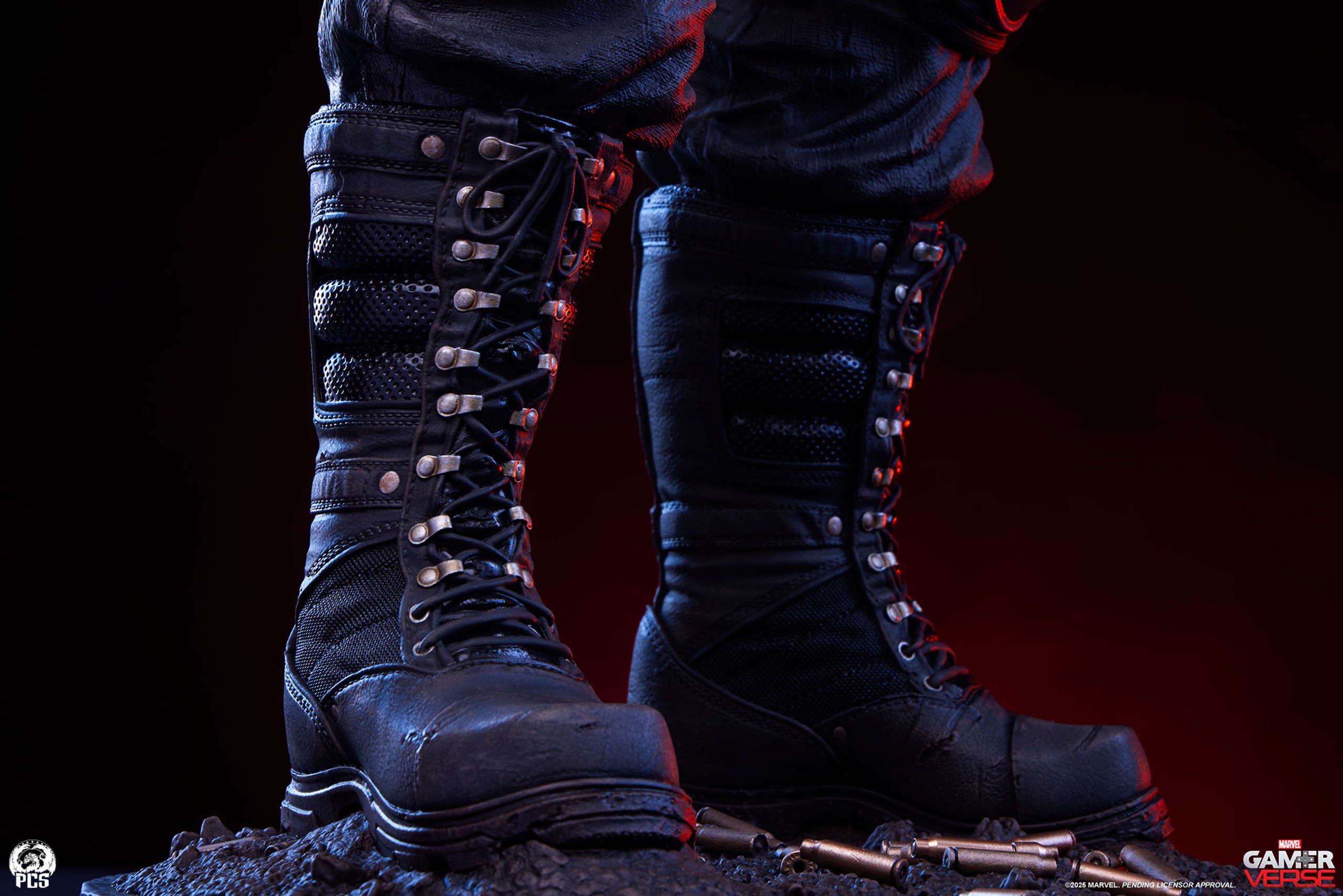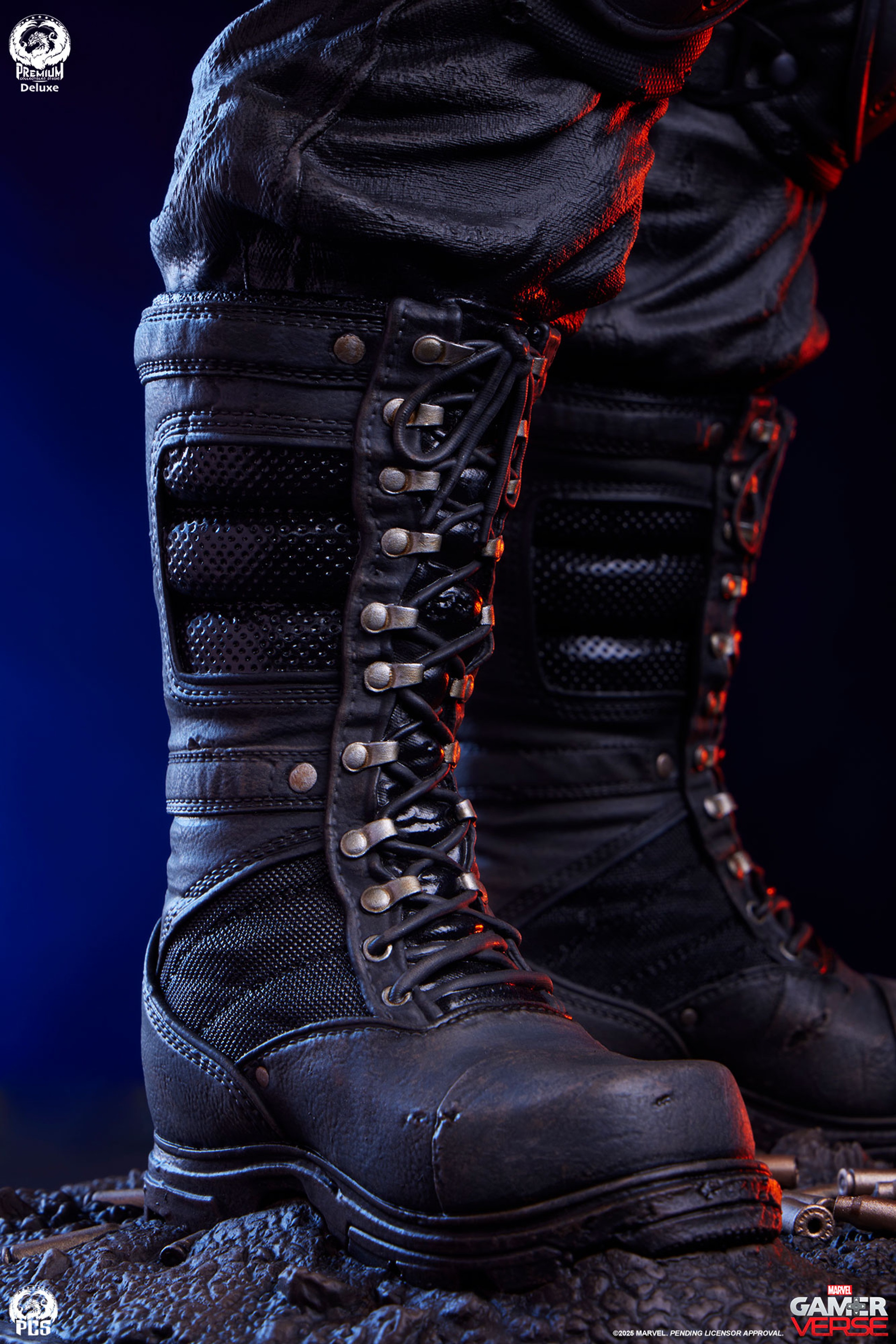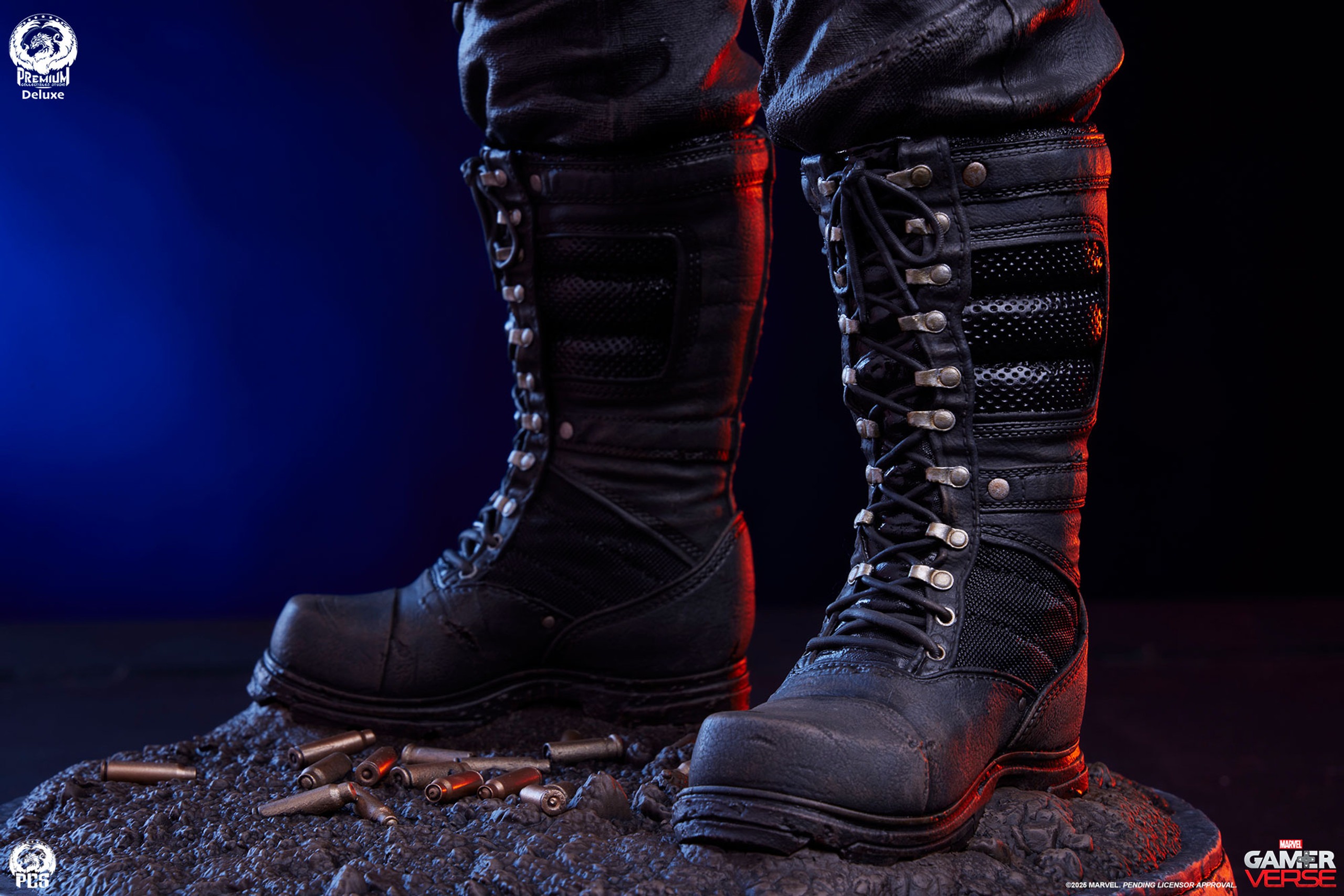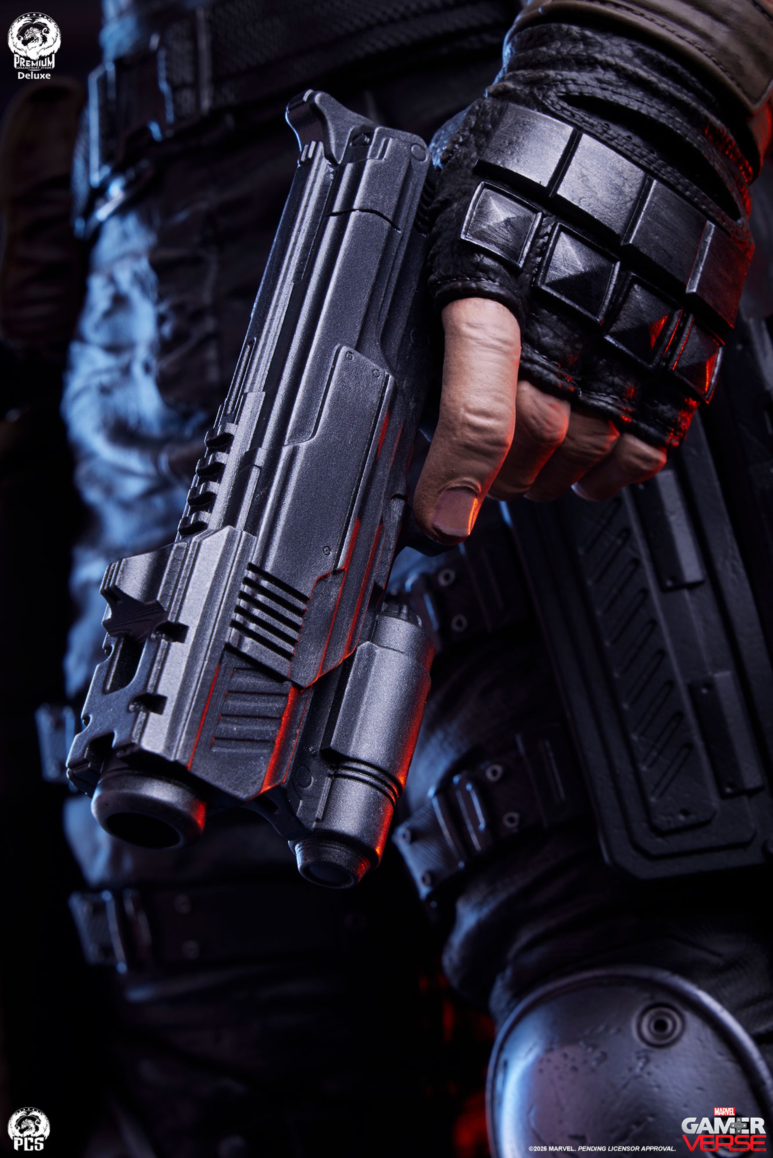 The Deluxe Edition increases the height to roughly 30 inches, with dimensions of 30โH ร 13.5โW ร 16.5โD, and has a more limited edition size of 150. This version adds further swap-out components: a large mini-gun carried over the right shoulder, an oversized ammo pouch for the right thigh, and a left-arm option holding a Punisher-branded sidearm. The retail price is USD 1599, with the same estimated shipping period.