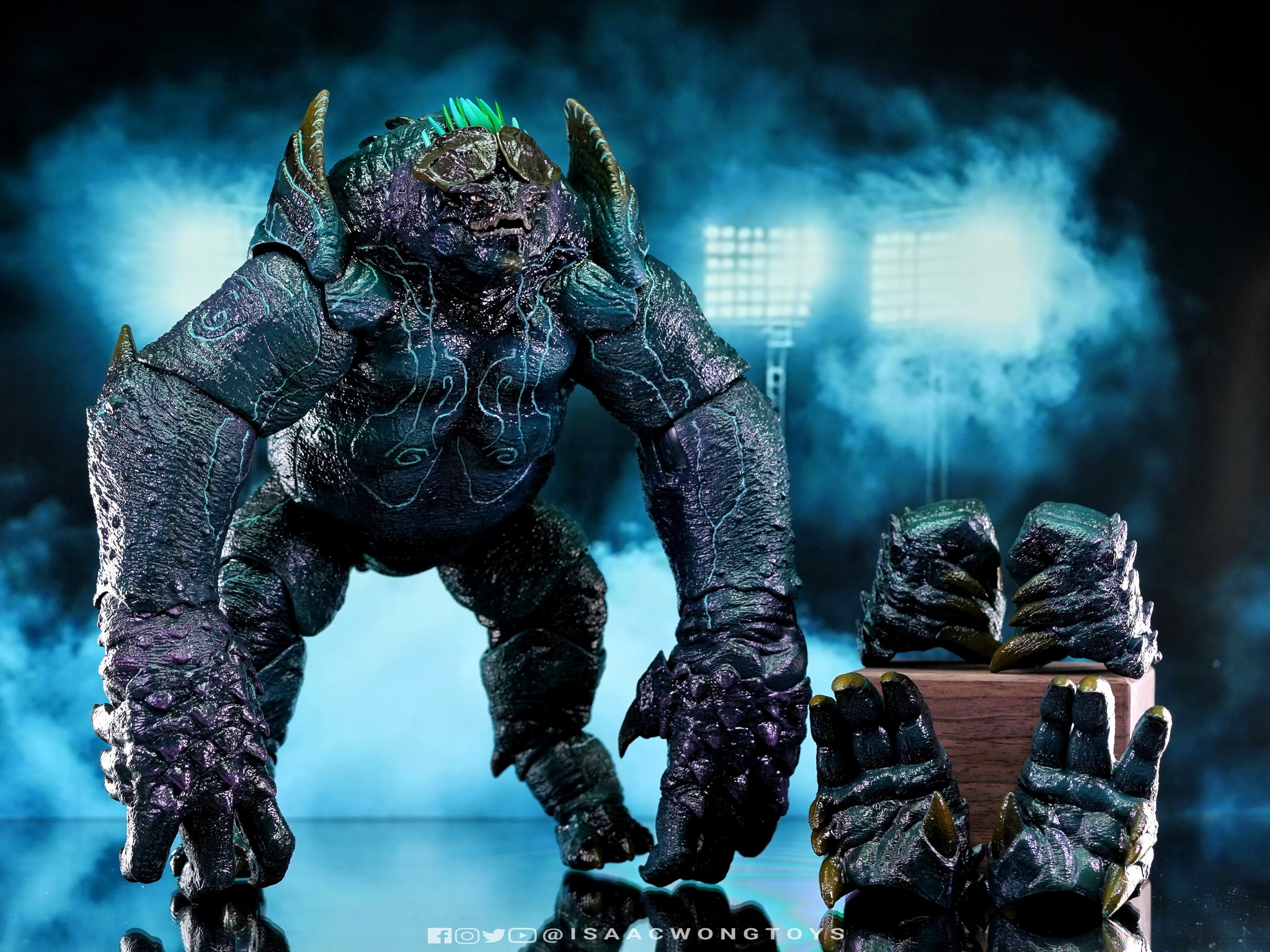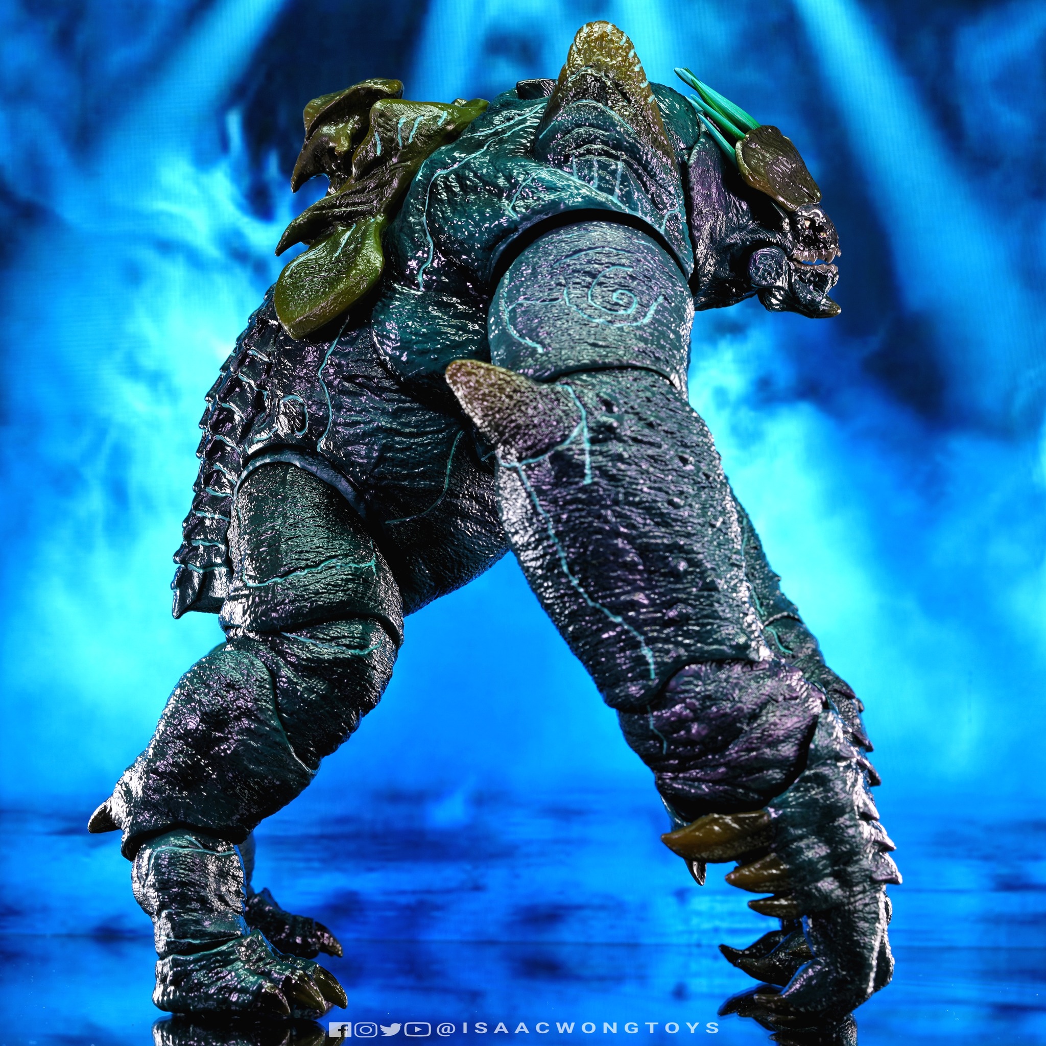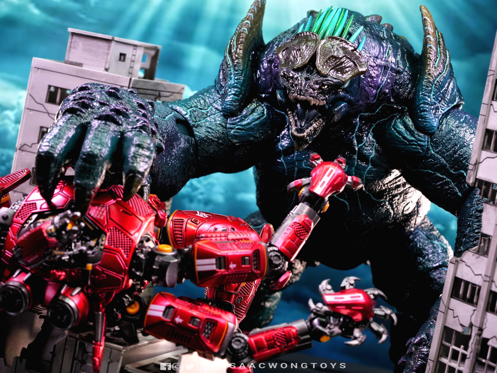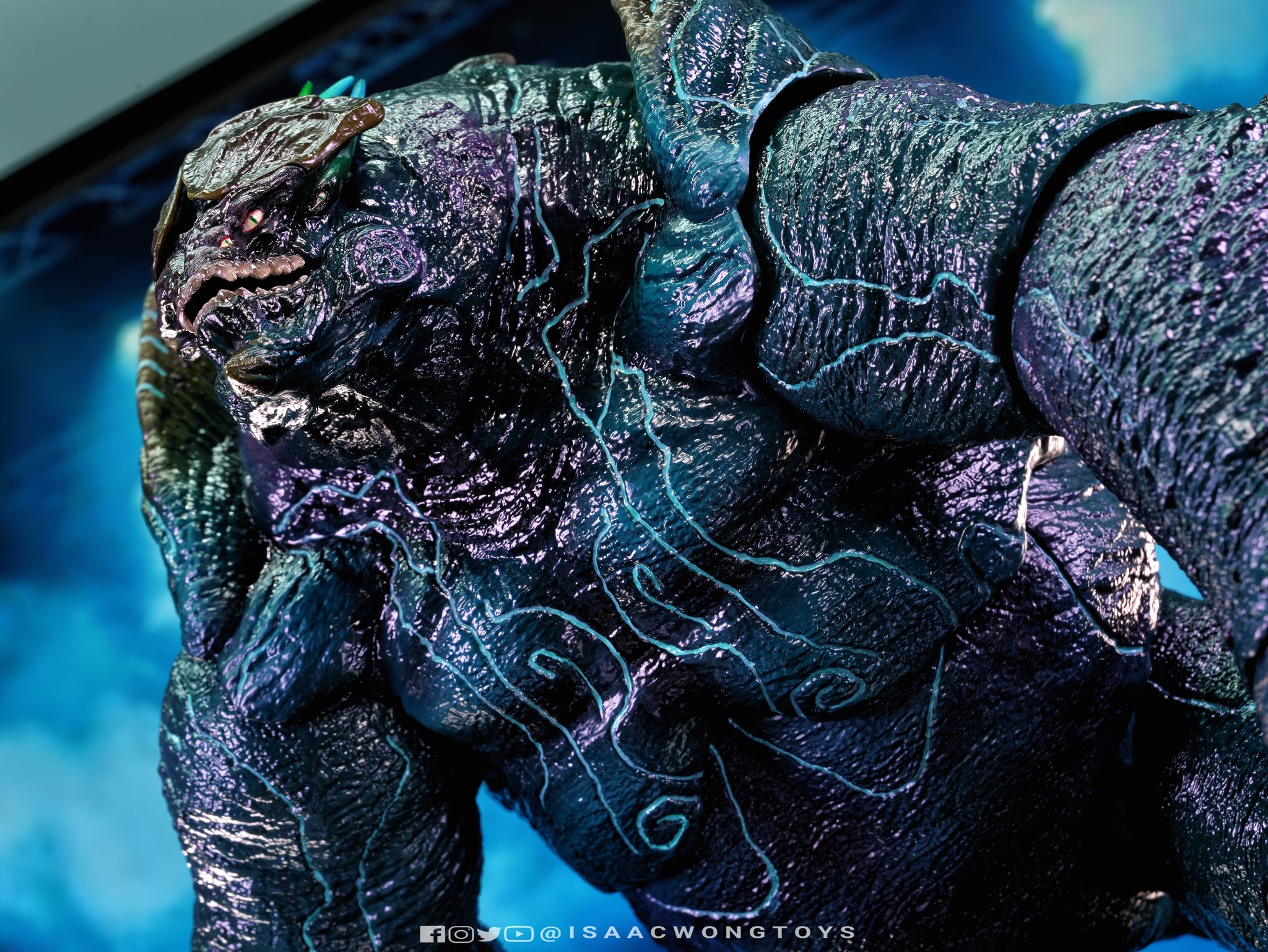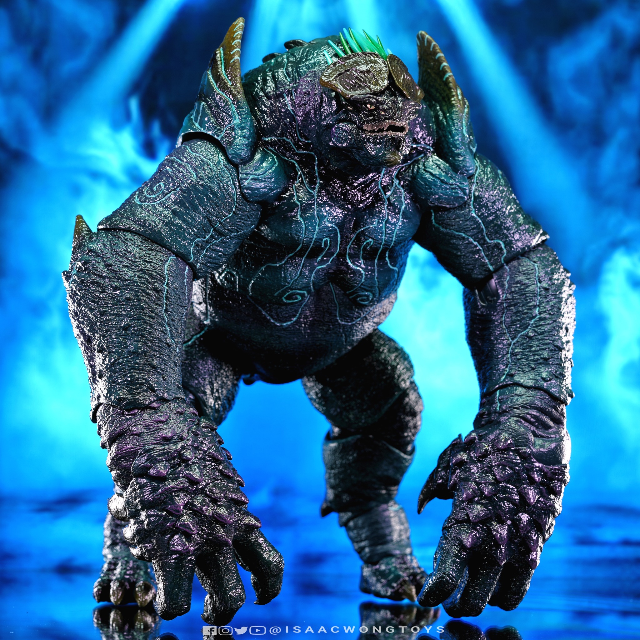 The figure arrives in packaging notably larger than that of Crimson Typhoon and Gipsy Danger, reflecting the creature’s mass within the line. Once removed, the sculpt shows a head proportion significantly larger than earlier consumer iterations such as the NECA version. The body carries substantial weight, and articulation across the head, arms and legs allows more posing flexibility than expected for a creature of this structure.