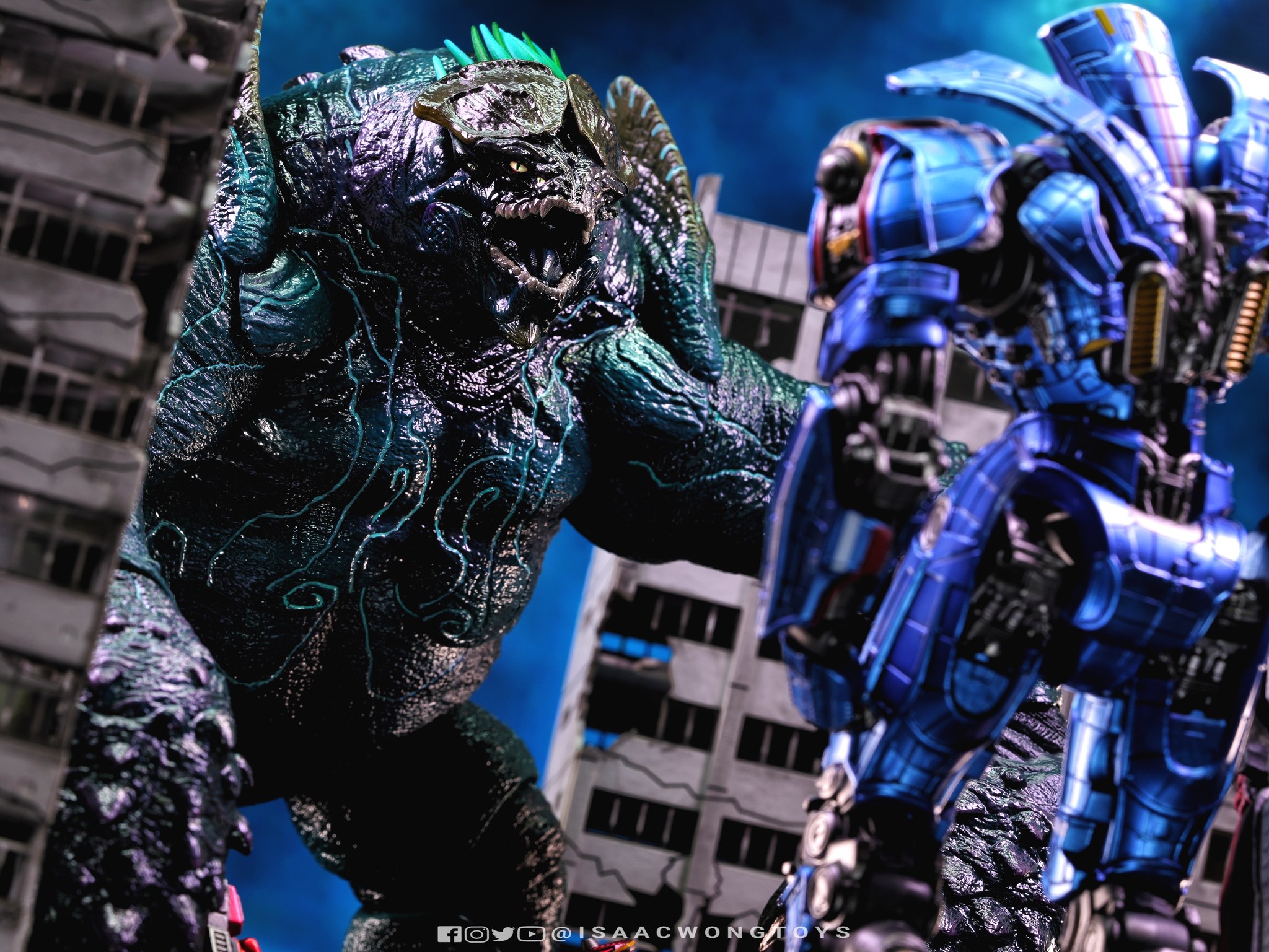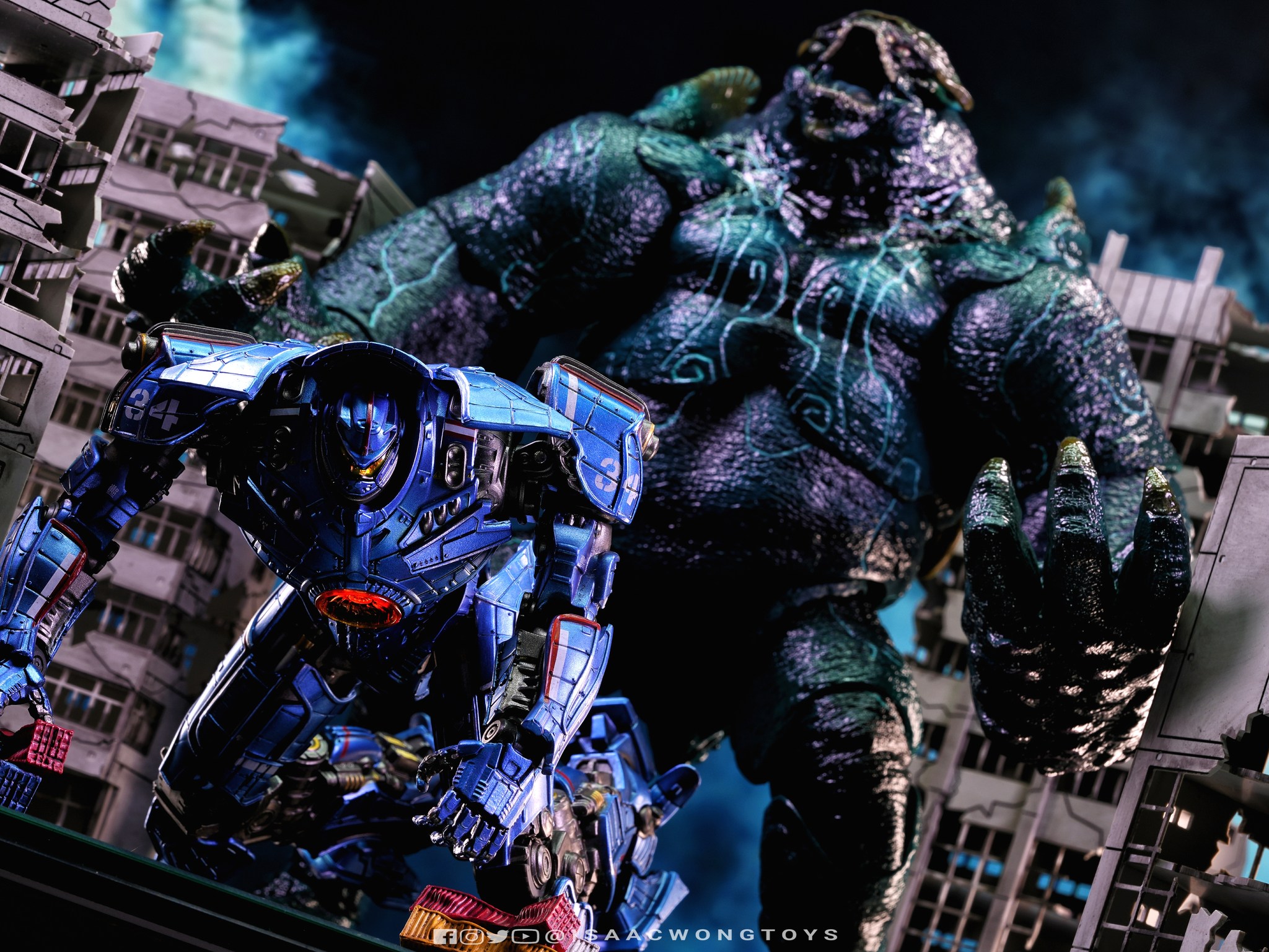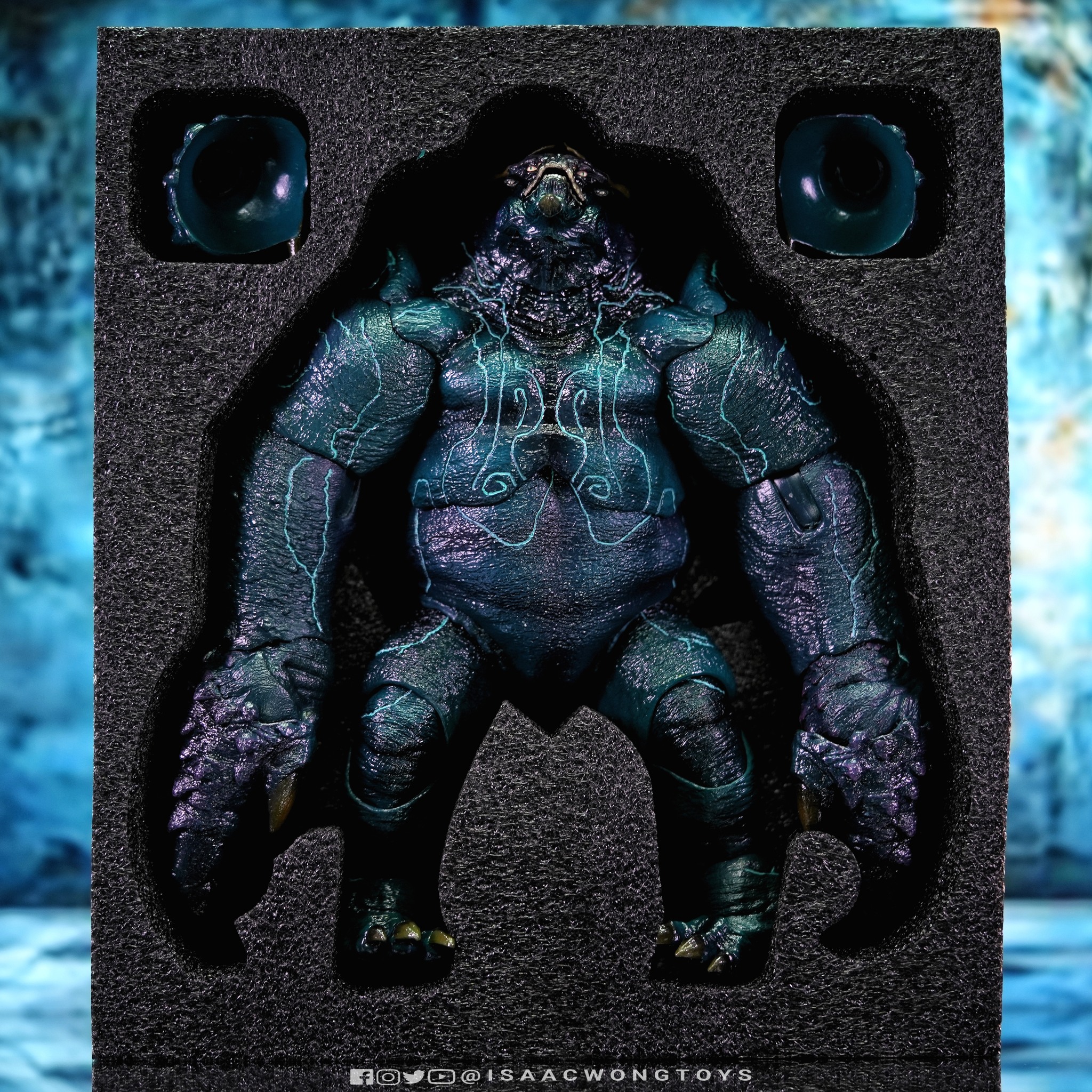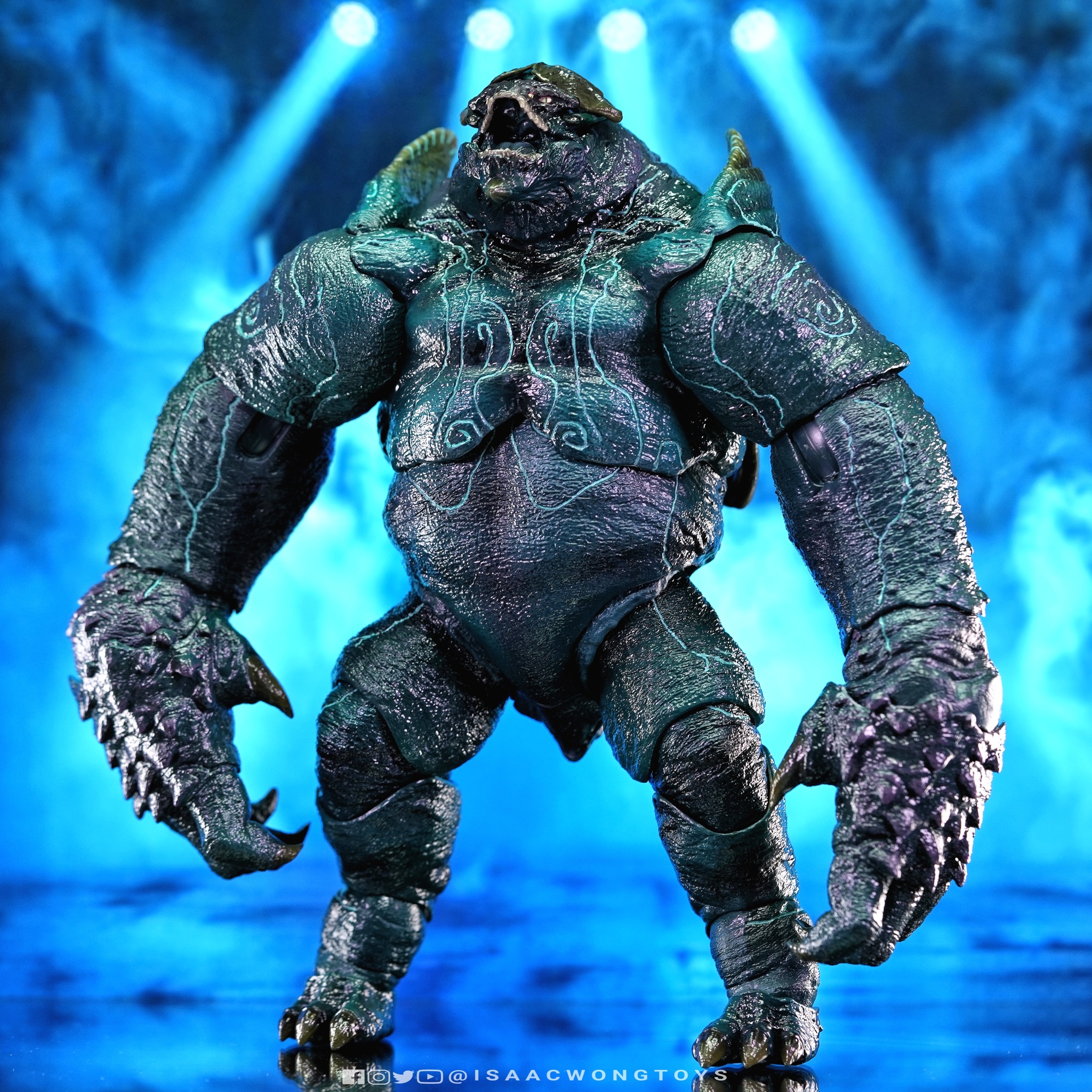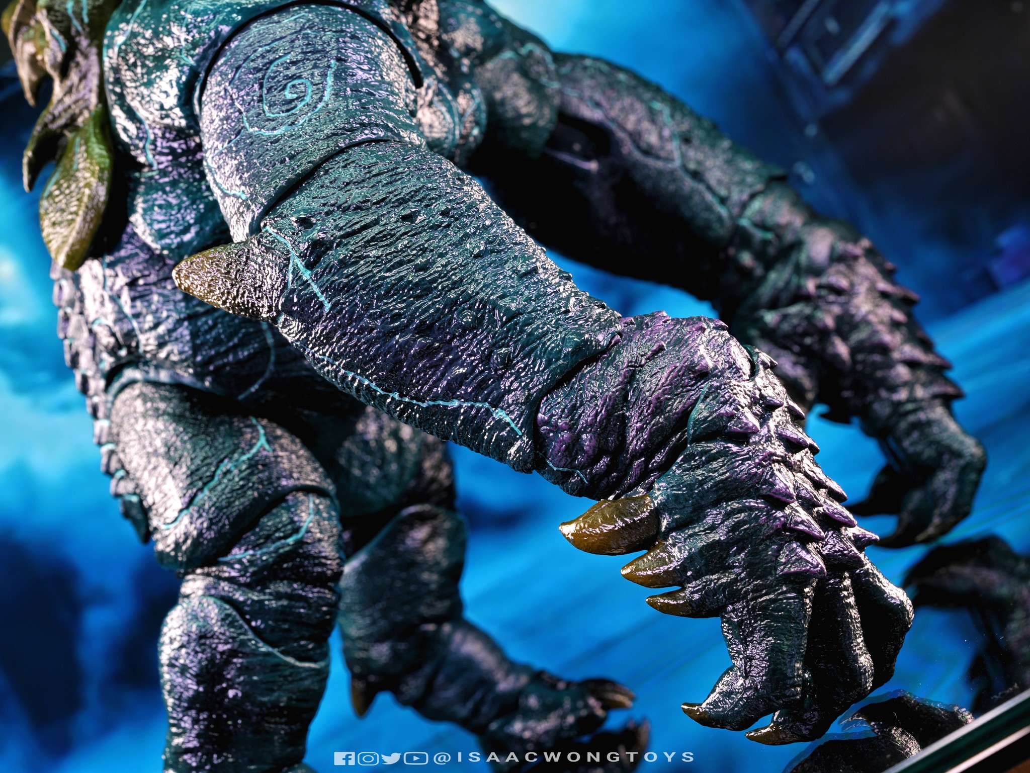 The figure arrives in packaging notably larger than that of Crimson Typhoon and Gipsy Danger, reflecting the creature’s mass within the line. Once removed, the sculpt shows a head proportion significantly larger than earlier consumer iterations such as the NECA version. The body carries substantial weight, and articulation across the head, arms and legs allows more posing flexibility than expected for a creature of this structure.