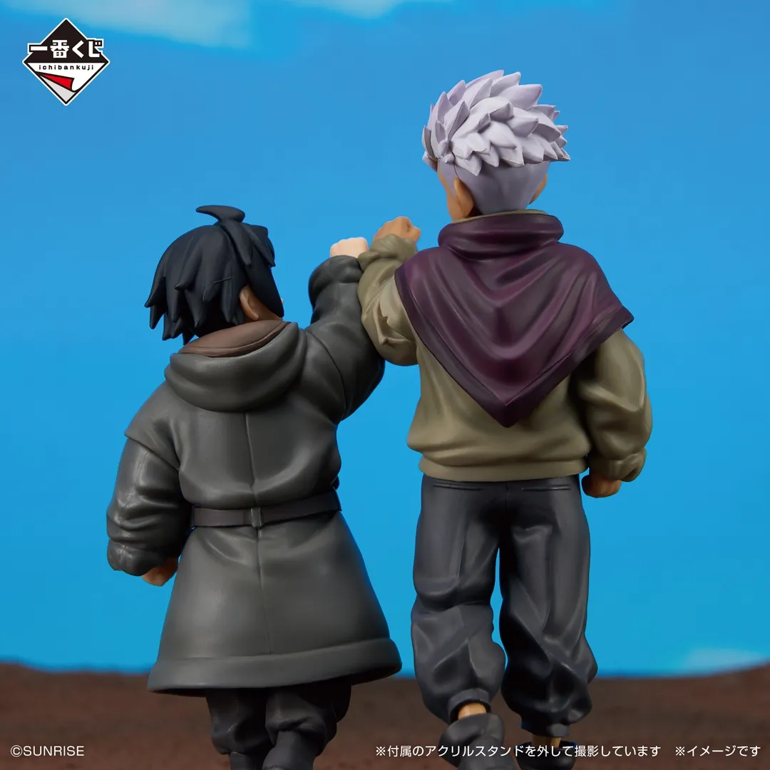 Prize B features a Mikazuki Augus and Orga Itsuka figure set, standing approximately 18 cm tall as a single variant. The figures depict the characters in their childhood, accompanied by acrylic stands representing their adult forms, highlighting their development and connection.