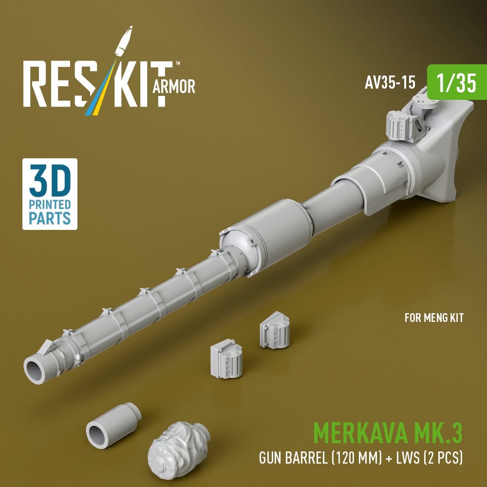 The update includes a 3D-printed 120mm smoothbore gun barrel designed to replace standard kit parts, accompanied by Laser Warning System sensors positioned on the barrel and mantlet. Two variants are offered: AV35-0015 tailored for Meng kits, and AV35-0016 for HobbyBoss kits.