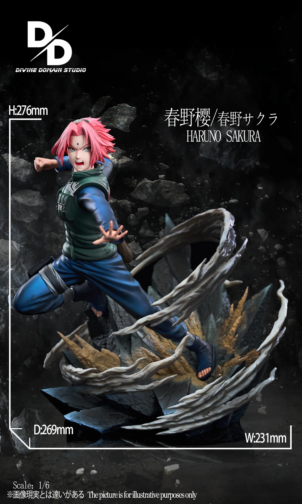 The Sakura Haruno statue is produced by Divine Domain Studio as part of the Naruto series. It is designed at 1/6 scale with estimated dimensions of approximately 23.1 cm in width, 26.9 cm in depth, and 27.6 cm in height. Material and final weight details have yet to be confirmed, and the statue does not include LED features.