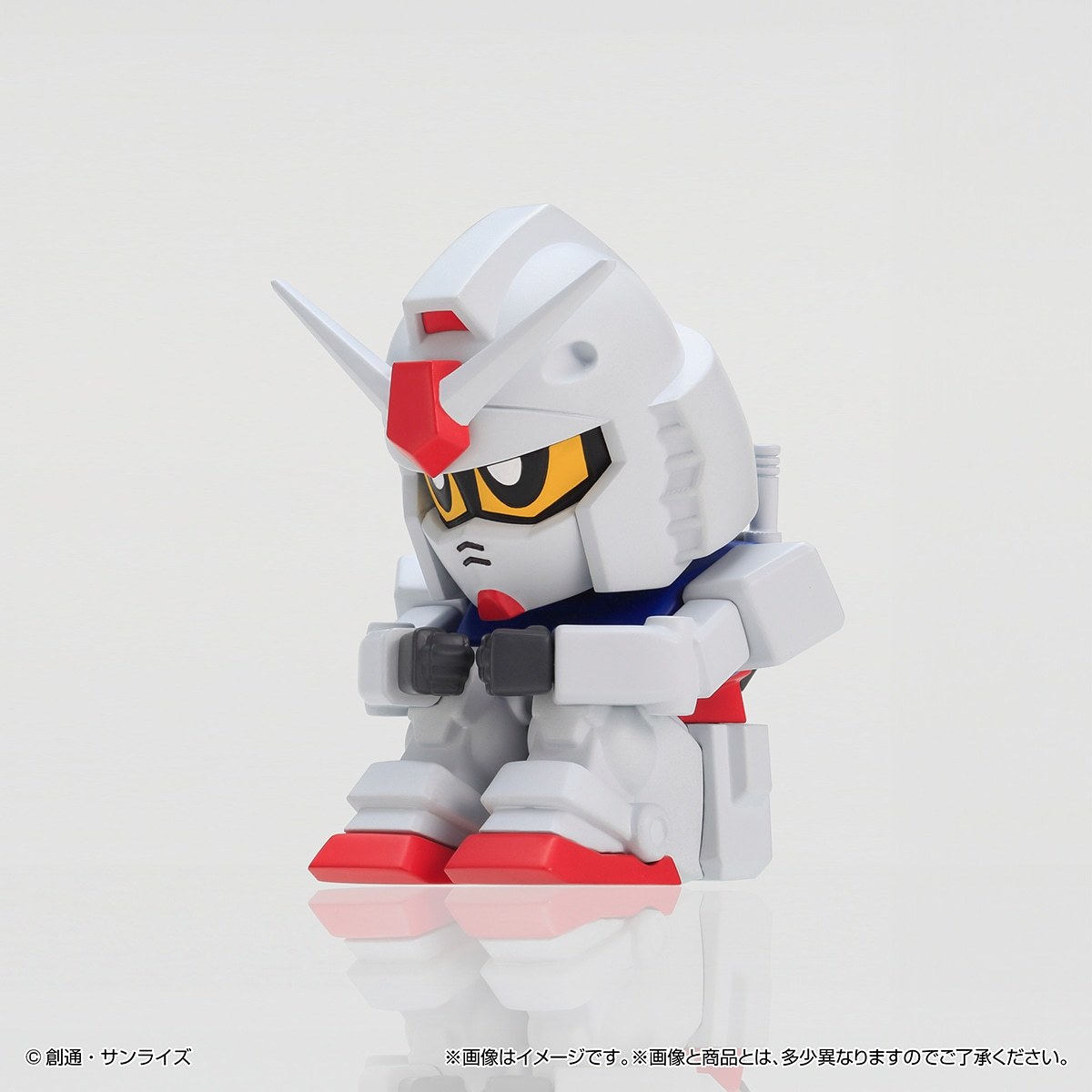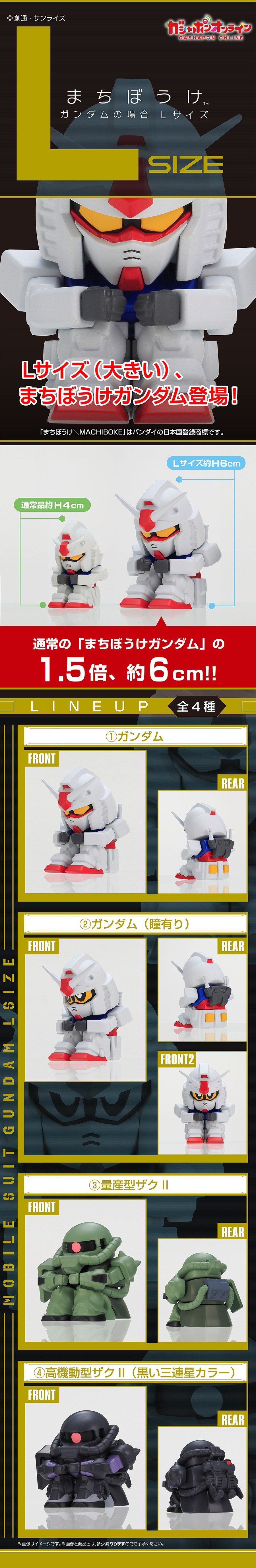 The Machibouke Gundam line reinterprets mobile suits in a chibi-style, two-head-tall proportion, depicting them seated with knees drawn up as if waiting for deployment. The new L Size format enhances their display presence while retaining the same restrained, static pose that defines the series. The lineup consists of four variants: the RX-78 Gundam, an eye-visible Gundam version, the Mass Production Zaku II, and the High Mobility Zaku II in the Black Tri-Stars colour scheme.