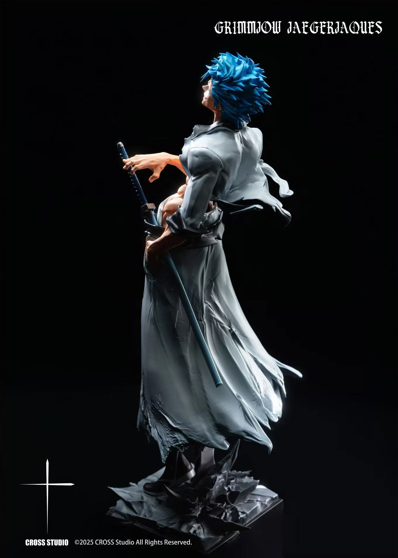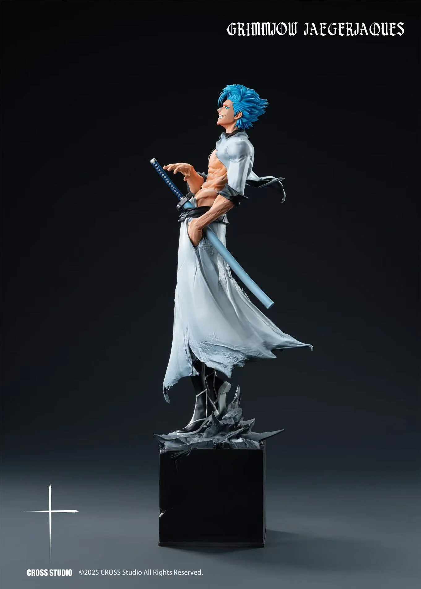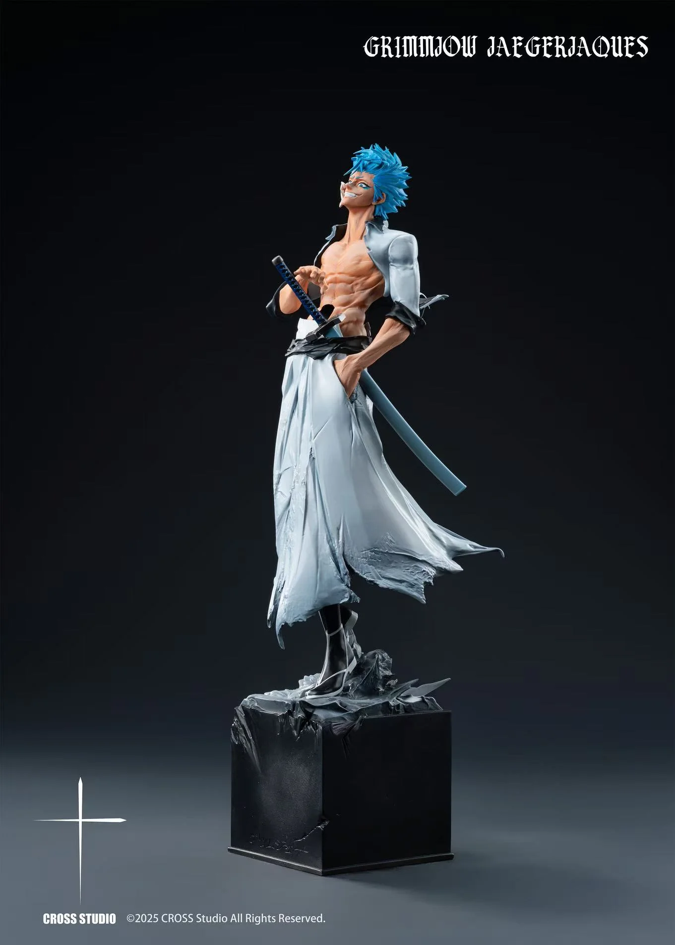 Cross Studio unveils its 1/6 scale statue of Grimmjow Jaegerjaquez from Bleach, recreating the Sixth Espada with a focus on accuracy and presence. The statue portrays Grimmjow in his signature battle stance, dressed in his white Arrancar uniform with open chest design and exposed mask fragment on his right cheek. His posture captures the poised readiness often seen before combat, complemented by the fine sculpting of muscle definition, folds of clothing, and the texture of his hakama and footwear.