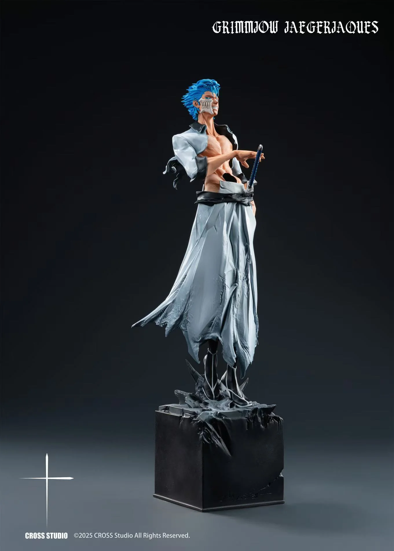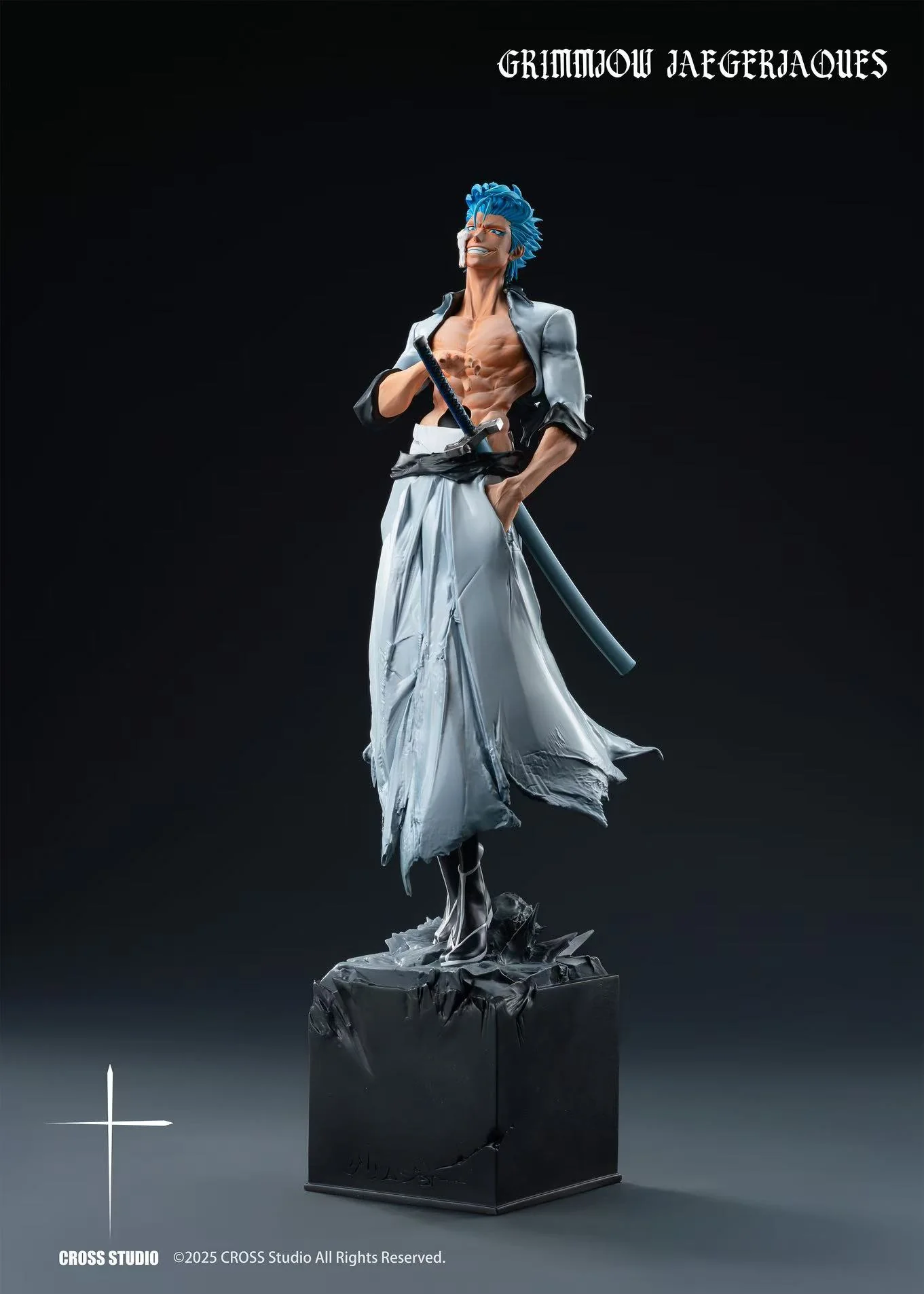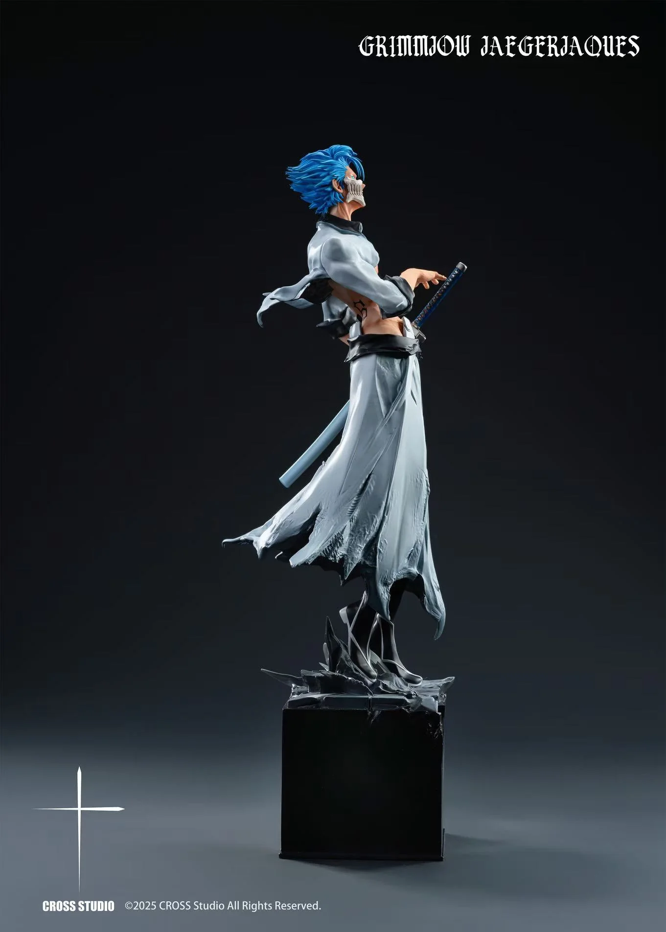 Cross Studio unveils its 1/6 scale statue of Grimmjow Jaegerjaquez from Bleach, recreating the Sixth Espada with a focus on accuracy and presence. The statue portrays Grimmjow in his signature battle stance, dressed in his white Arrancar uniform with open chest design and exposed mask fragment on his right cheek. His posture captures the poised readiness often seen before combat, complemented by the fine sculpting of muscle definition, folds of clothing, and the texture of his hakama and footwear.