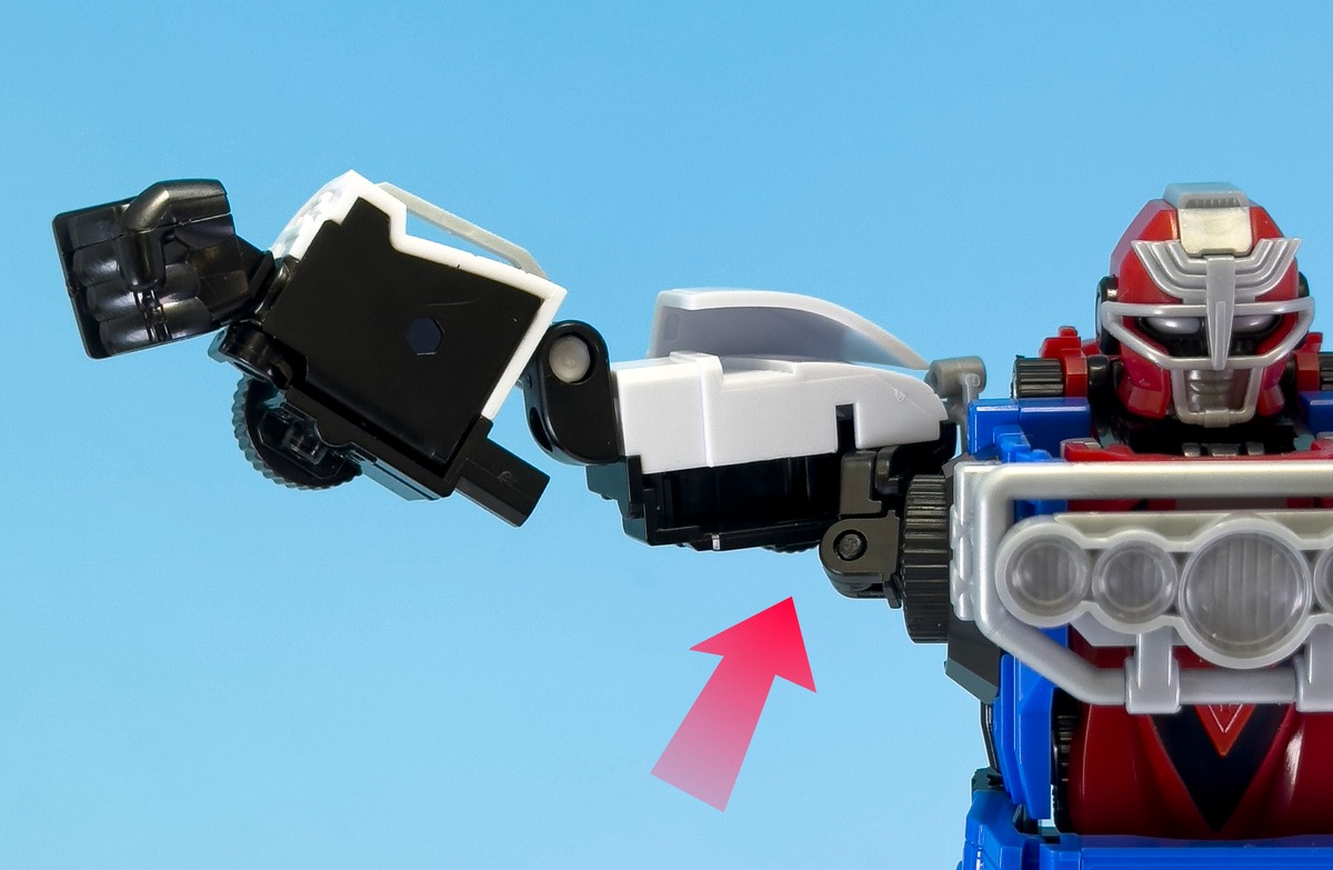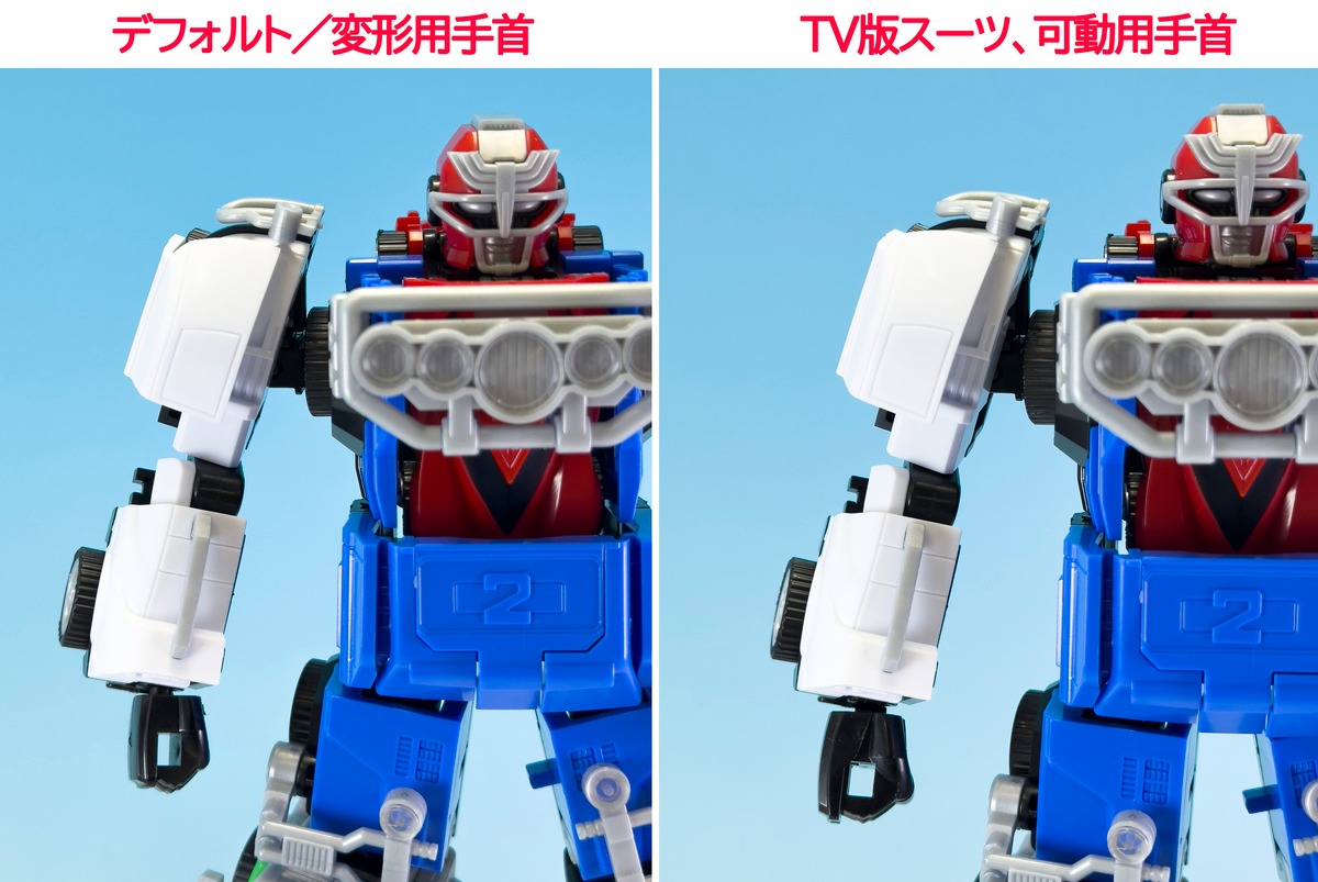 Modern engineering introduces pull-out joint mechanisms in the shoulders, hips and ankles, significantly increasing articulation compared to the vintage DX toy. This allows dynamic posing with the included RV劍 and 徑向盾牌, including running stances, spinning attack poses and the characteristic high kneeling pose following the execution of 激走斬. A newly designed thigh connection system offers two selectable configurations: a screen-accurate standing mode and a DX toy-style stance. When set to the DX configuration, the lower legs shift outward along the central axis to recreate the retro toy silhouette.