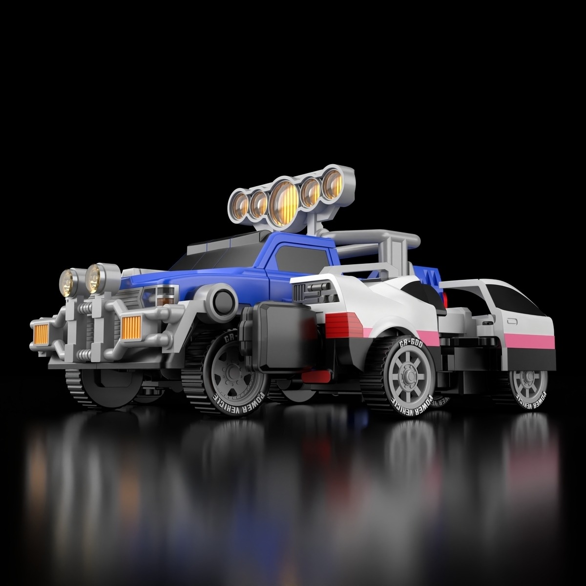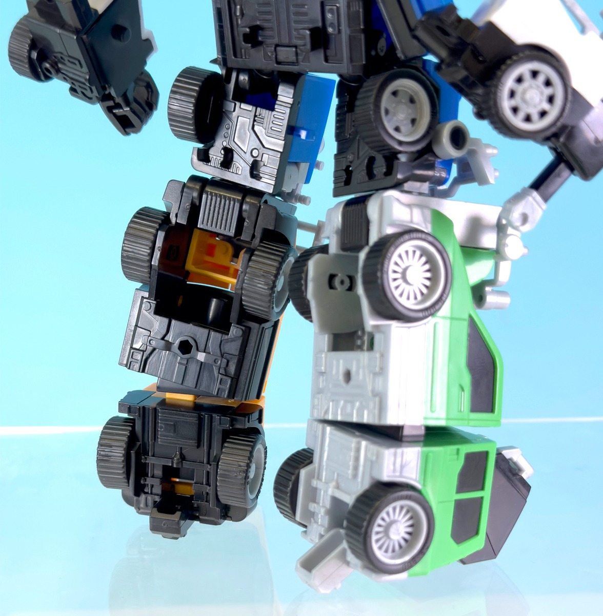 The kit includes all five Ranger vehicles in colour-separated moulded parts, supplemented by stickers for detailing. The sculpting reproduces both the front-facing proportions and rear undercarriage detailing, including the distinctive black vehicle base sections visible from behind. The combination mechanism closely mirrors the on-screen structure while maintaining structural stability in robot mode.