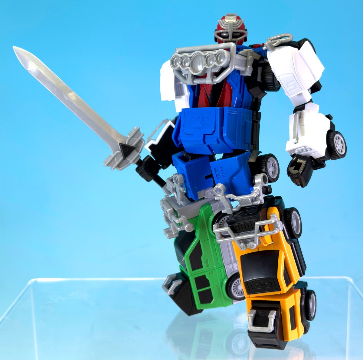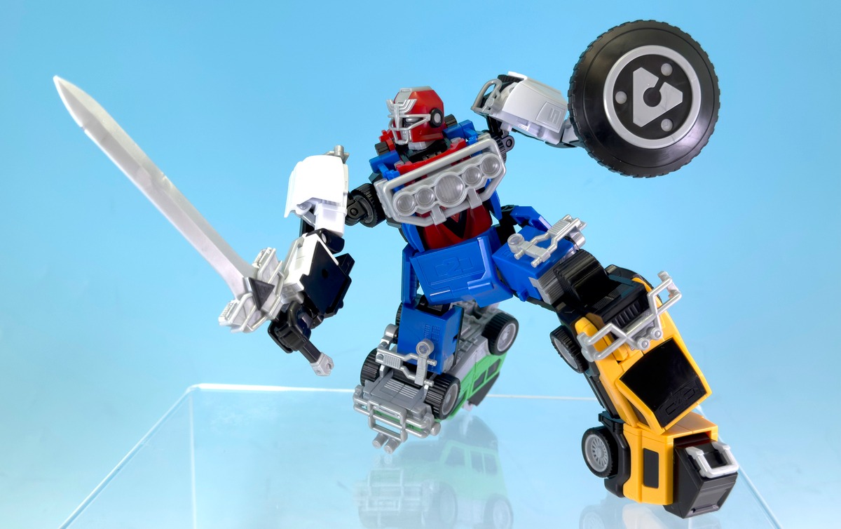 In the series, RV機器人 is formed from the red, blue, green, yellow and pink RV combat vehicles driven by the Carrangers. Through the signature “Gekisou Gattai” sequence, the five machines combine into a towering robot built to battle the giantised Bosozoku forces. The design blends vehicle styling with high-mobility combat performance, including sliding kicks, high-speed running attacks and the finishing move RV劍激走斬 performed with the RV Sword.