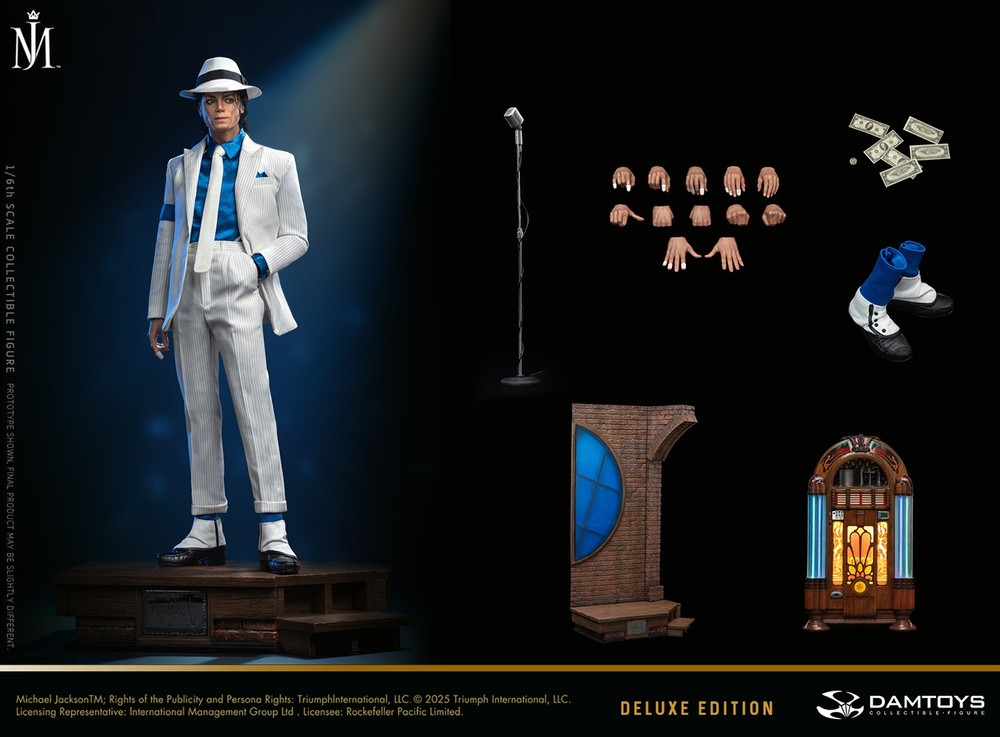 DAMTOYS has announced the DMS048 Smooth Criminal Michael Jackson Collectible Figure in both Deluxe Edition and Standard Edition formats. Both versions centre on the same core figure design, capturing Michael Jackson in his sharp white suit and signature fedora from the Smooth Criminal sequence. The releases share identical figure construction and costume tailoring, with differences focused on display elements and supplemental accessories.